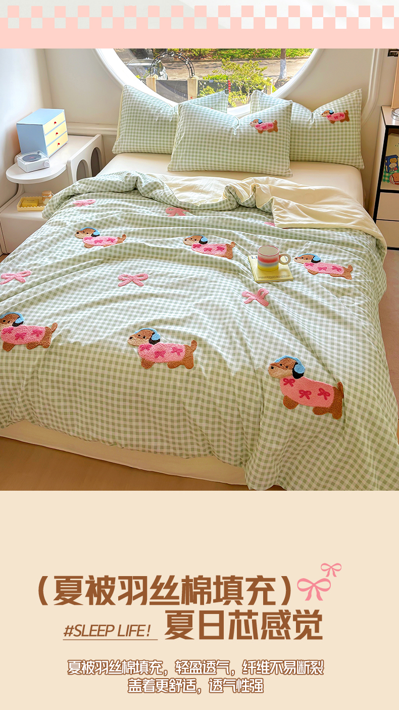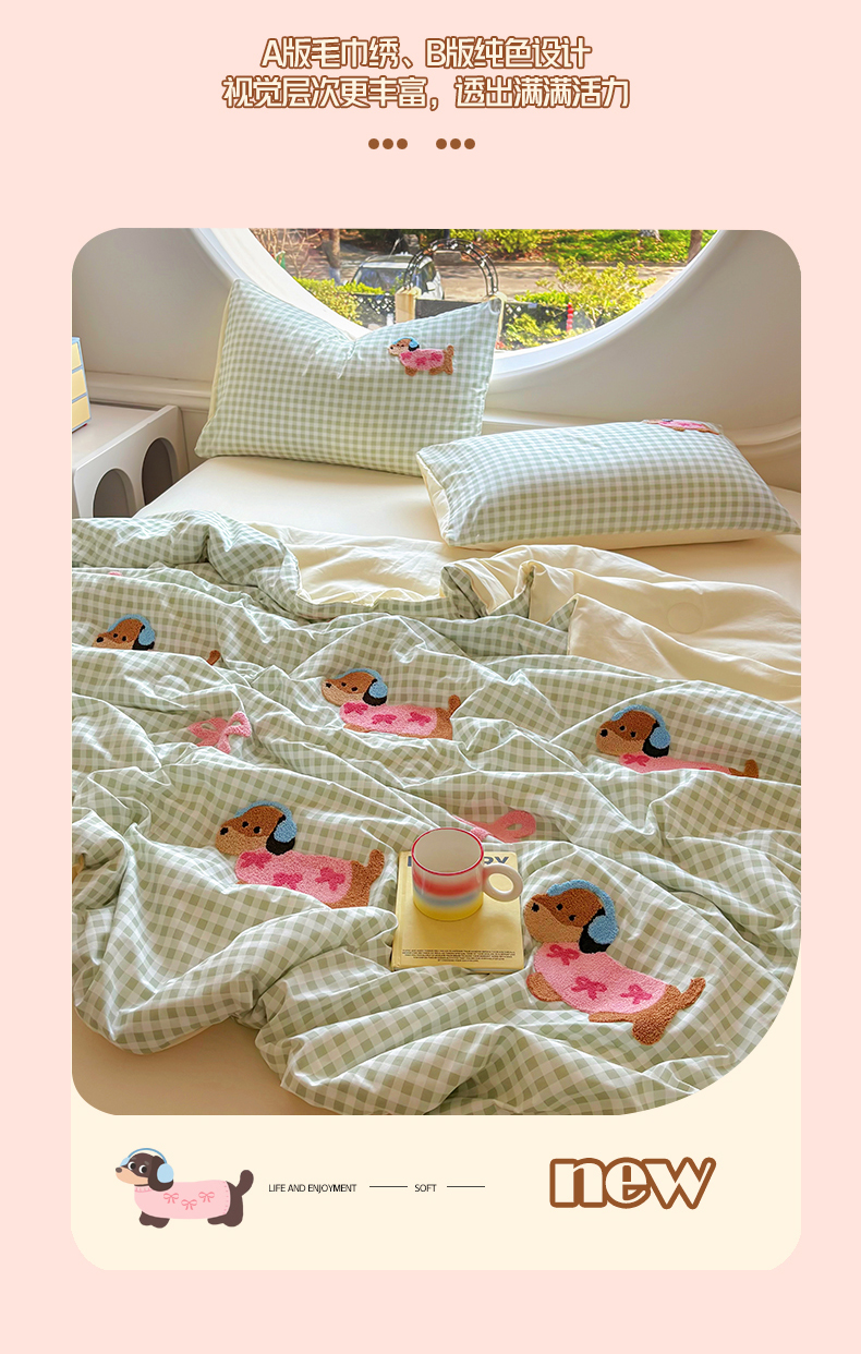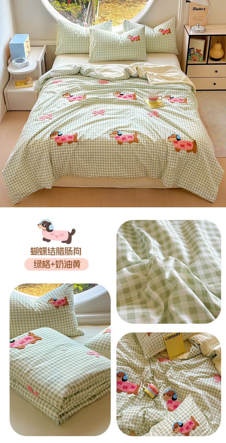 • 91家纺网 家纺一手货源 找家纺 灰鲸 2025新款云朵棉毛巾绣夏被四件套 蝴蝶结腊肠狗-绿格+奶油黄
