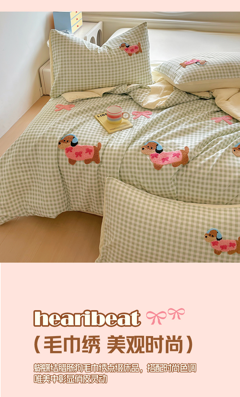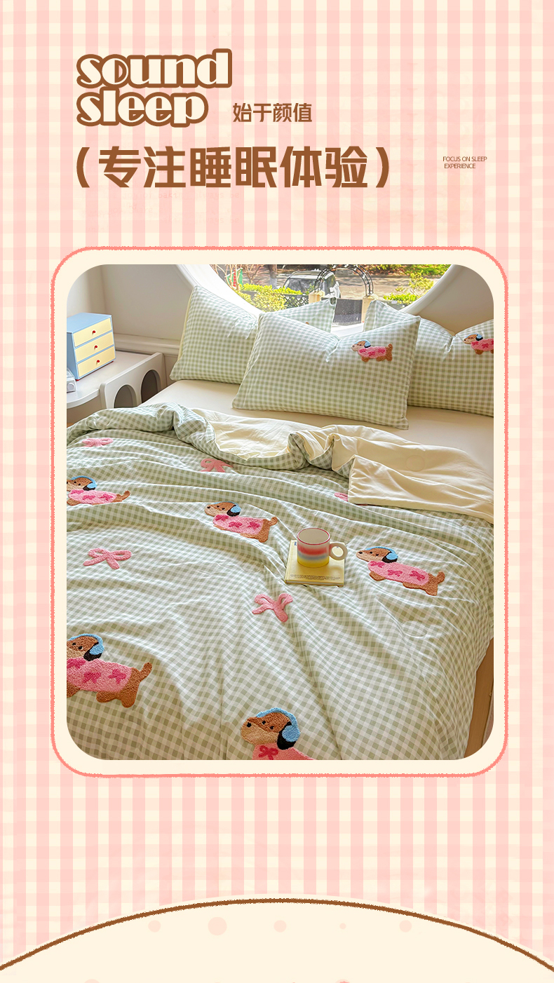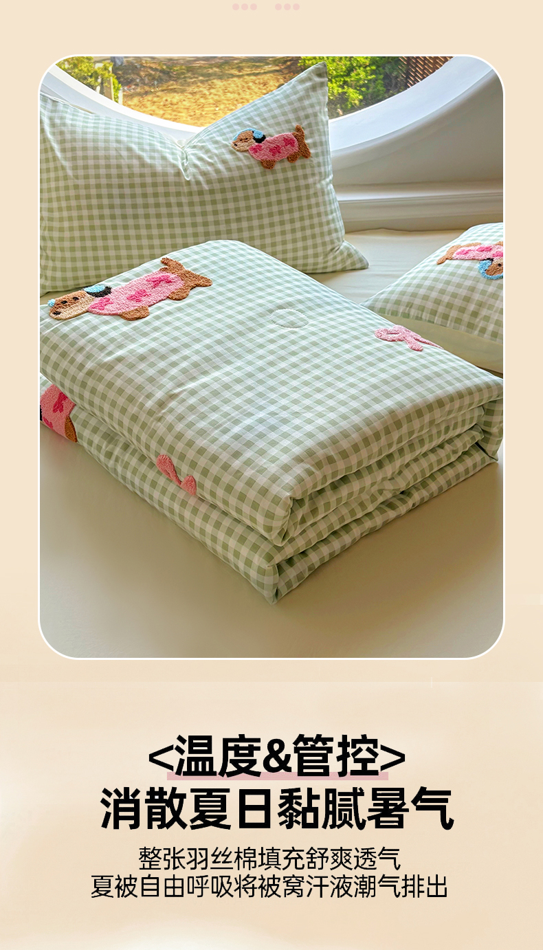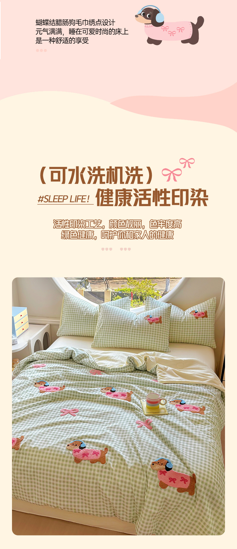• 91家纺网 家纺一手货源 找家纺 灰鲸 2025新款云朵棉毛巾绣夏被四件套 蝴蝶结腊肠狗-绿格+奶油黄