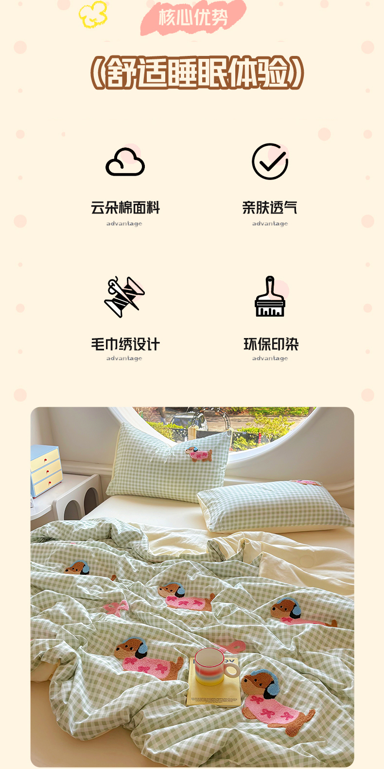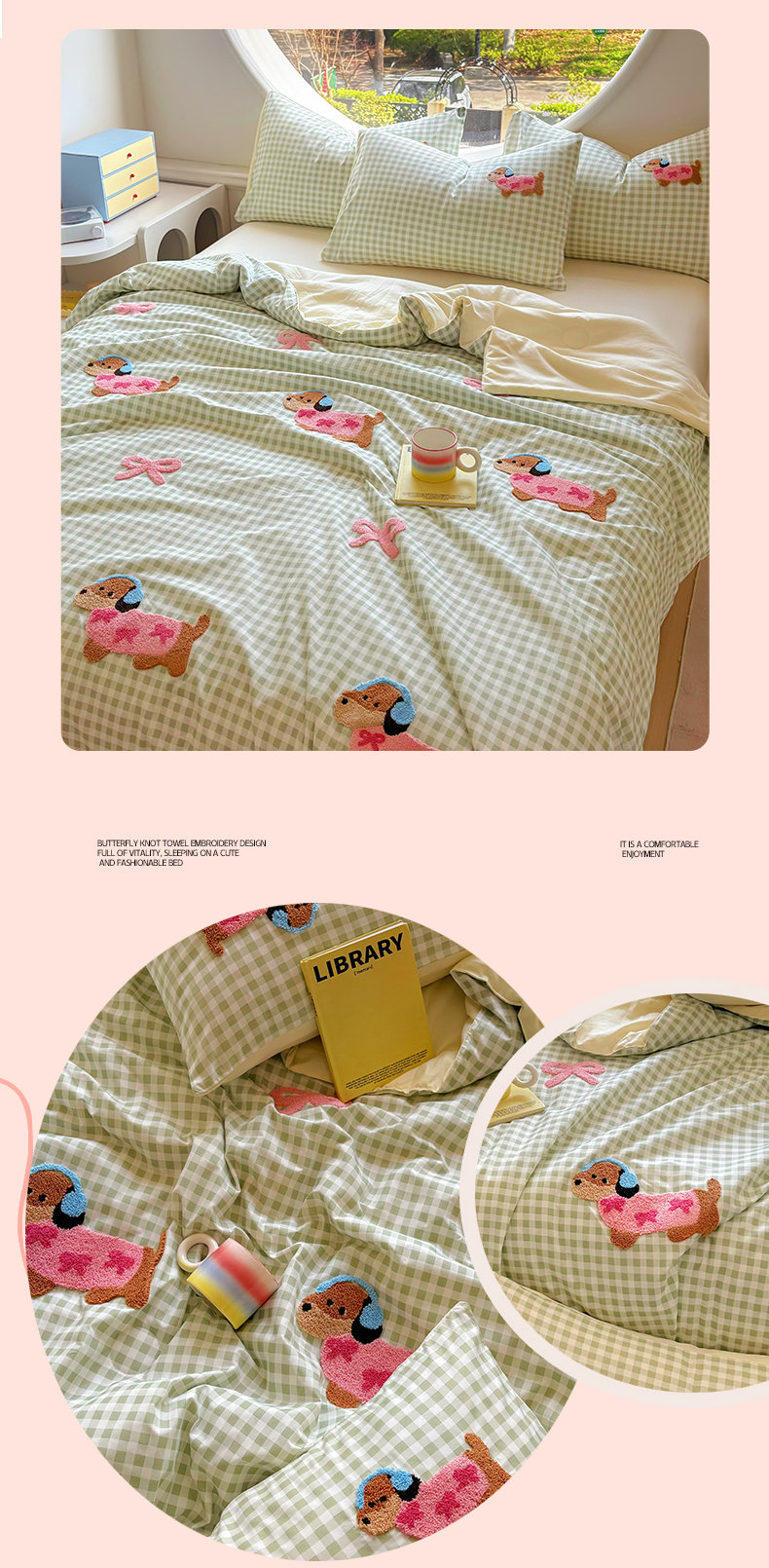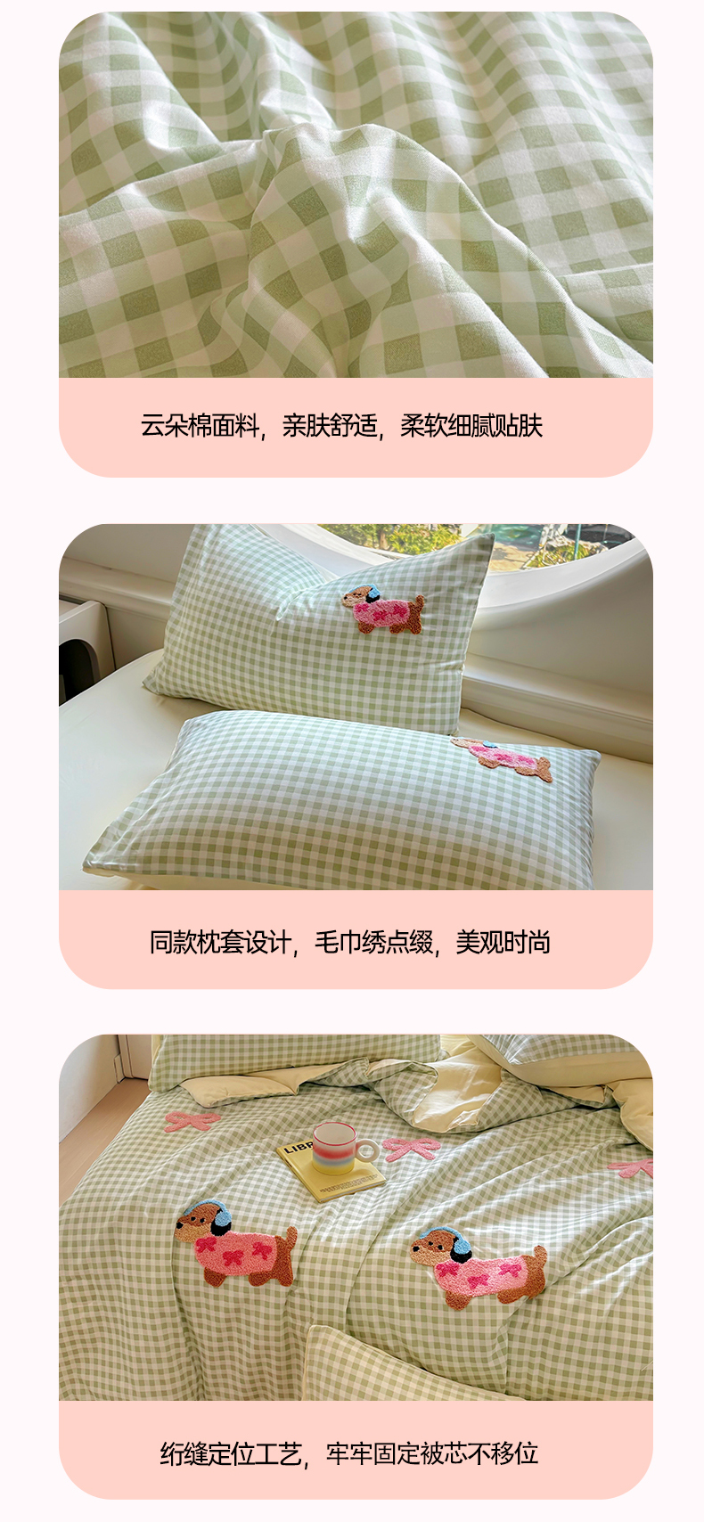 灰鲸 2025新款云朵棉毛巾绣夏被四件套 蝴蝶结腊肠狗-绿格+奶油黄