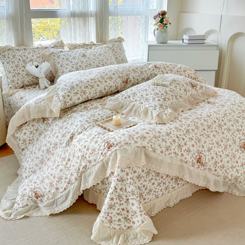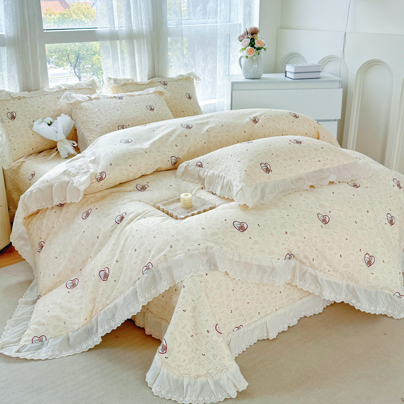 添越 2024小清新韩版蕾丝款花边纯棉夹棉床盖三件套全棉爱心熊-蕾丝款,爱心熊-蕾丝款