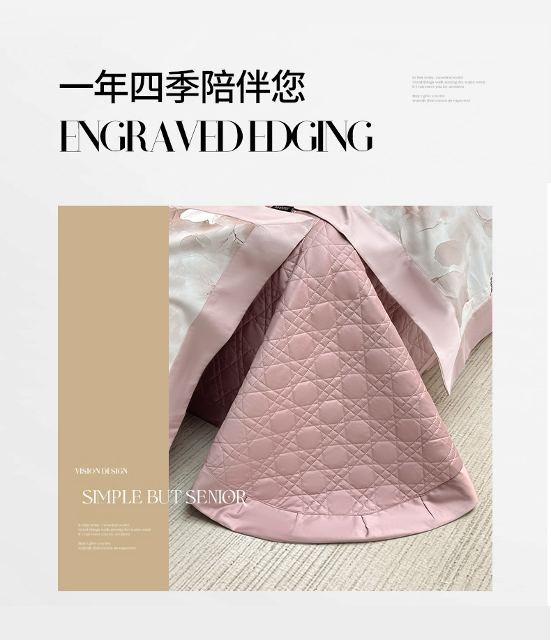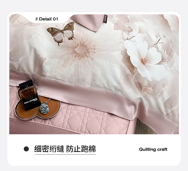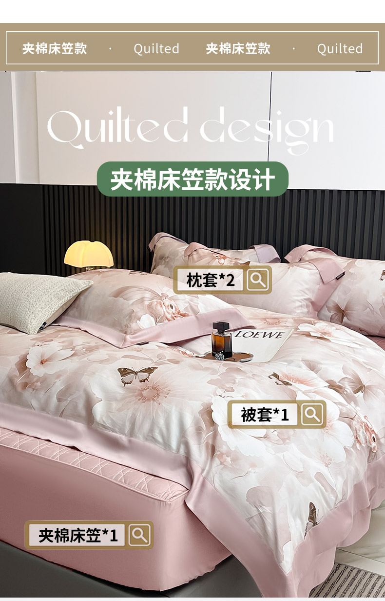 商品名称:2025A类母婴级天丝棉夹棉床盖床笠四件套全棉纯棉纯色长绒棉真丝保护罩高级感印花床上用品 蝶织梦-粉