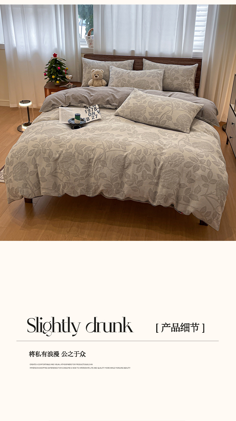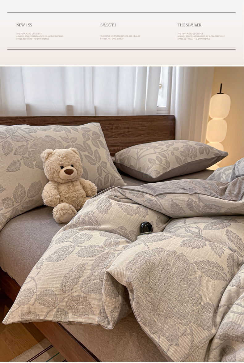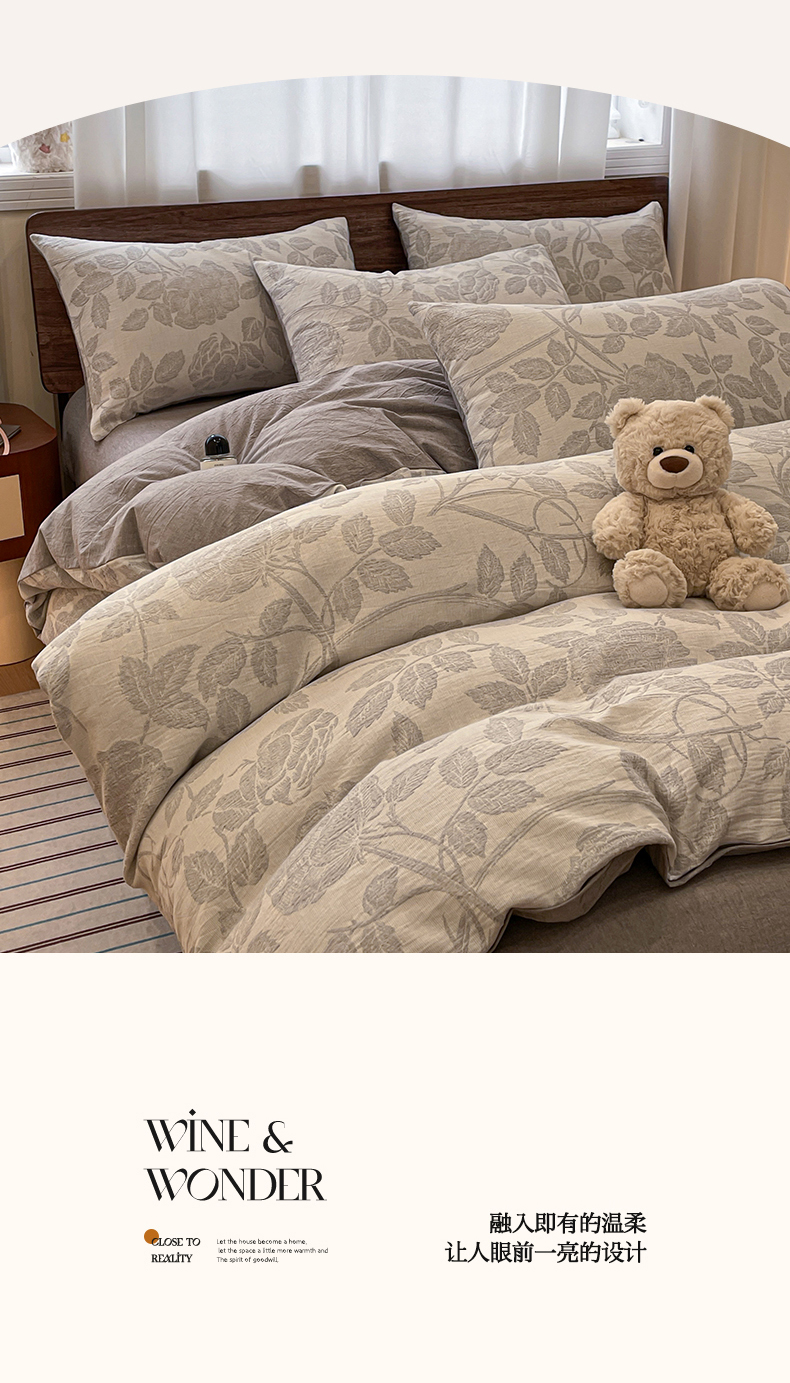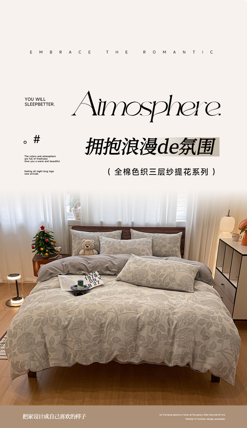 当前位置: 91家纺网 > 商品网购 > 床品套件 > 四件套 > 色织四件套 > 菡宝 2025新款a类母婴级纯棉全棉纯棉色织三层纱提花系列四件套 花想容-灰
