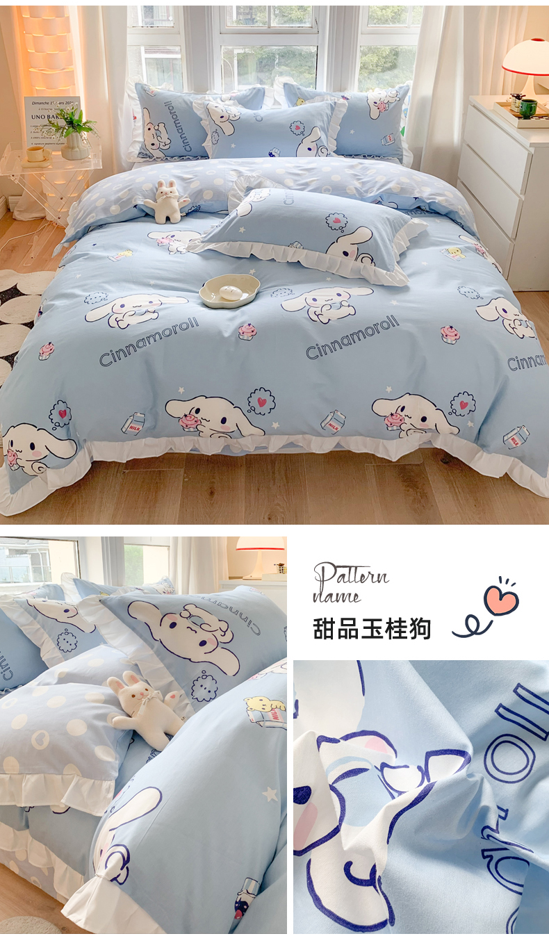 当前位置: 91家纺网 > 商品网购 > 床品套件 > 四件套 > 全棉普通四件套 > 玉元坊 2025年新款三丽鸥系列白花边被套纯棉全棉床裙三件套四件套-大耳狗系列 波点玉桂狗【花边款】