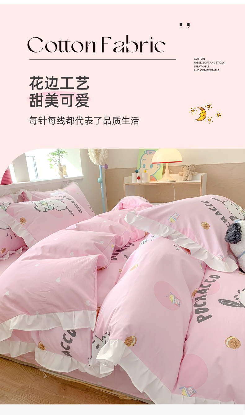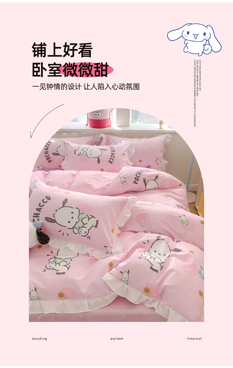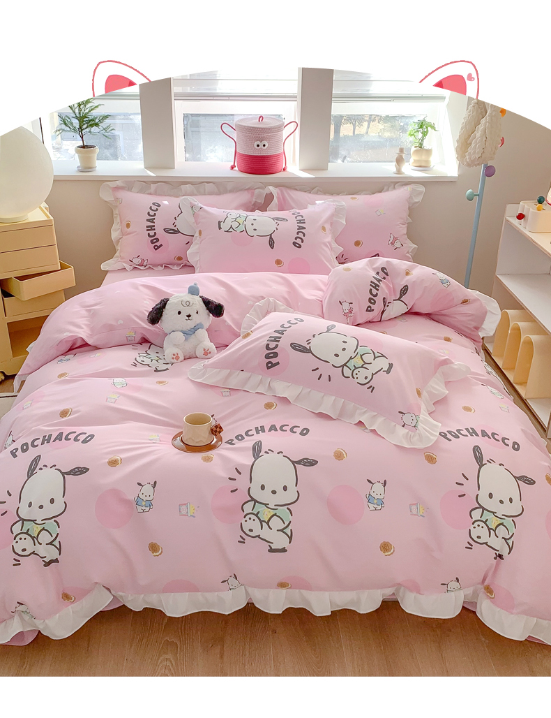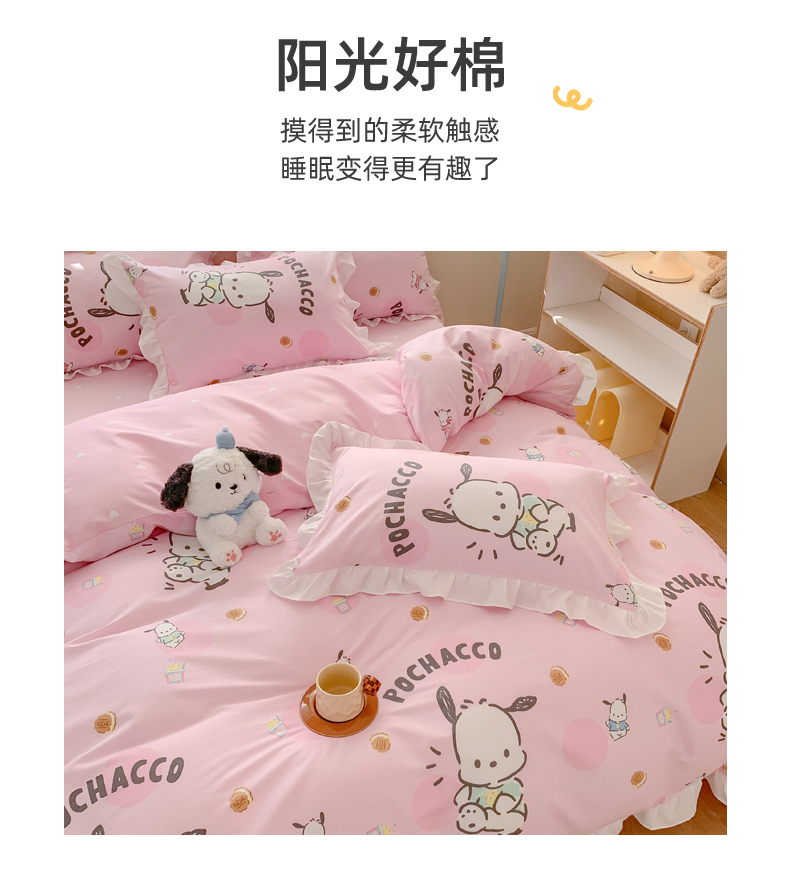 当前位置: 91家纺网 > 商品网购 > 床品套件 > 四件套 > 全棉普通四件套 > (总)玉元坊 2025年5月新品 三丽鸥花边被套全棉床单纯棉床裙床笠三四件套-帕恰狗系列