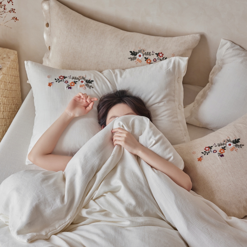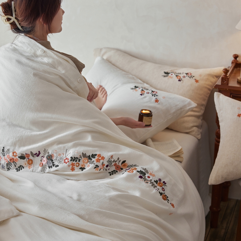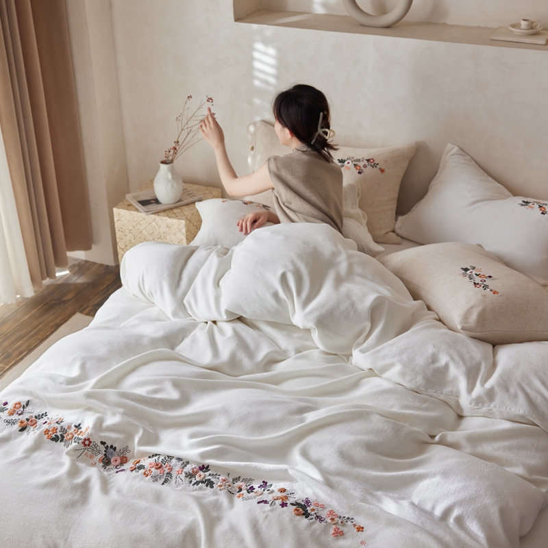 安莱生活 2025新款手工绣鲁绣天丝麻高端四件套 绣春归-本白