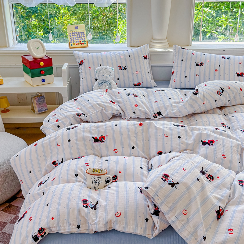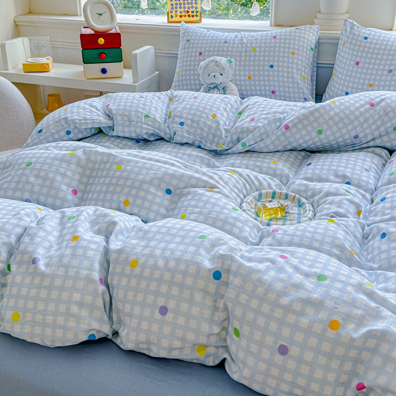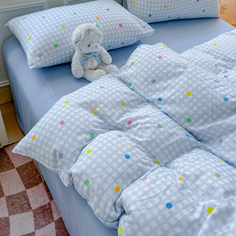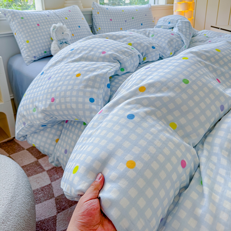 (总)感遇家纺 2025新款全棉纯棉千柔双层纱四件套,豹纹猫,豹纹猫粉,彩虹点点,风铃草,格子爱心咖,韩系蓝条,欢乐狗,蓝色小鱼,露娜,牛奶猫,青花瓷,轻奢小熊,盛夏,甜系少女,兔稚,紫樱猫语
