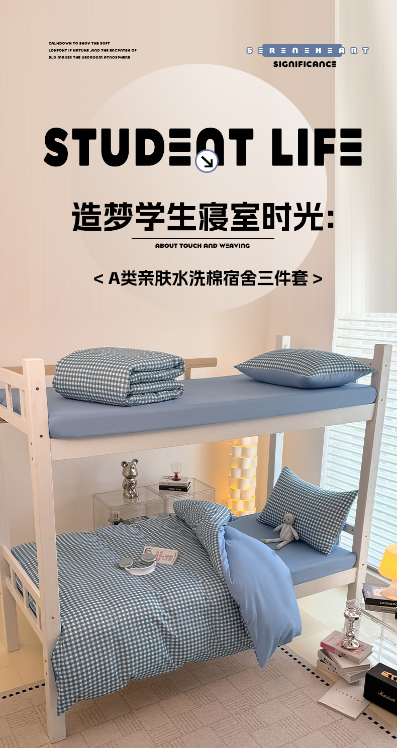 商品名称:十一家居2025年新款ins风A类亲肤水洗棉学生宿舍三件套——悸动系列 蓝小格+海青蓝