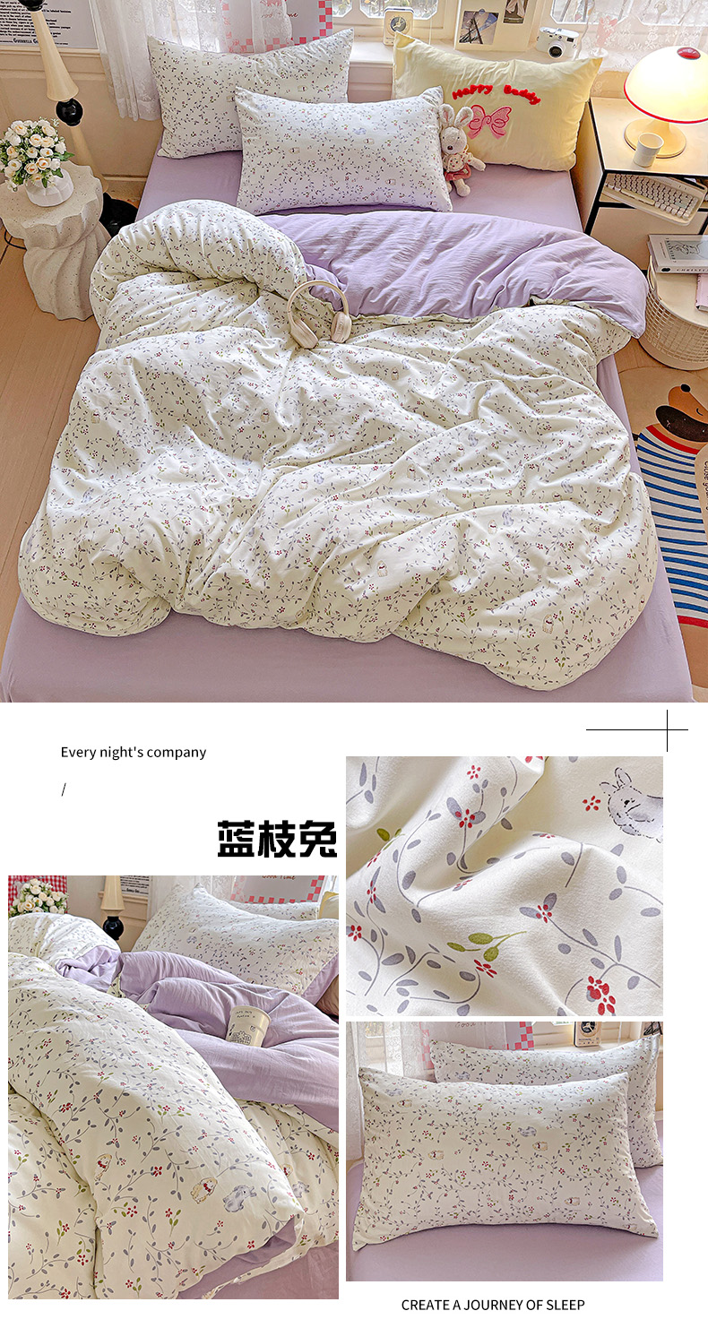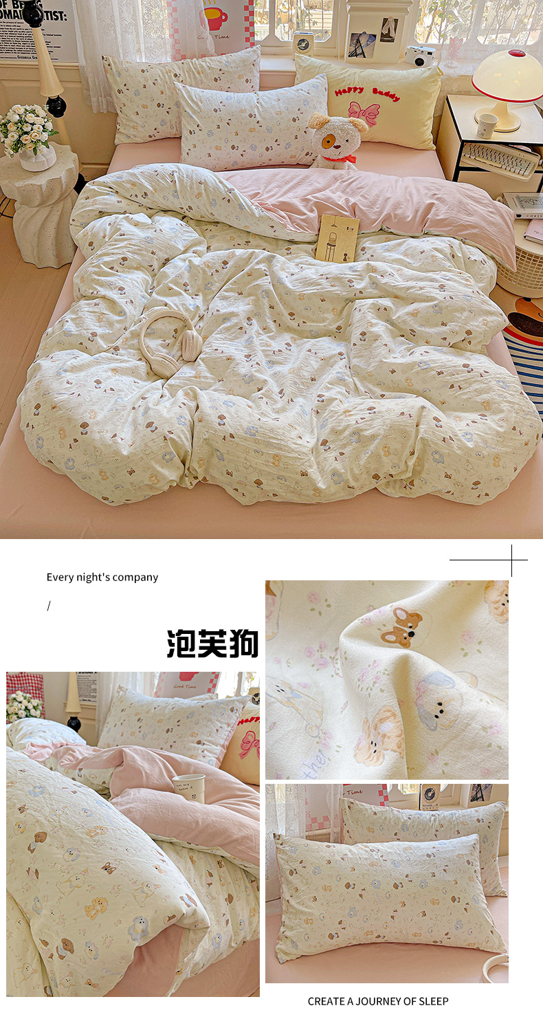 (总)布可家纺 2025新款小清新卡通时尚印花水洗棉四件套,爱心豹纹,饼干熊,可可猫咪,蓝枝兔,落日玫瑰,泡芙狗,少女日记,小狗总动员,小猫碎语