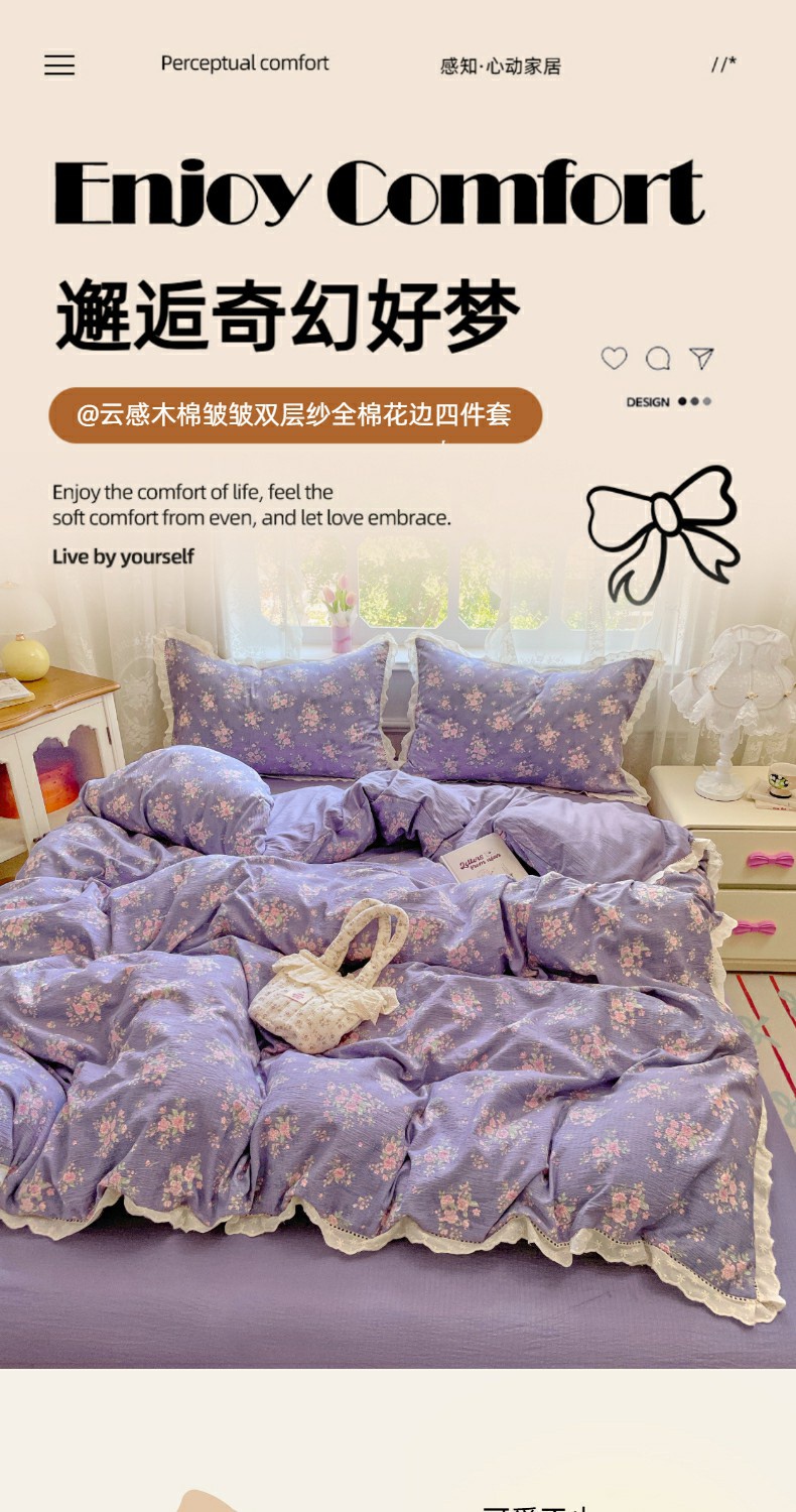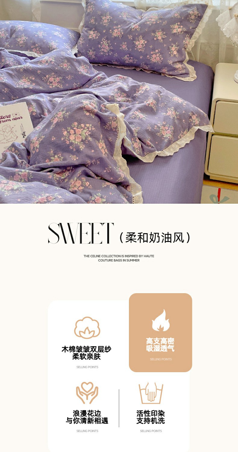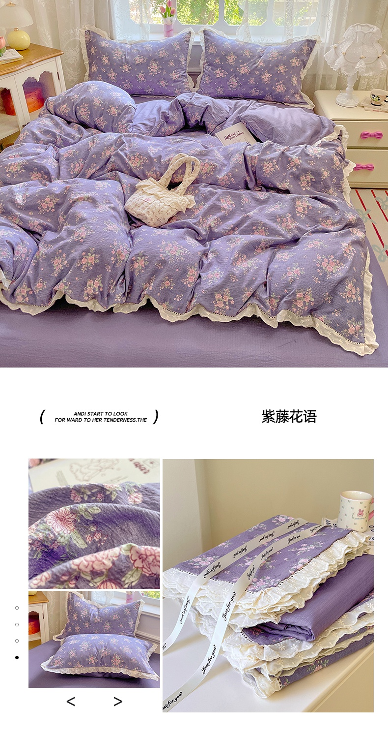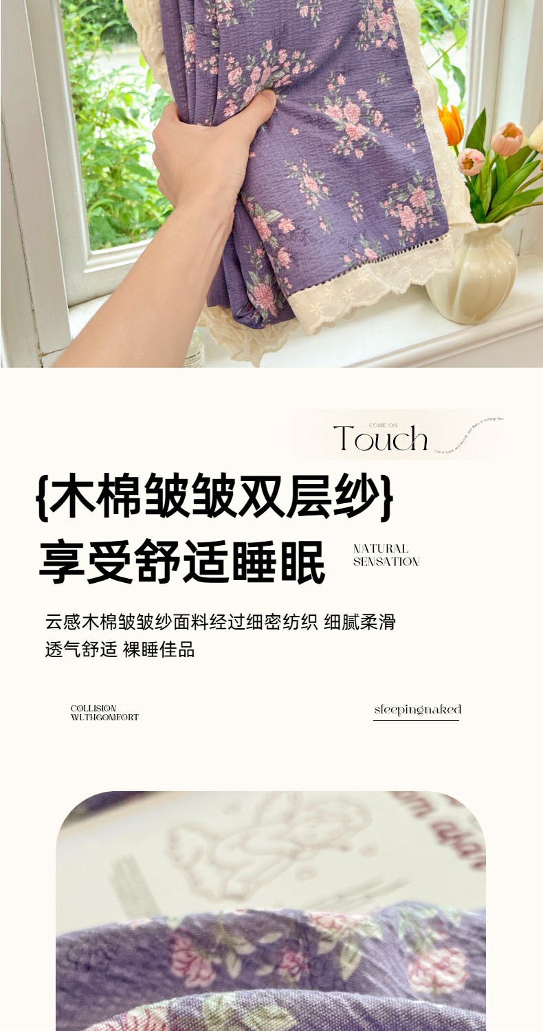 当前位置: 91家纺网 > 商品网购 > 床品套件 > 四件套 > 全棉普通四件套 > 优佳优品 2025新款A类云感木棉皱皱双层纱全棉镂空花边四件套(提供买家秀) 紫藤花语