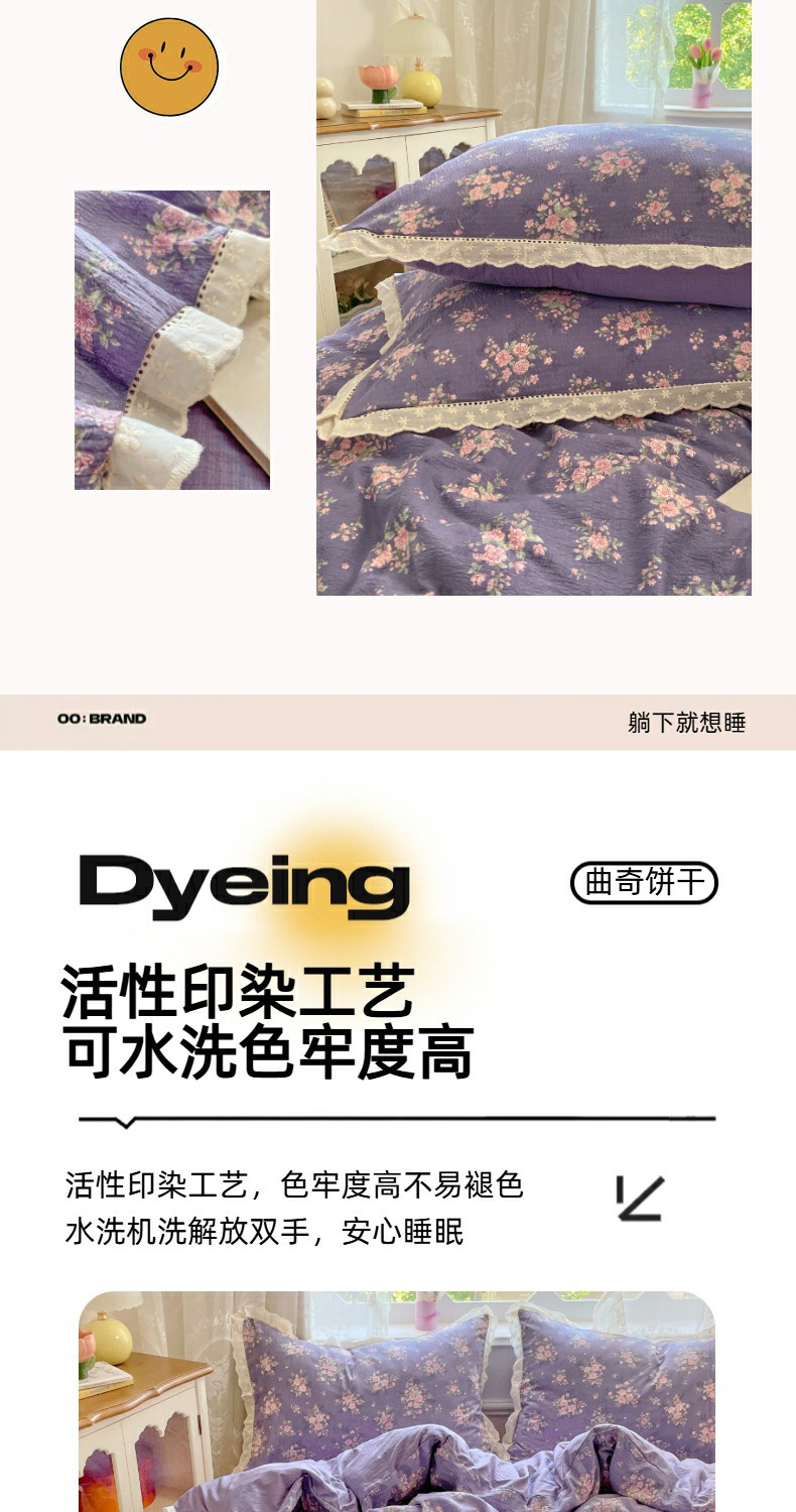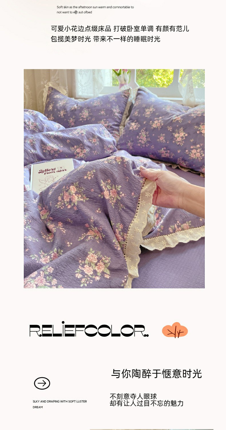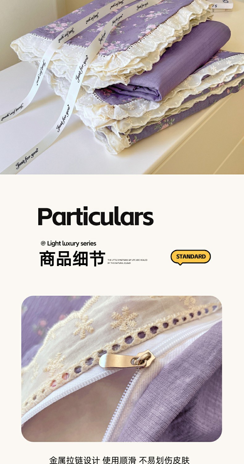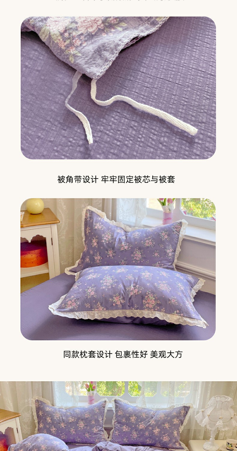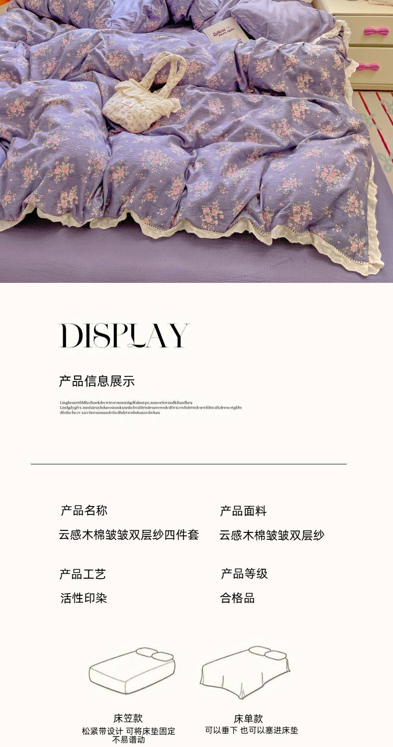 当前位置: 91家纺网 > 商品网购 > 床品套件 > 四件套 > 全棉普通四件套 > 优佳优品 2025新款A类云感木棉皱皱双层纱全棉镂空花边四件套(提供买家秀) 紫藤花语
