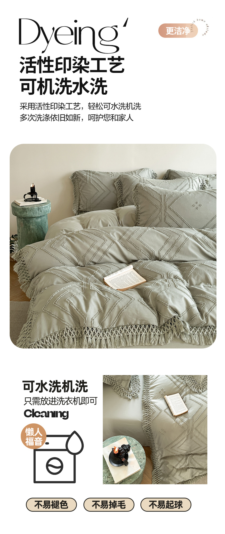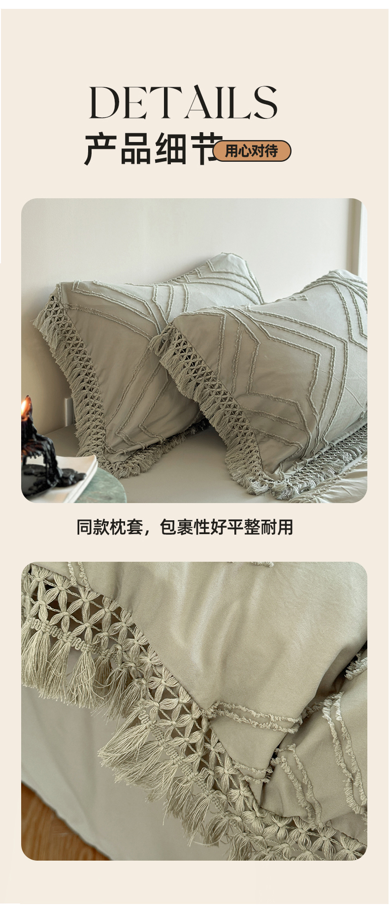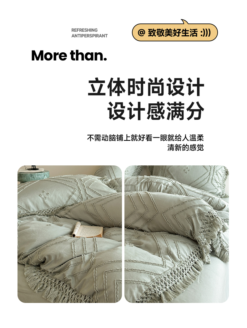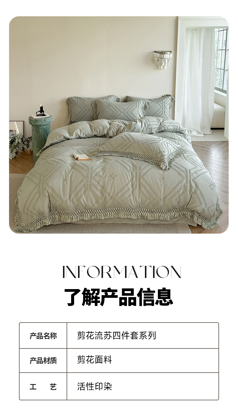 当前位置: 91家纺网 > 商品网购 > 床品套件 > 四件套 > 其它四件套 > 缘生活 2025新款素色简约立体剪花流苏四件套 剪花大方格+流苏旧绿