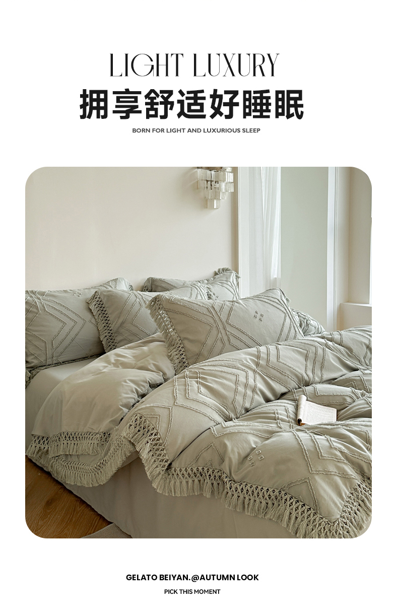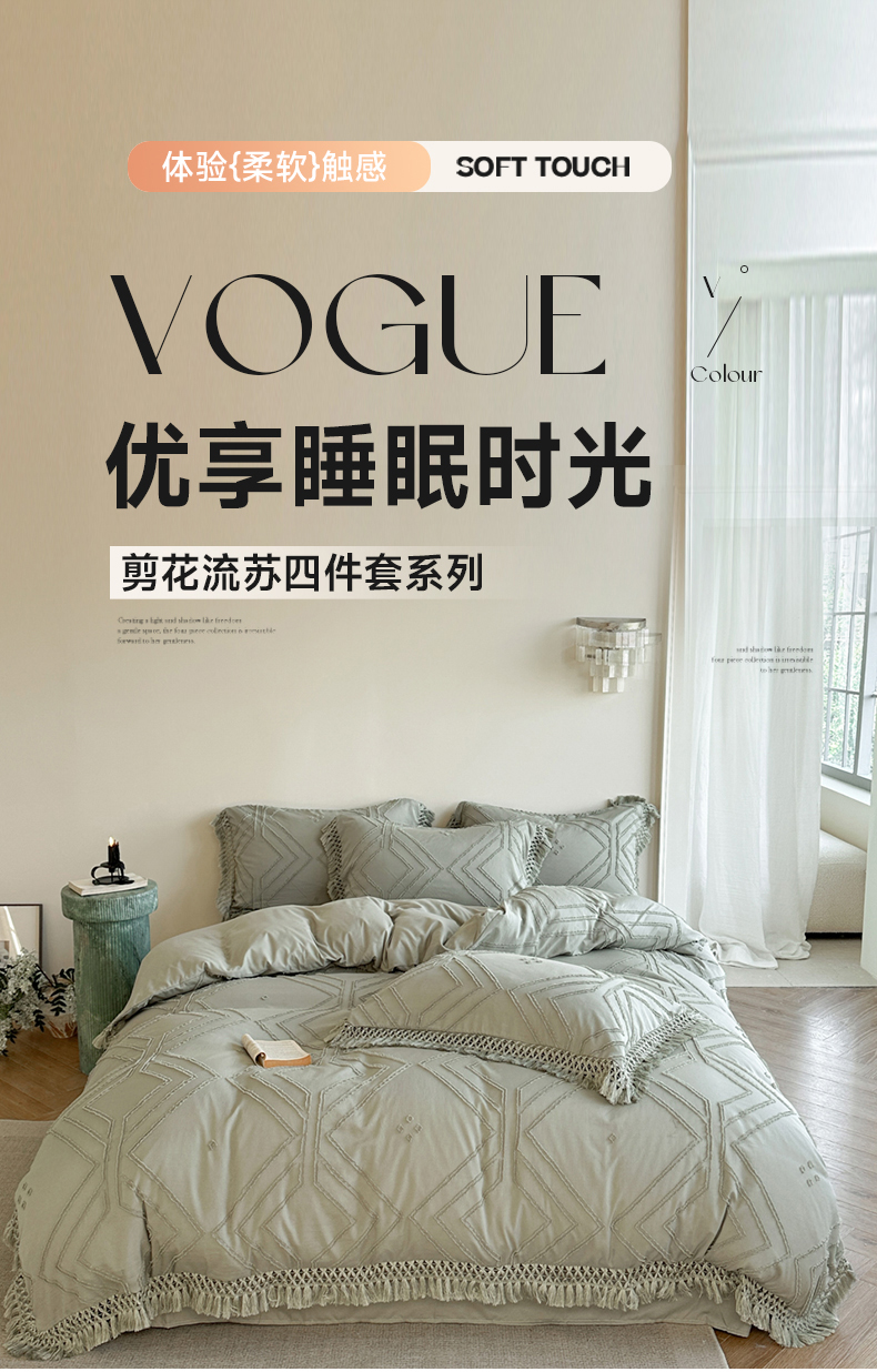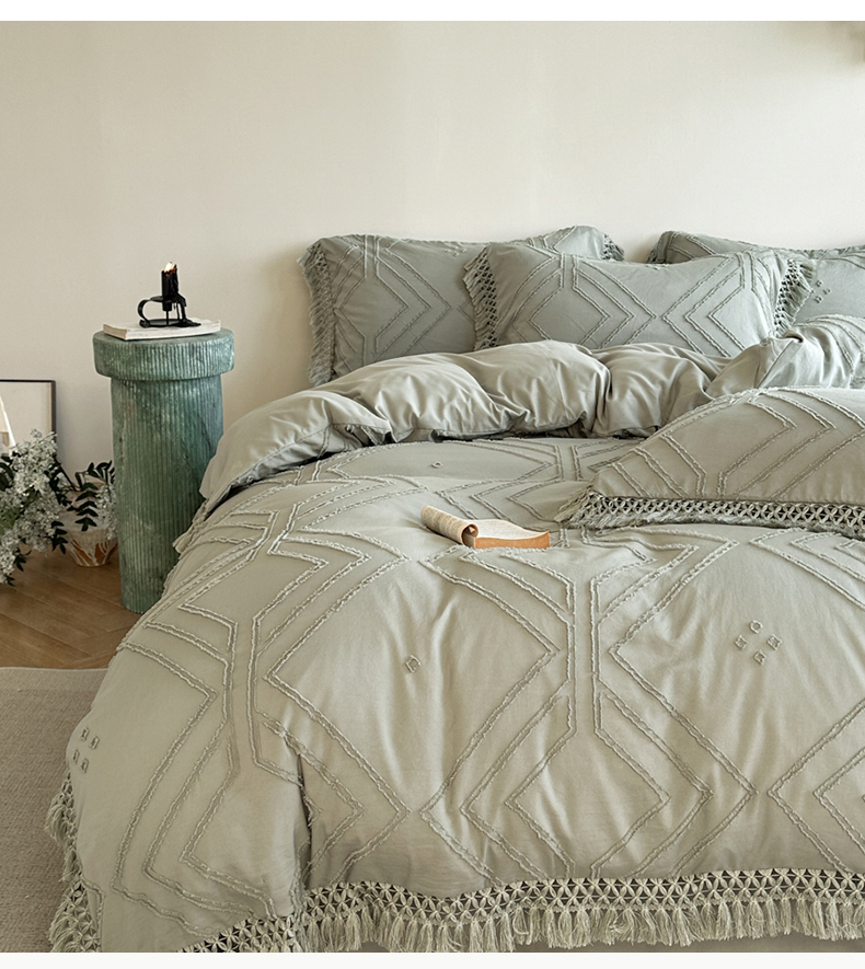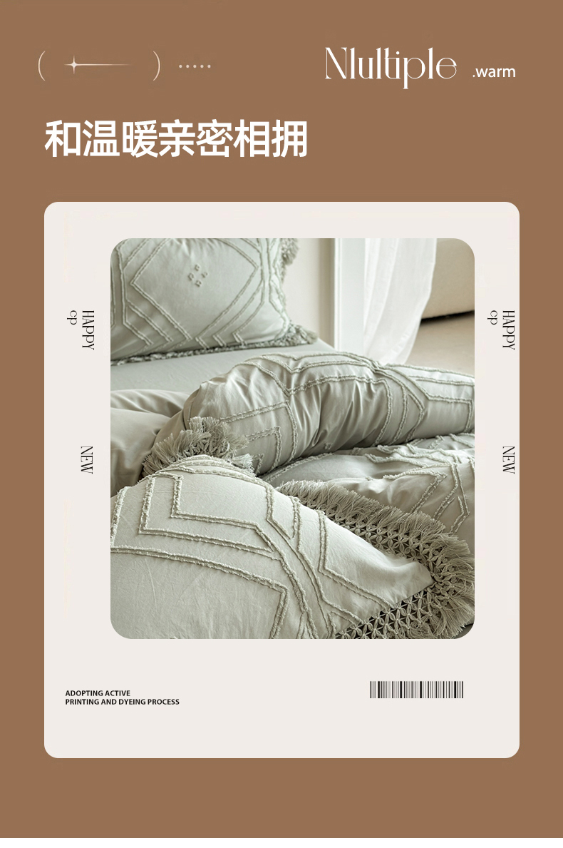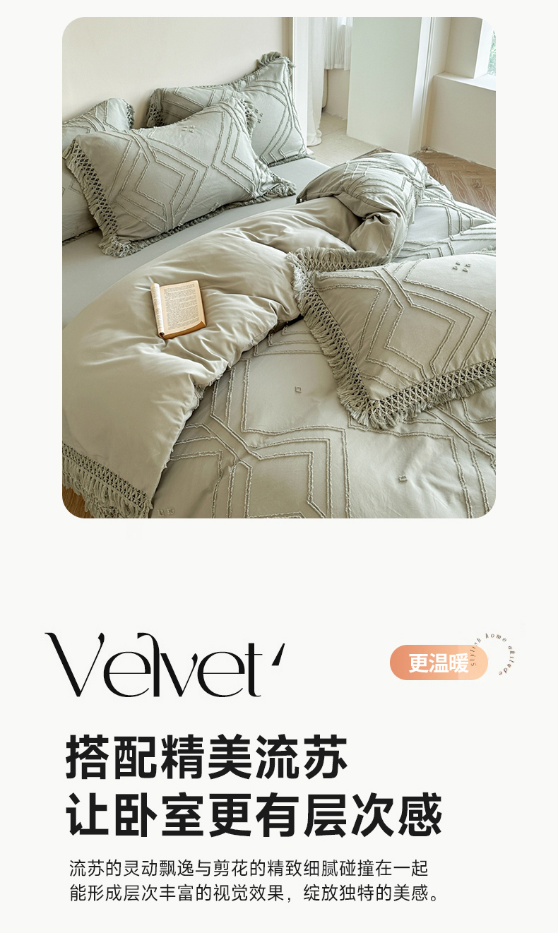 当前位置: 91家纺网 > 商品网购 > 床品套件 > 四件套 > 其它四件套 > 缘生活 2025新款素色简约立体剪花流苏四件套 剪花大方格+流苏旧绿