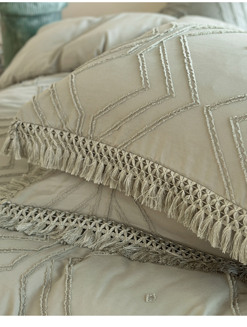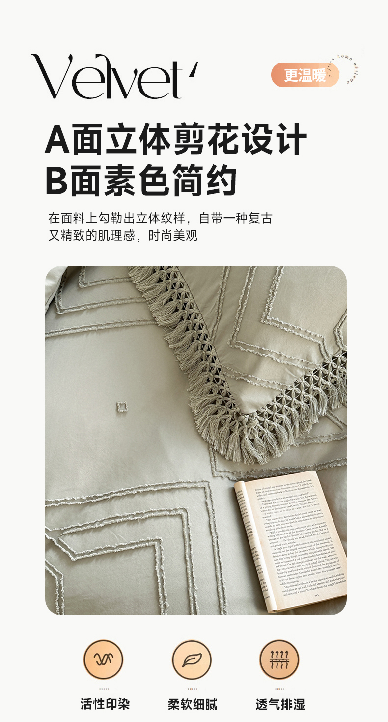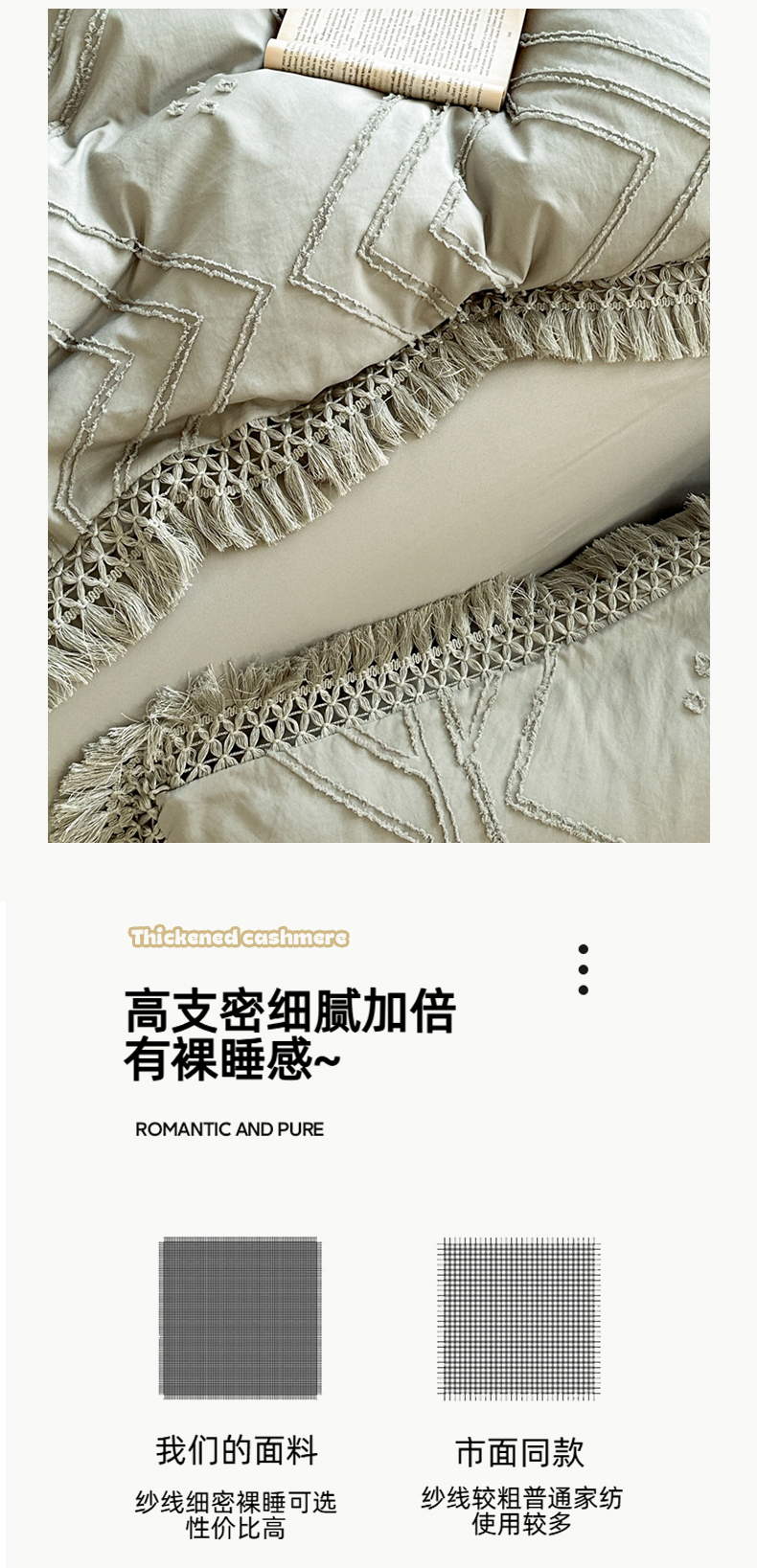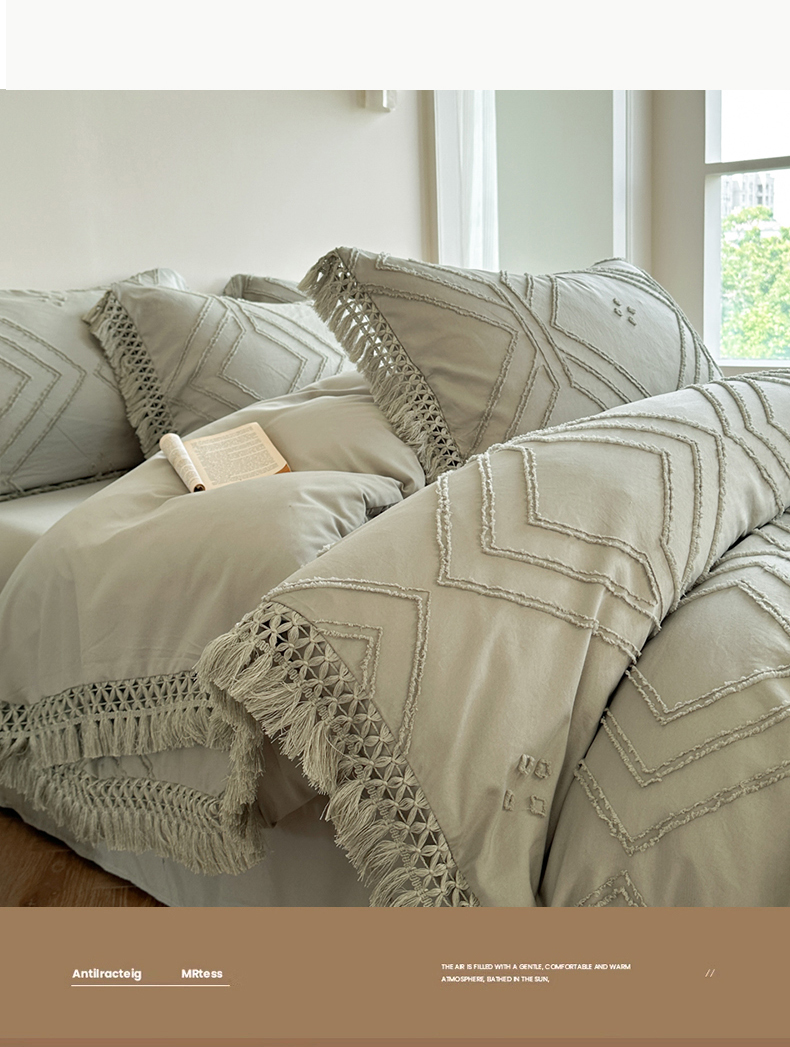 当前位置: 91家纺网 > 商品网购 > 床品套件 > 四件套 > 其它四件套 > 缘生活 2025新款素色简约立体剪花流苏四件套 剪花大方格+流苏旧绿