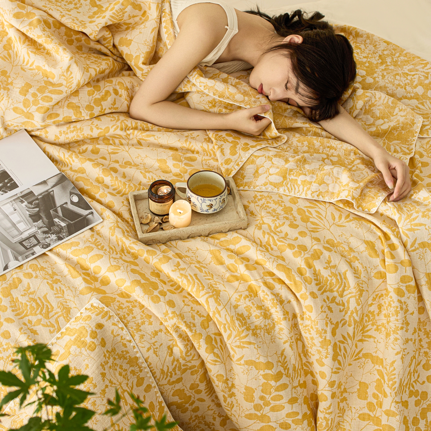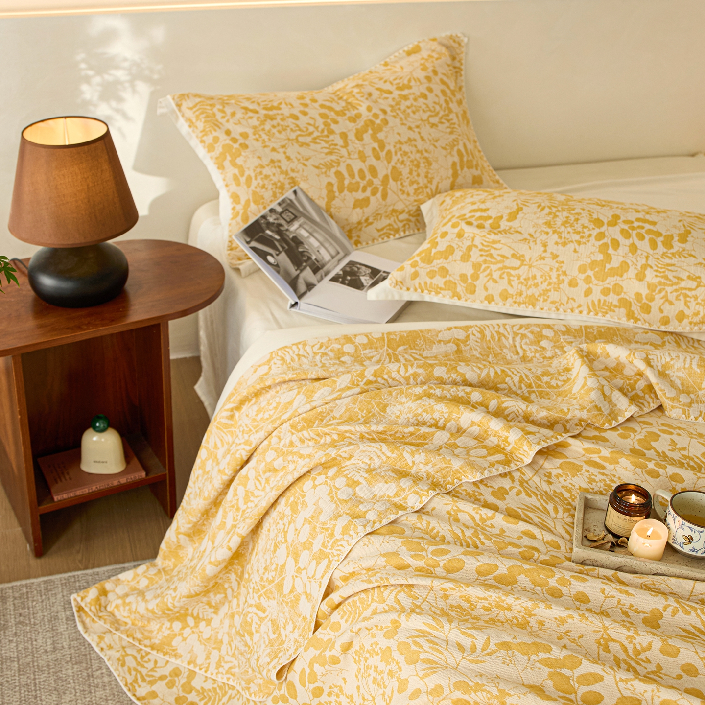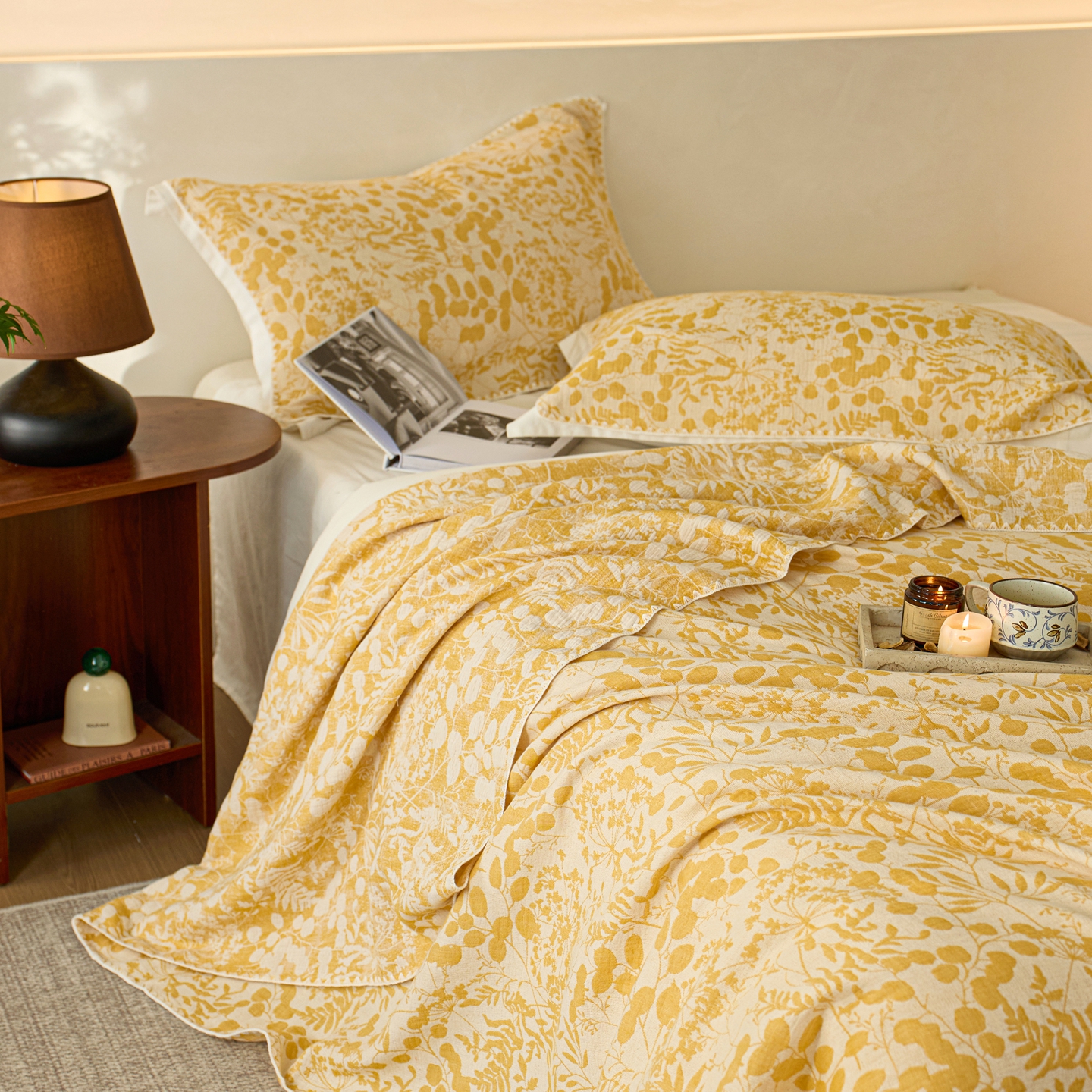 安莱生活2025新款双层纱多功能盖毯床盖三件套 新栀子花-黄