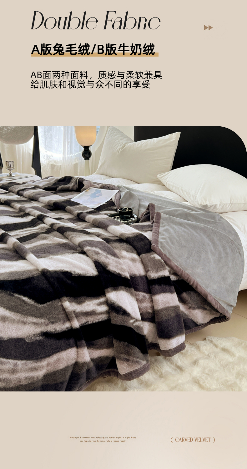 锦润家纺 2025新款高克重多功能兔毛绒包边毛毯毯子 灰斑马纹