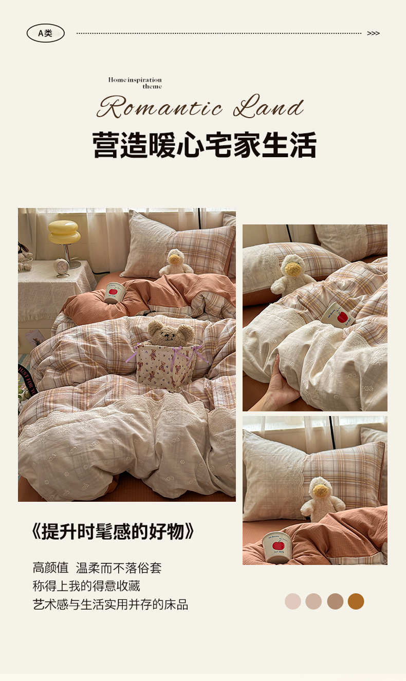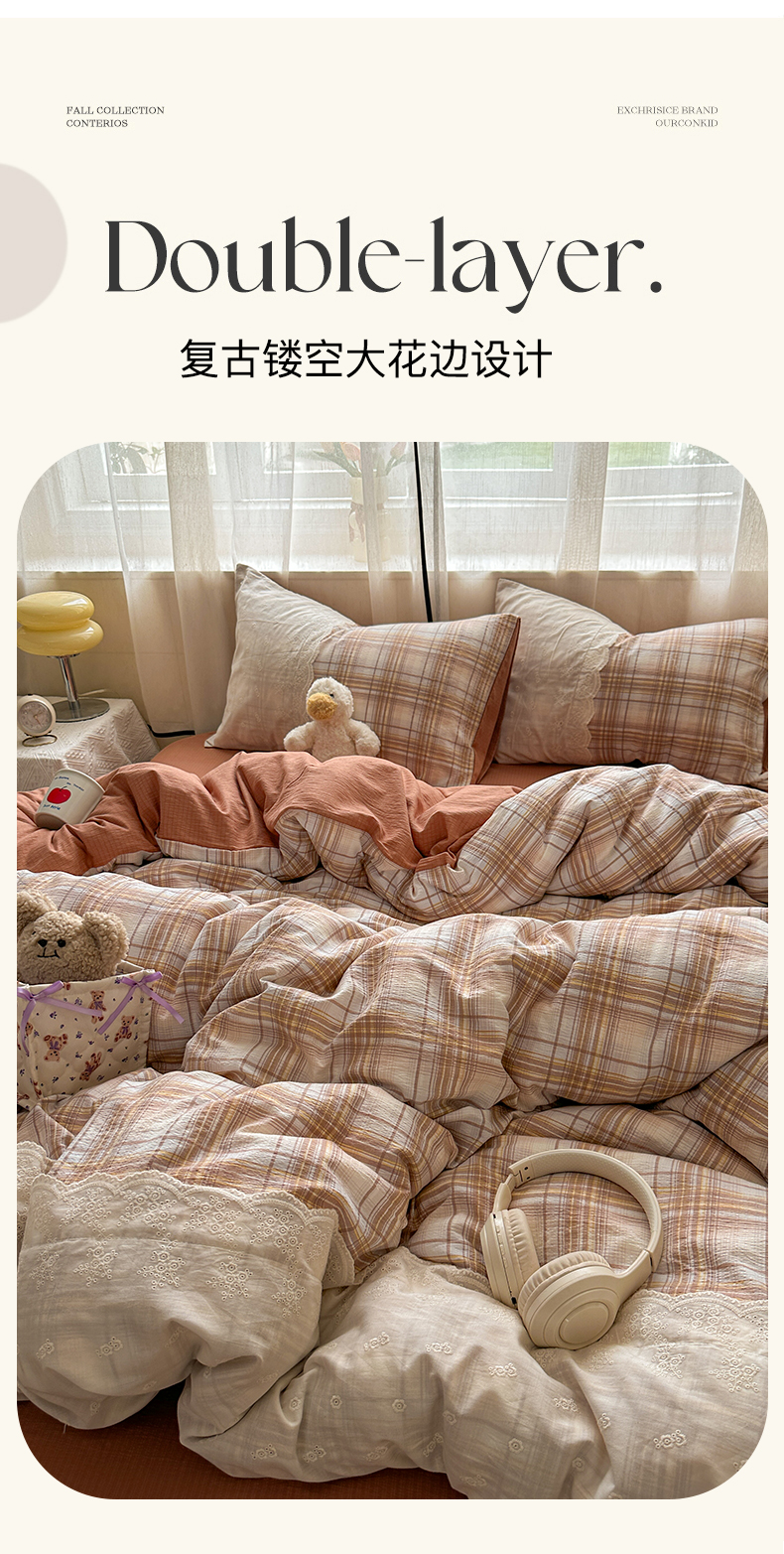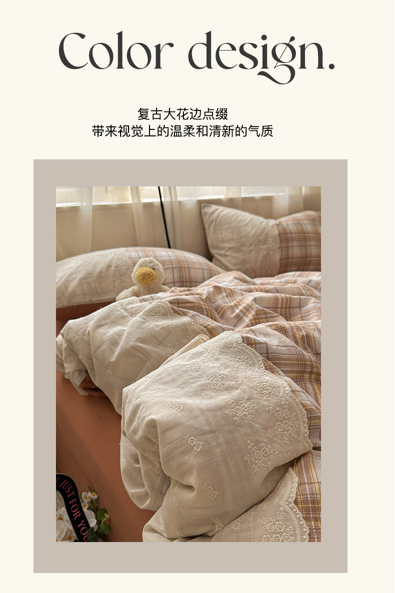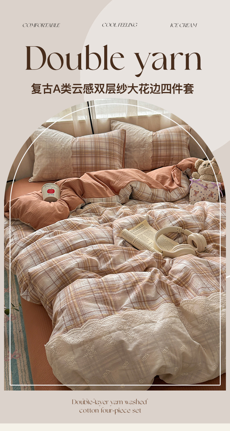 当前位置: 91家纺网 > 商品网购 > 床品套件 > 四件套 > 其它四件套 > 晚爱家纺(原晚安家居) 2025新款韩系少女风蕾丝花边四件套云感木棉双层纱-苏菲 苏菲·浅咖格