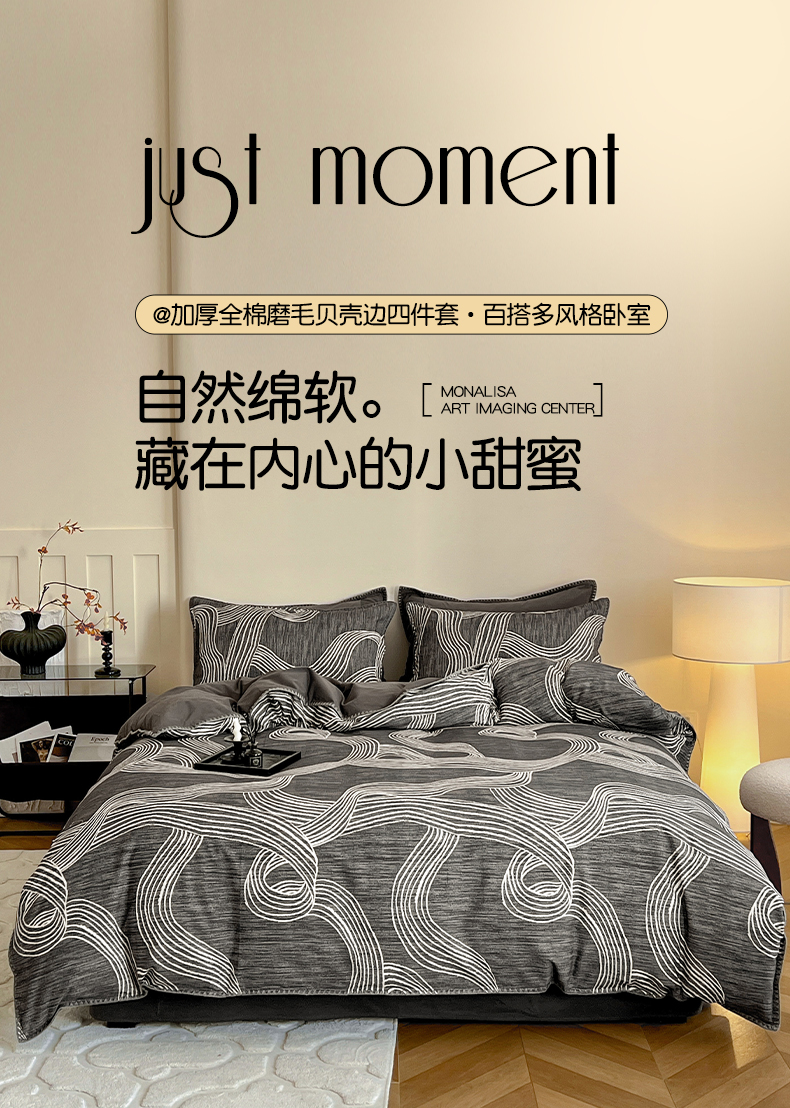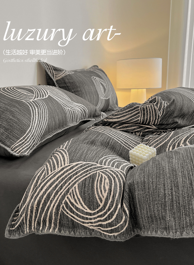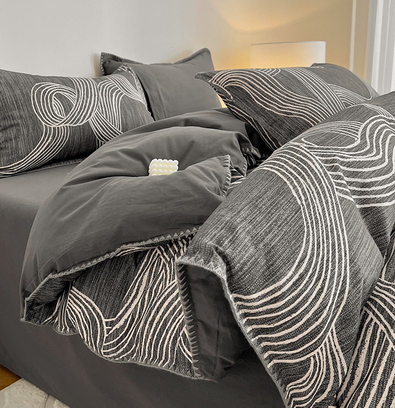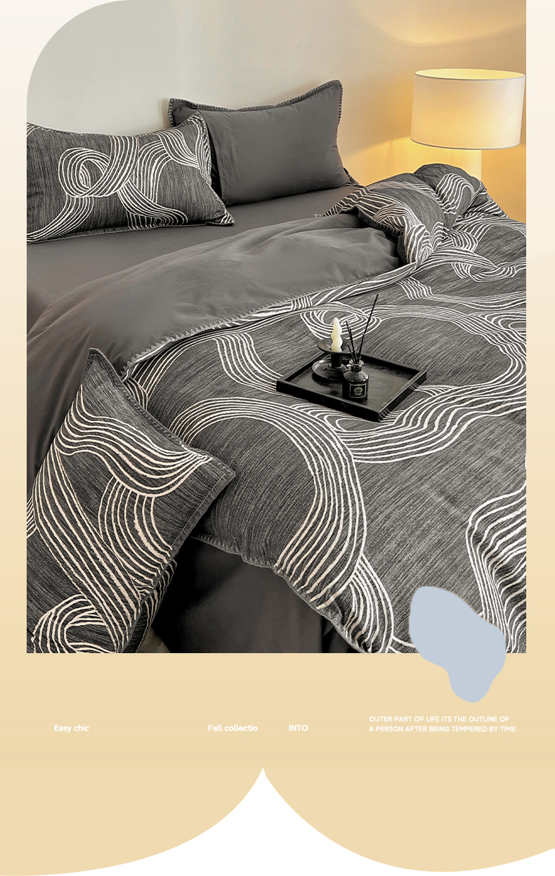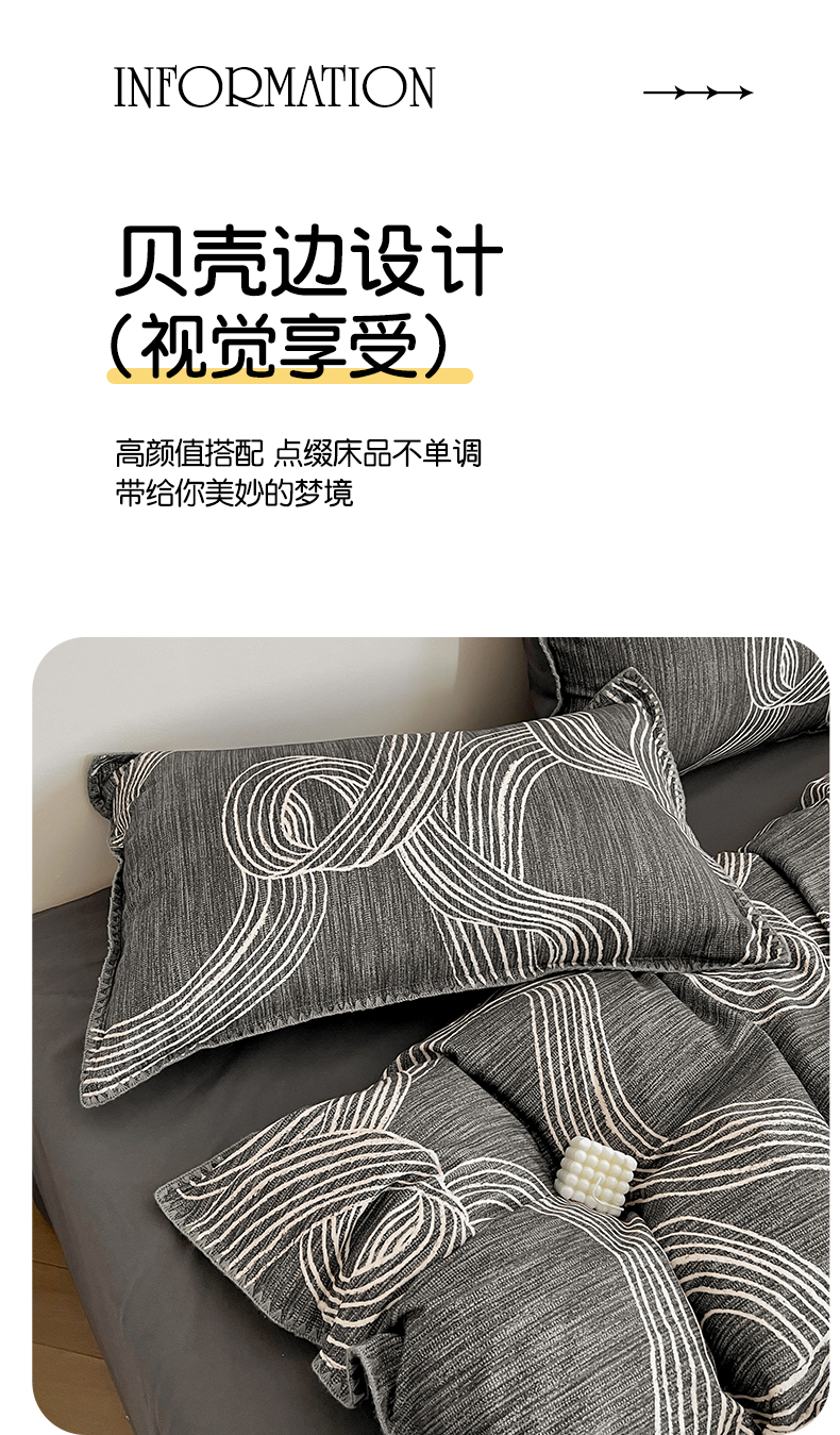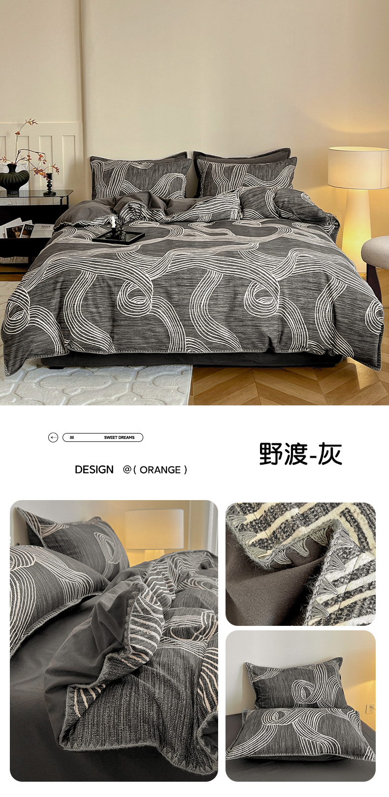 商品名称:品乐家纺 2025秋冬全棉加厚磨毛贝壳边四件套 野渡-灰