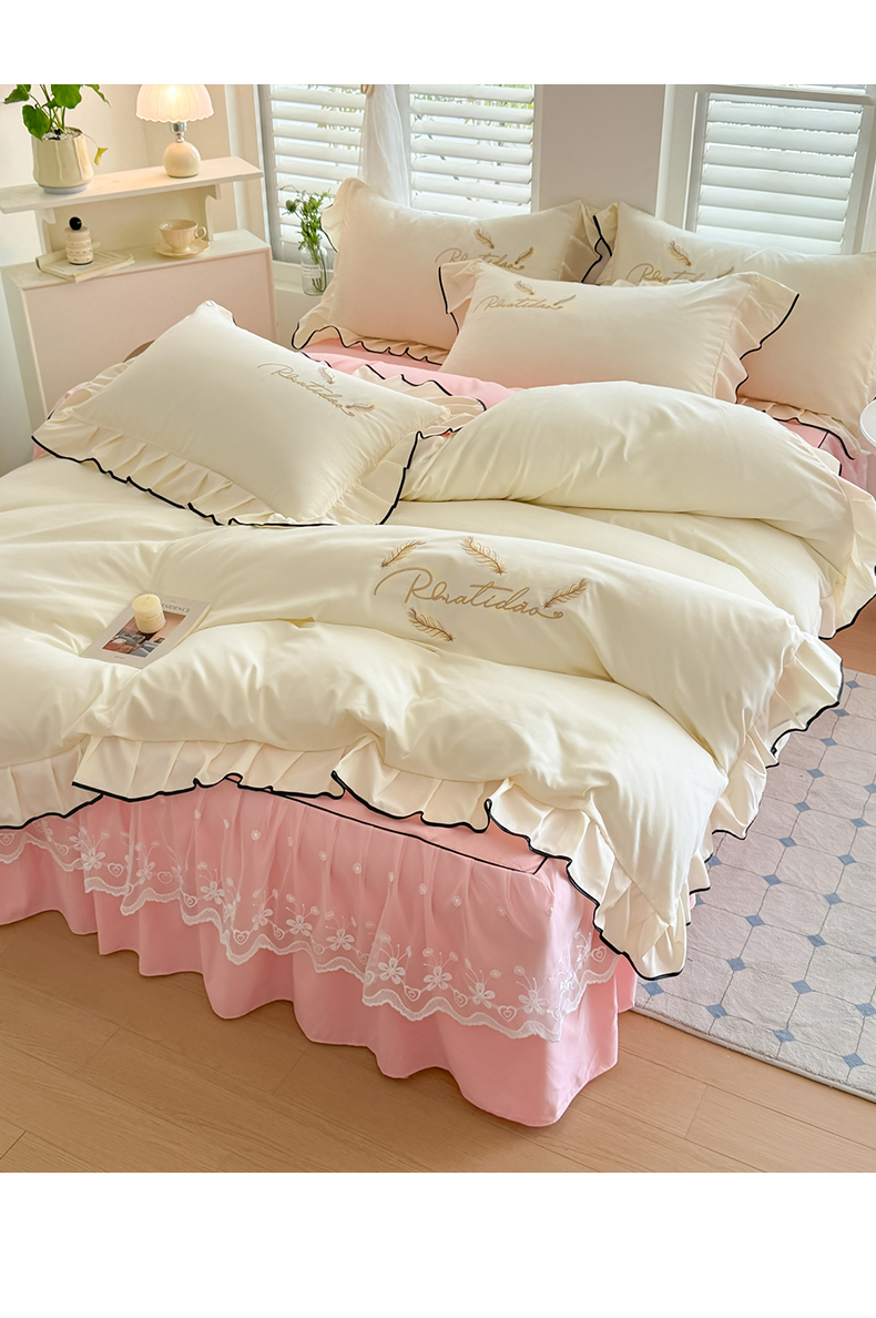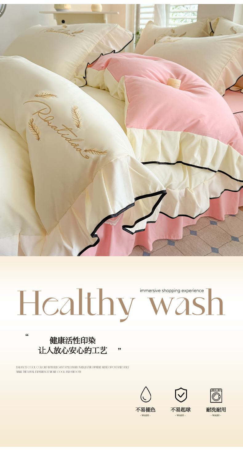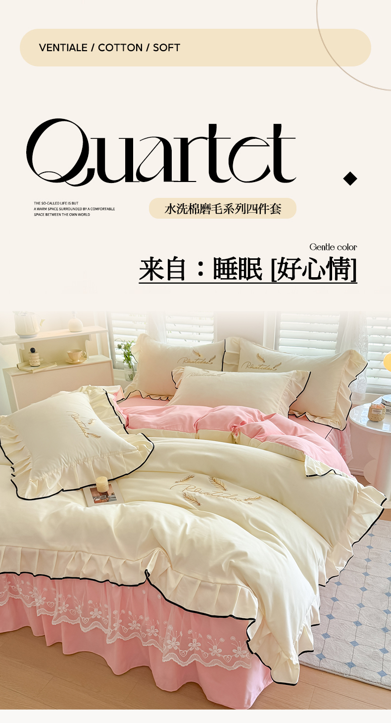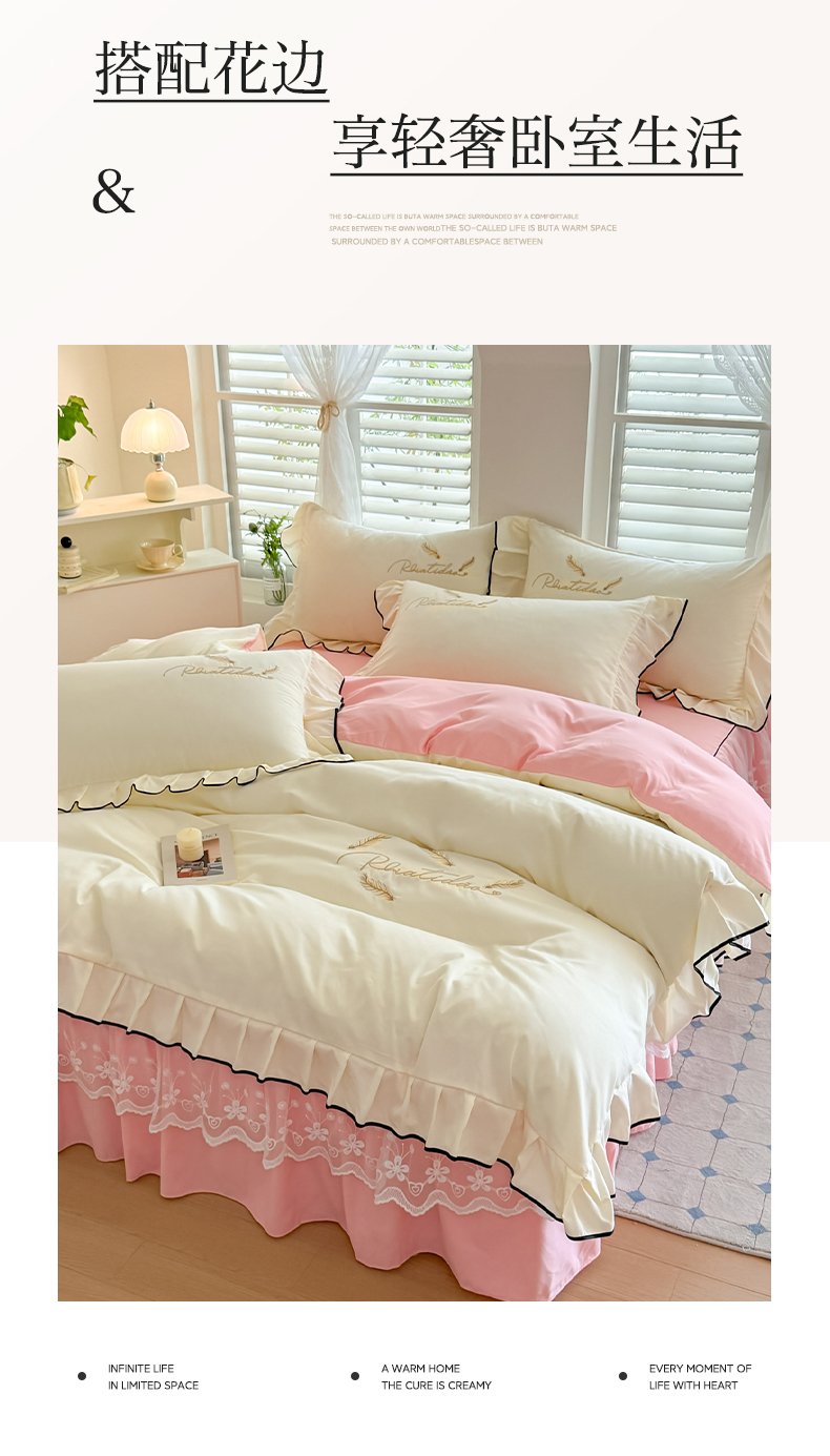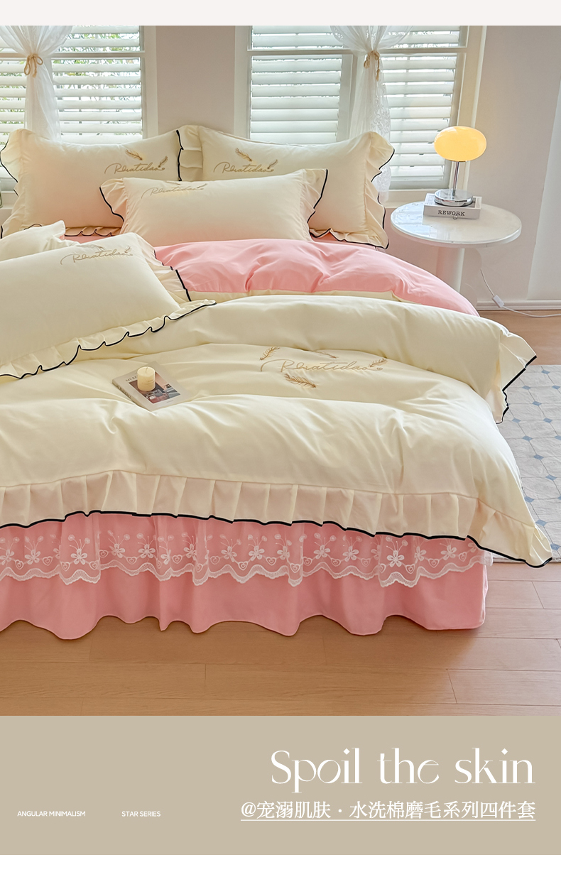 (总)柔享家 2025新款法式花边蕾丝床裙床笠床单水洗棉磨毛四件套-恩格斯,藏蓝+天际蓝,豆沙+浅灰,粉玉+嫩绿,米黄+粉玉,嫩绿+米黄,浅灰+浅灰,天际蓝+宝石蓝,丁香紫+香芋紫