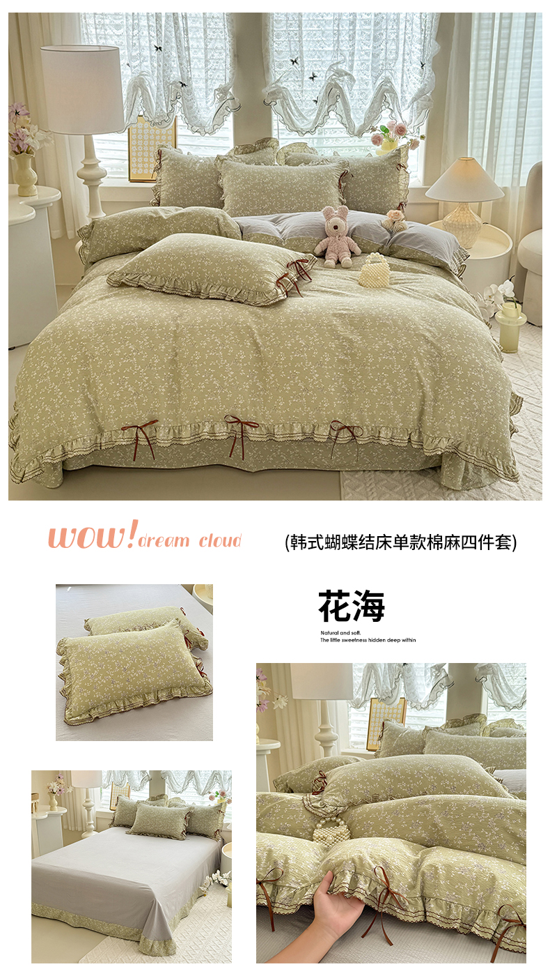 商品名称:韩约家纺 2025新款1韩式蝴蝶结加厚床单款棉麻四件套 波波蓝