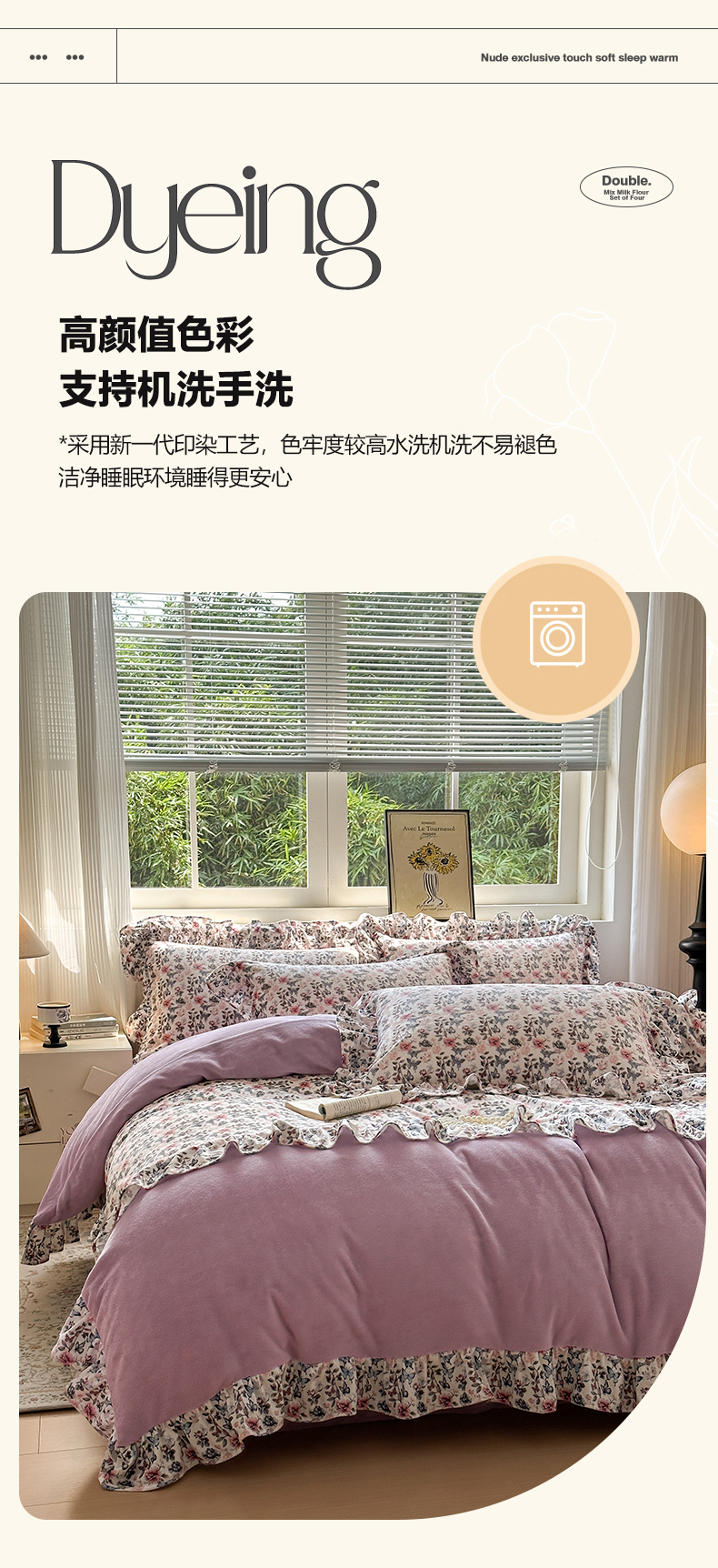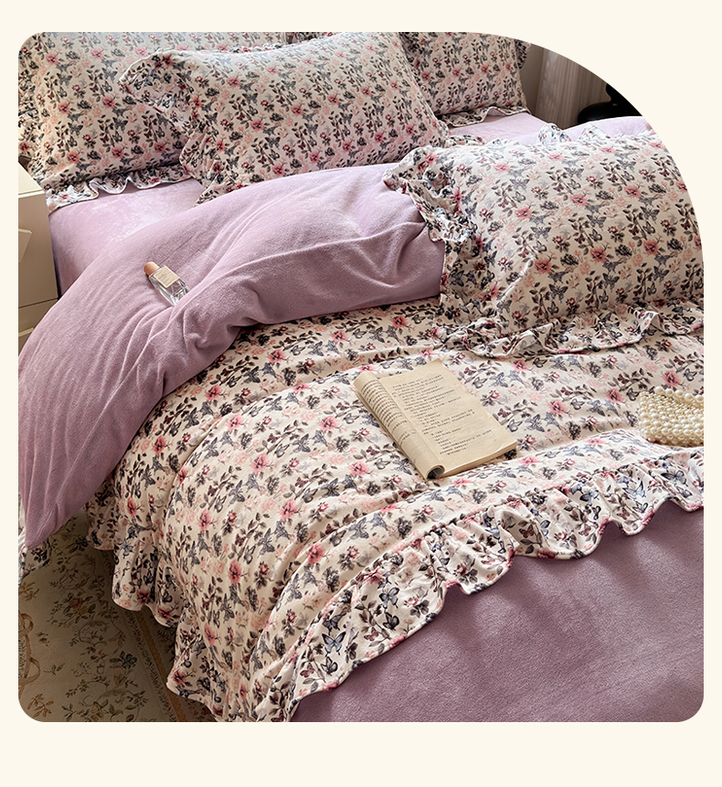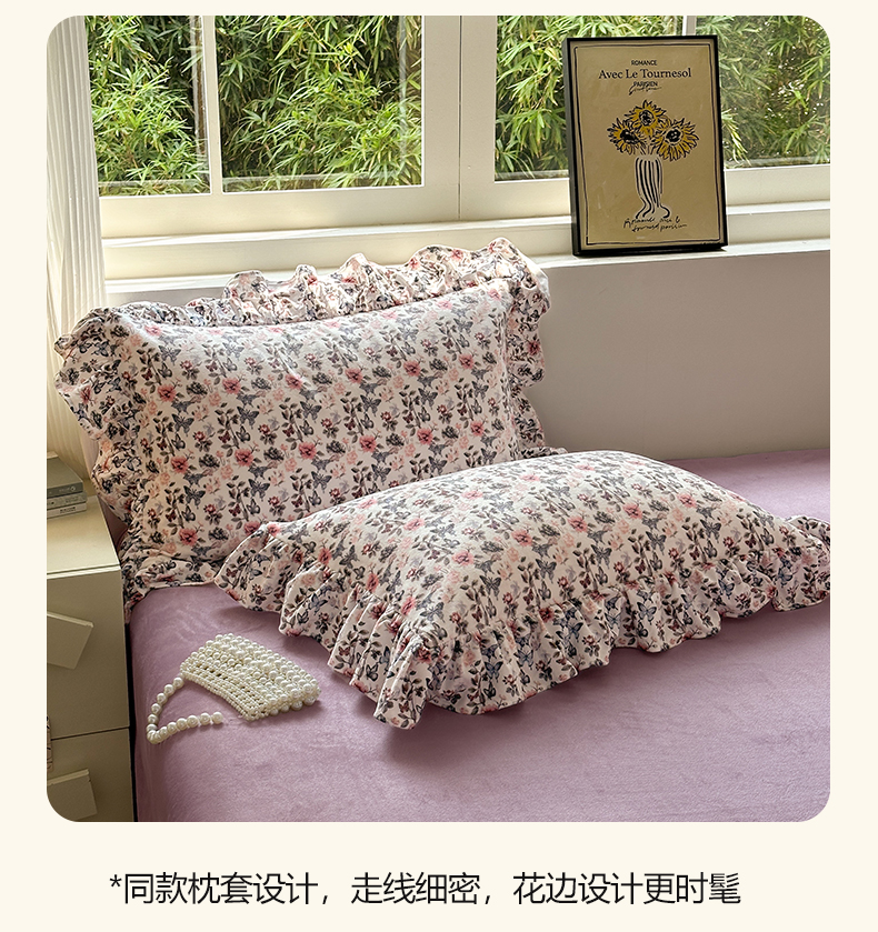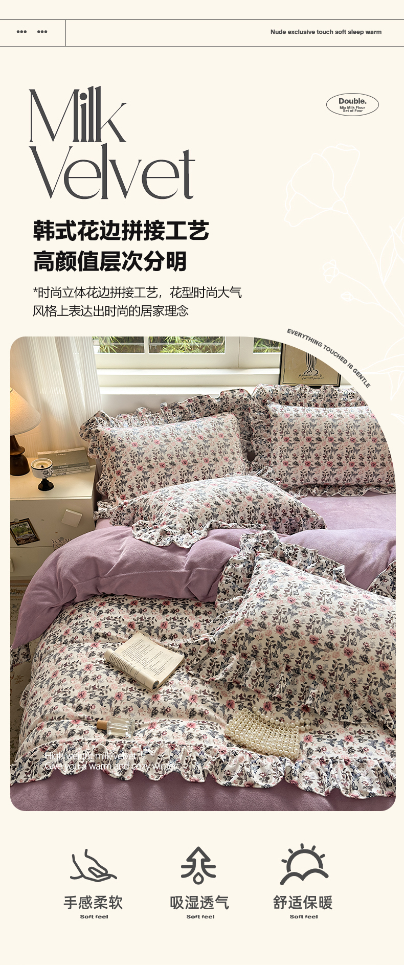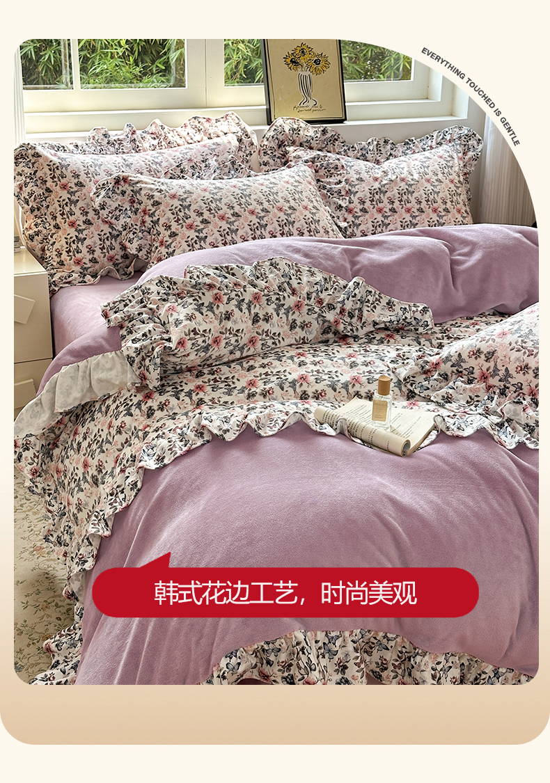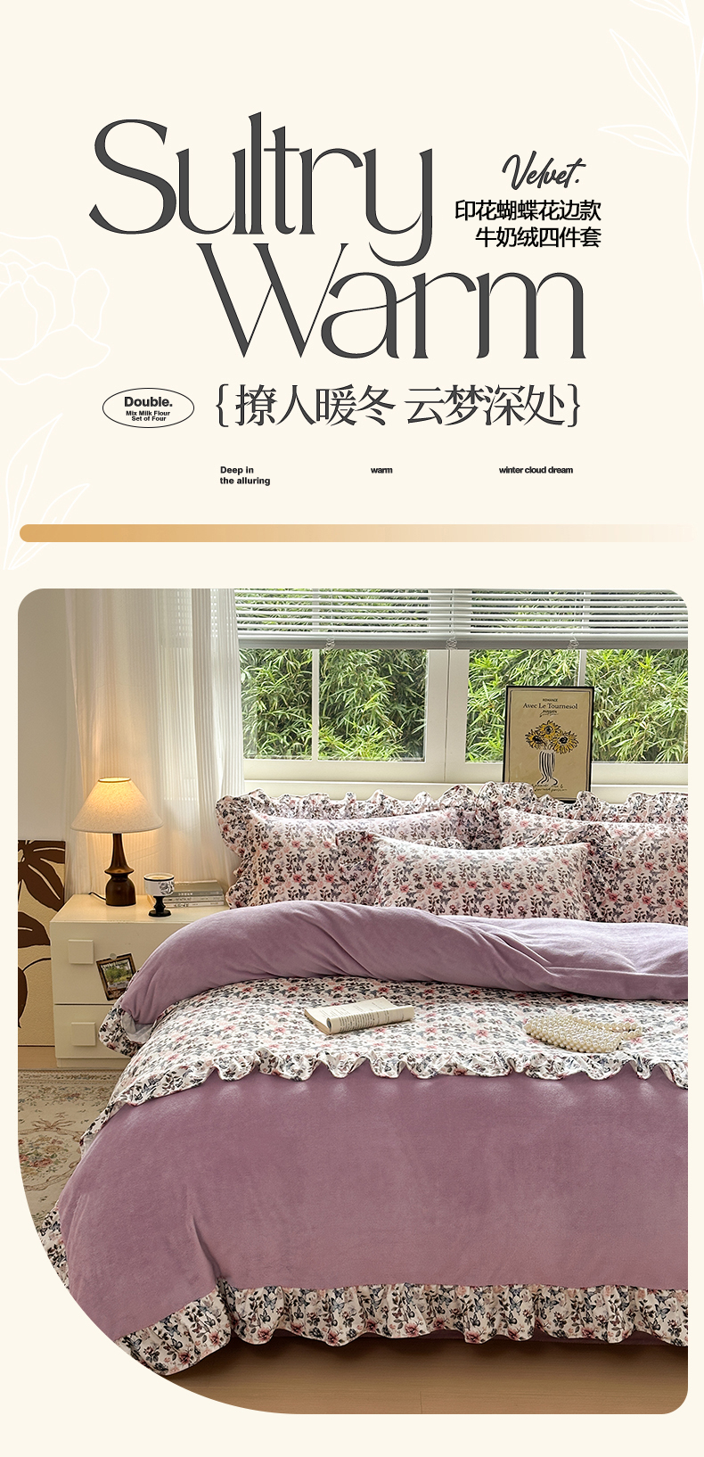 当前位置: 91家纺网 > 商品网购 > 床品套件 > 四件套 > 牛奶绒四件套 > 兰紫橙家纺 2025新款印花蝴蝶花边款牛奶绒四件套 花边款-罗兰紫