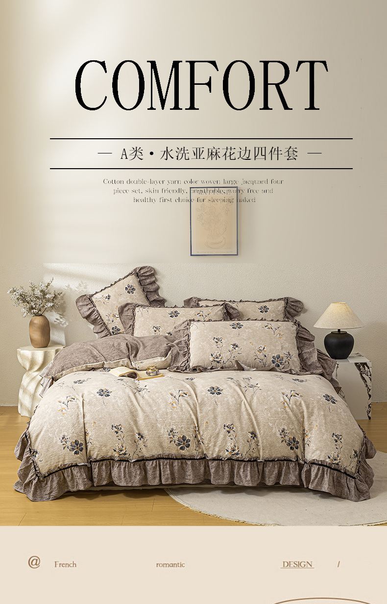 商品名称:大麦家纺 2025新款水洗亚麻花边四件套 山花浪漫