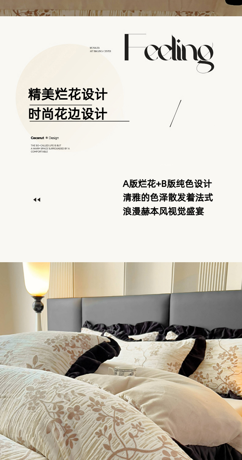 商品名称:找底底家纺 2025新款A类法式浪漫烂花赫本风牛奶绒四件套 暗香-奶咖