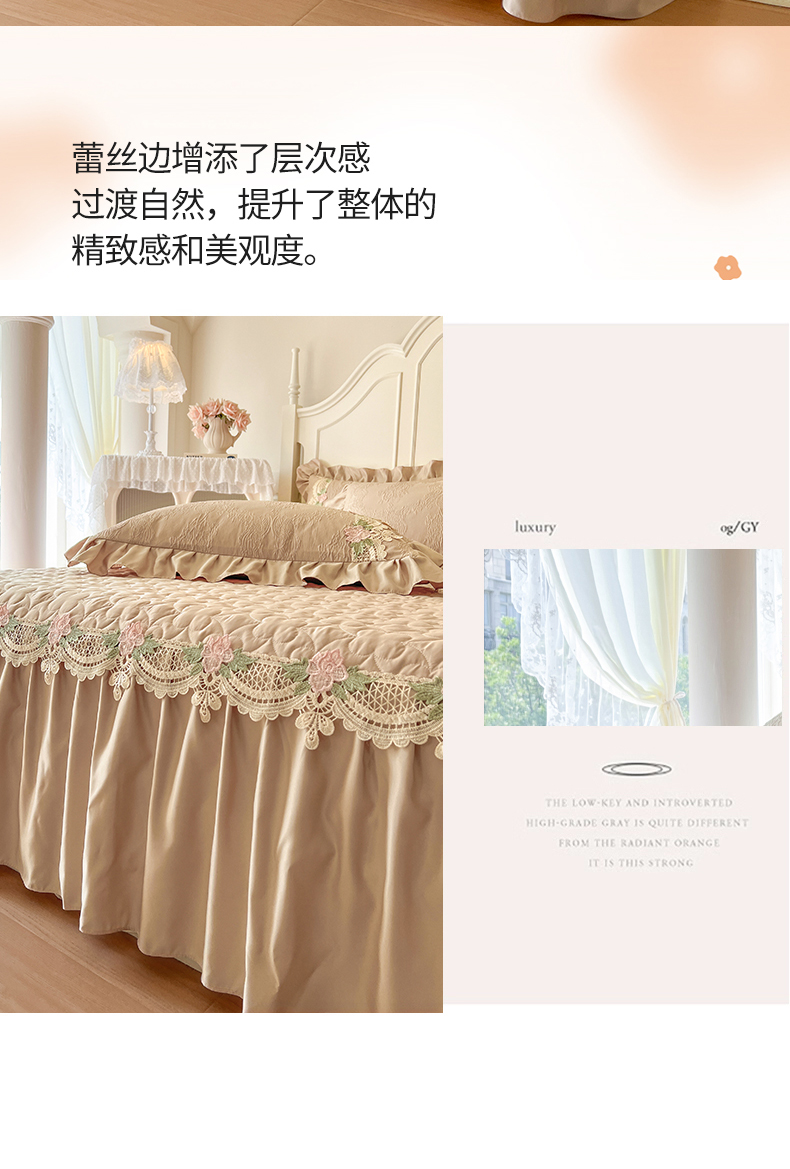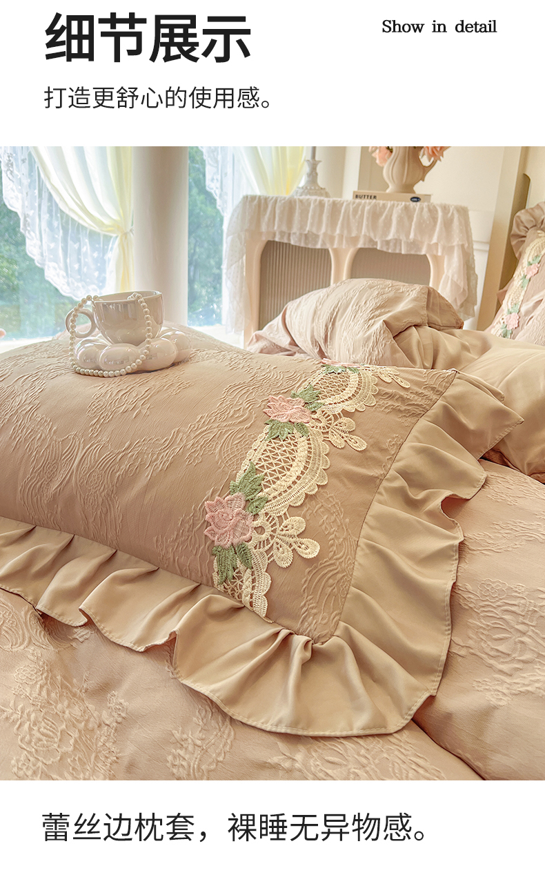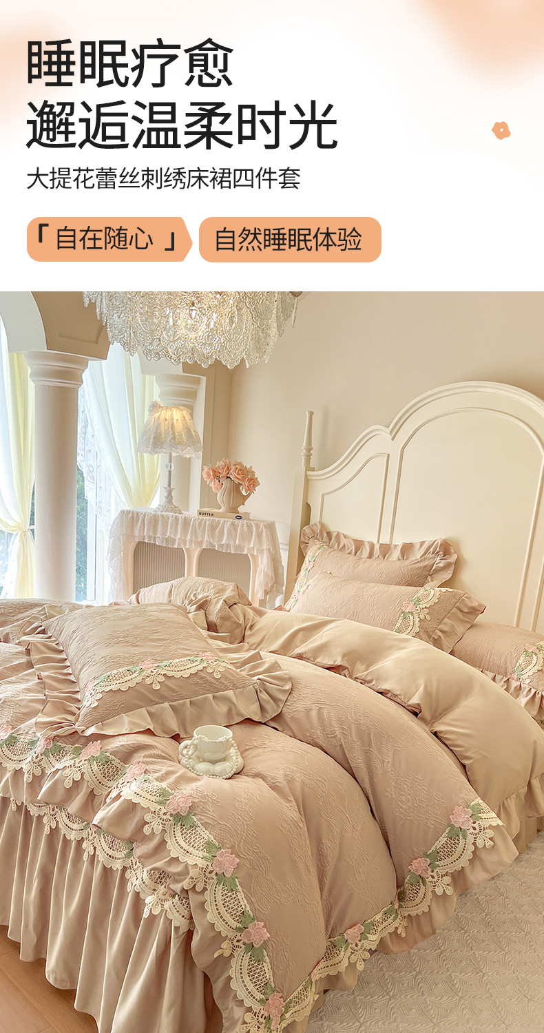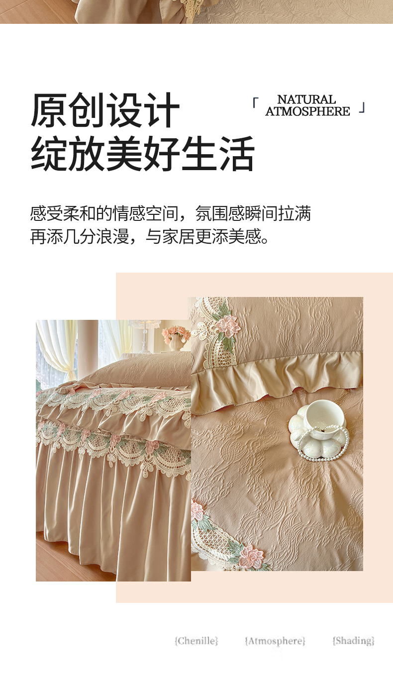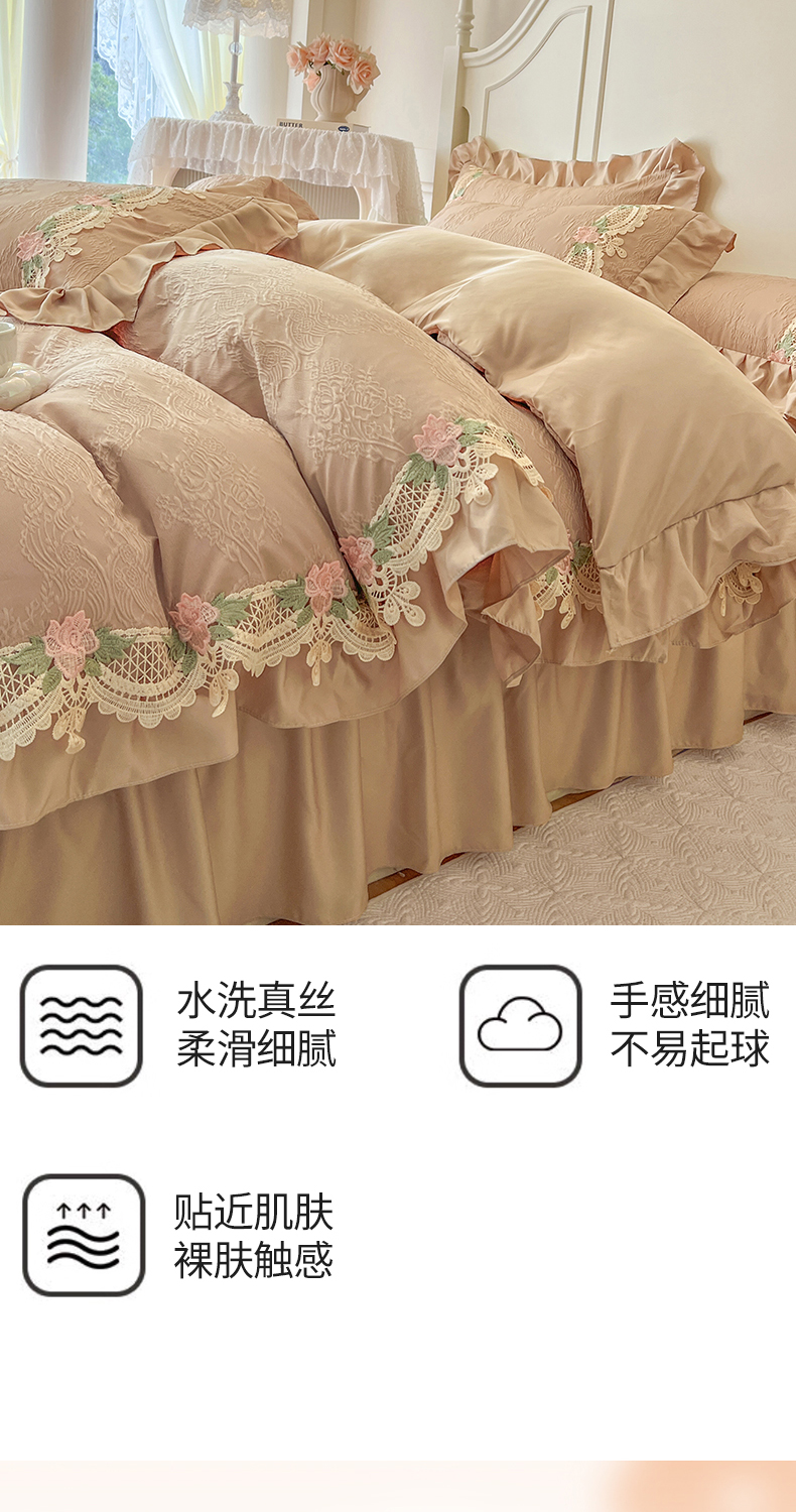 当前位置: 91家纺网 > 商品网购 > 床品套件 > 四件套 > 其它四件套 > 网红馆(ck家纺) 2025新款水洗真丝蕾丝刺绣床裙四件套-慕尚 香槟