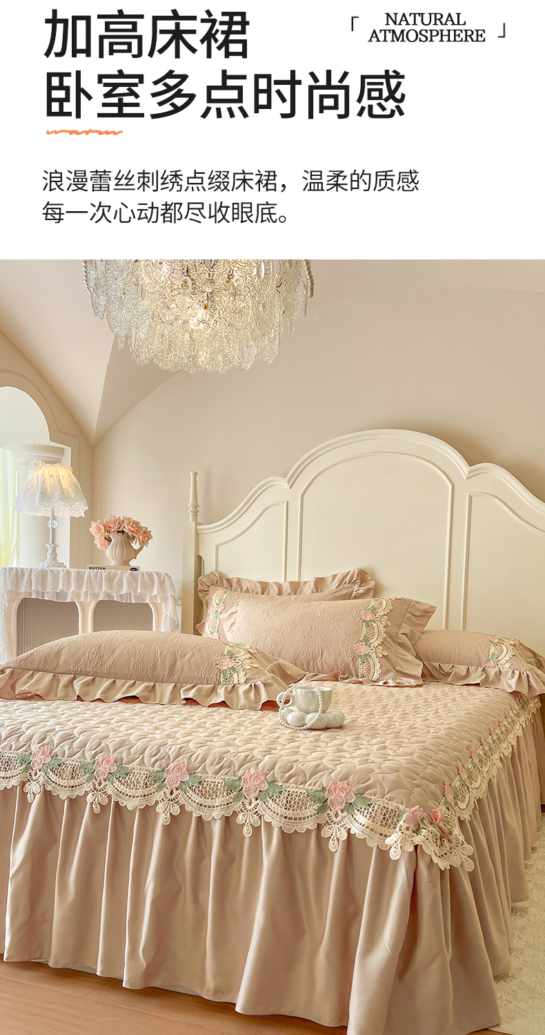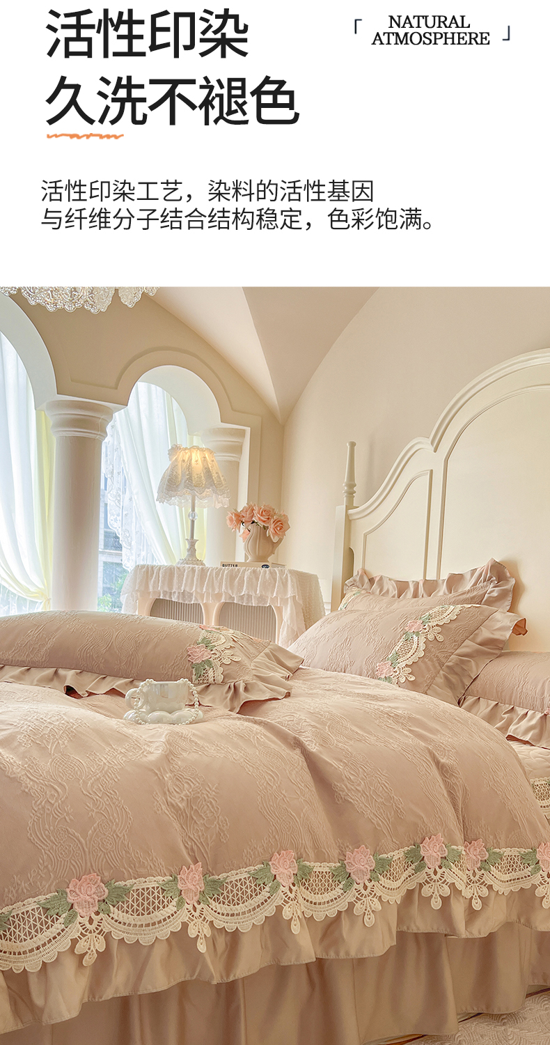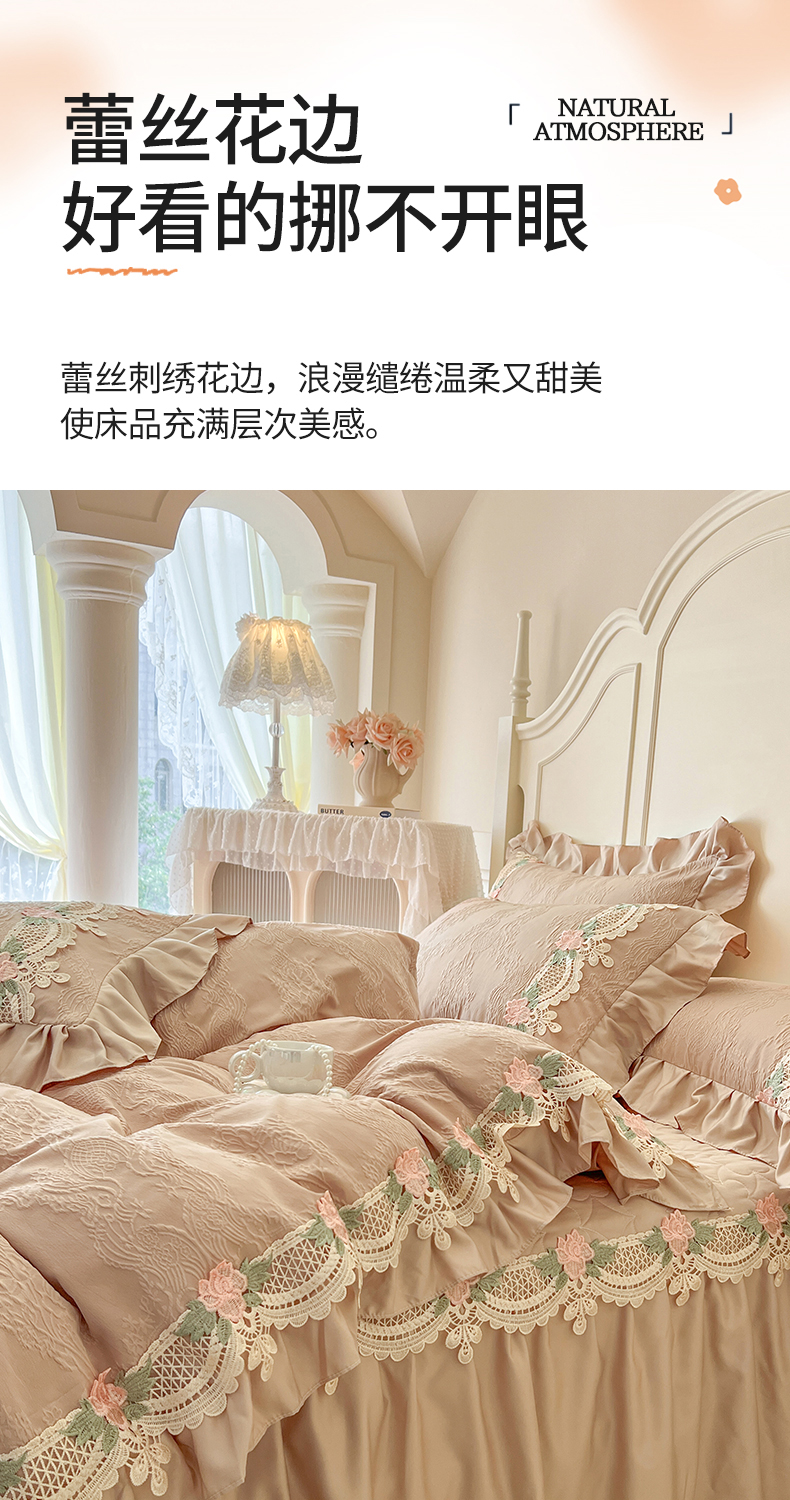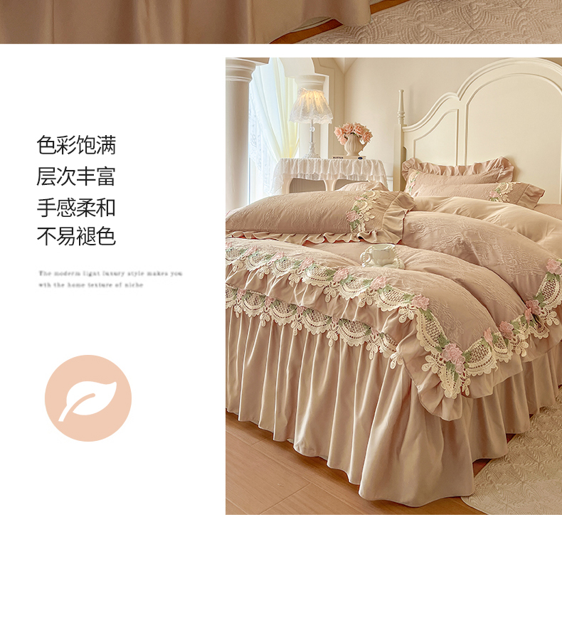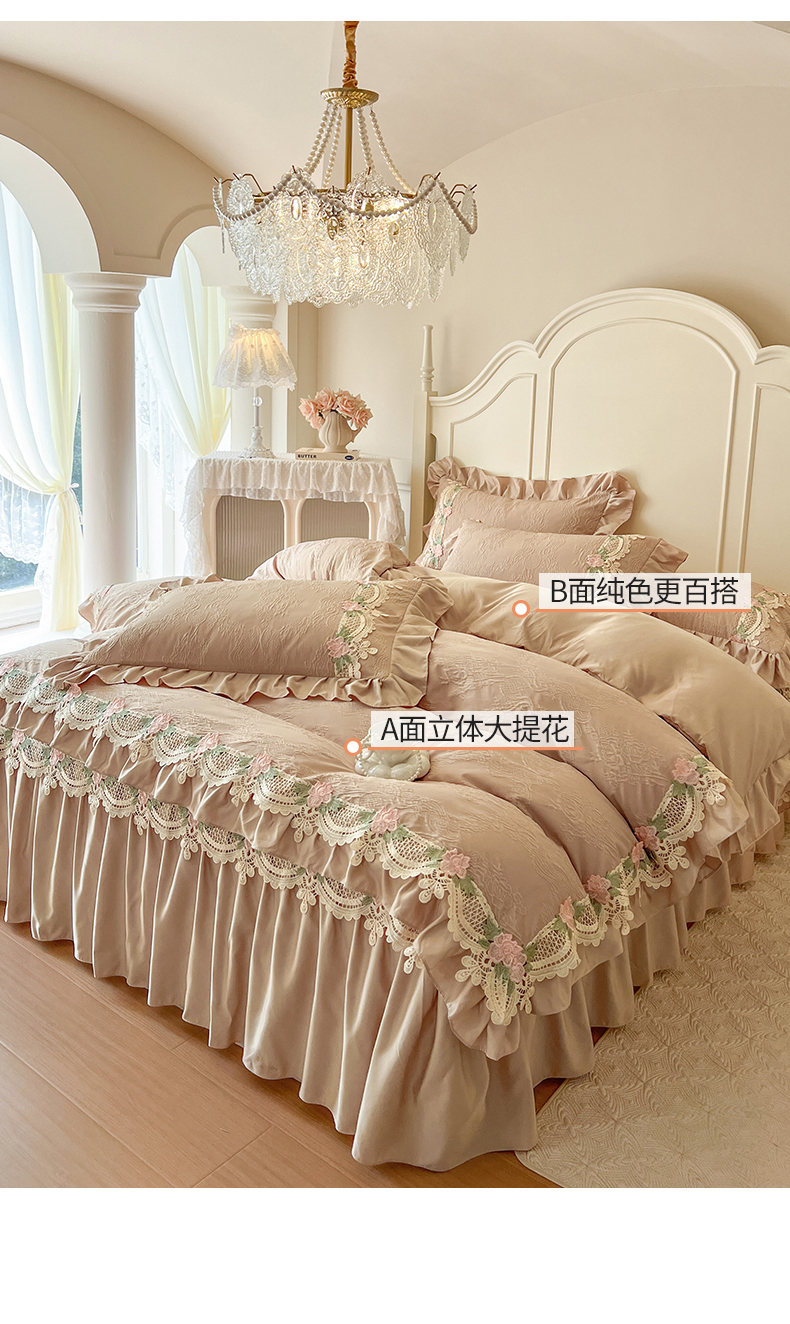 当前位置: 91家纺网 > 商品网购 > 床品套件 > 四件套 > 其它四件套 > 网红馆(ck家纺) 2025新款水洗真丝蕾丝刺绣床裙四件套-慕尚 香槟