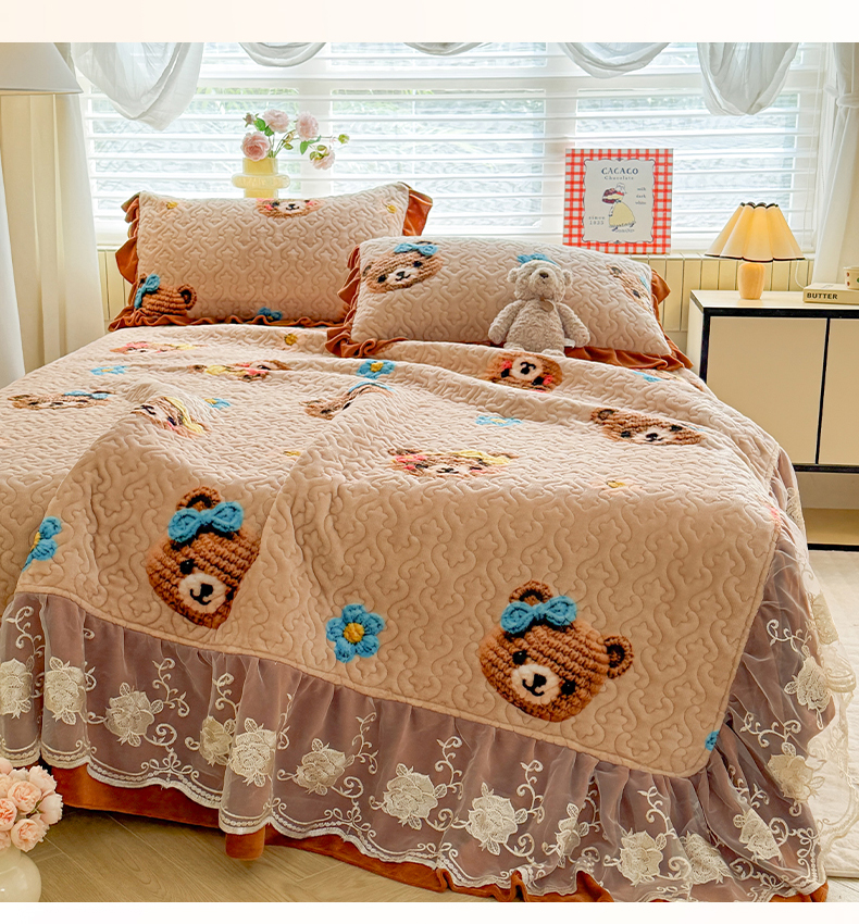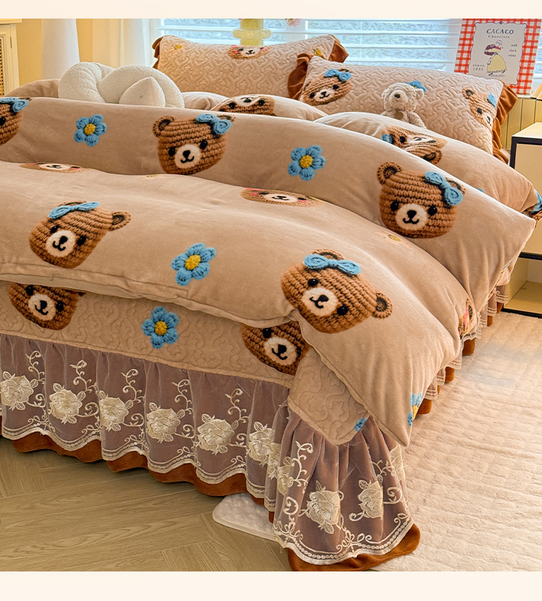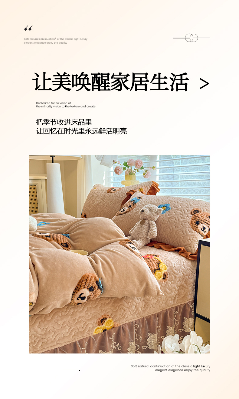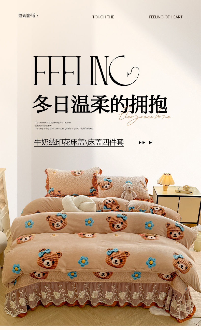 美达家纺 2025新款卡通牛奶绒印花床盖四件套 针织熊