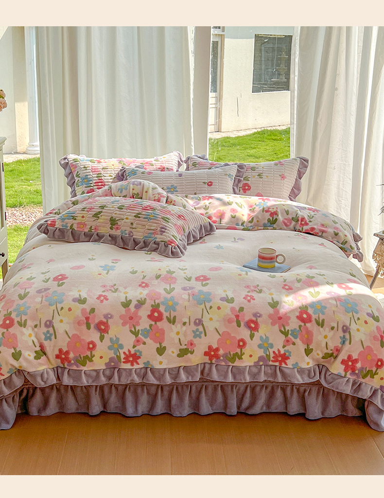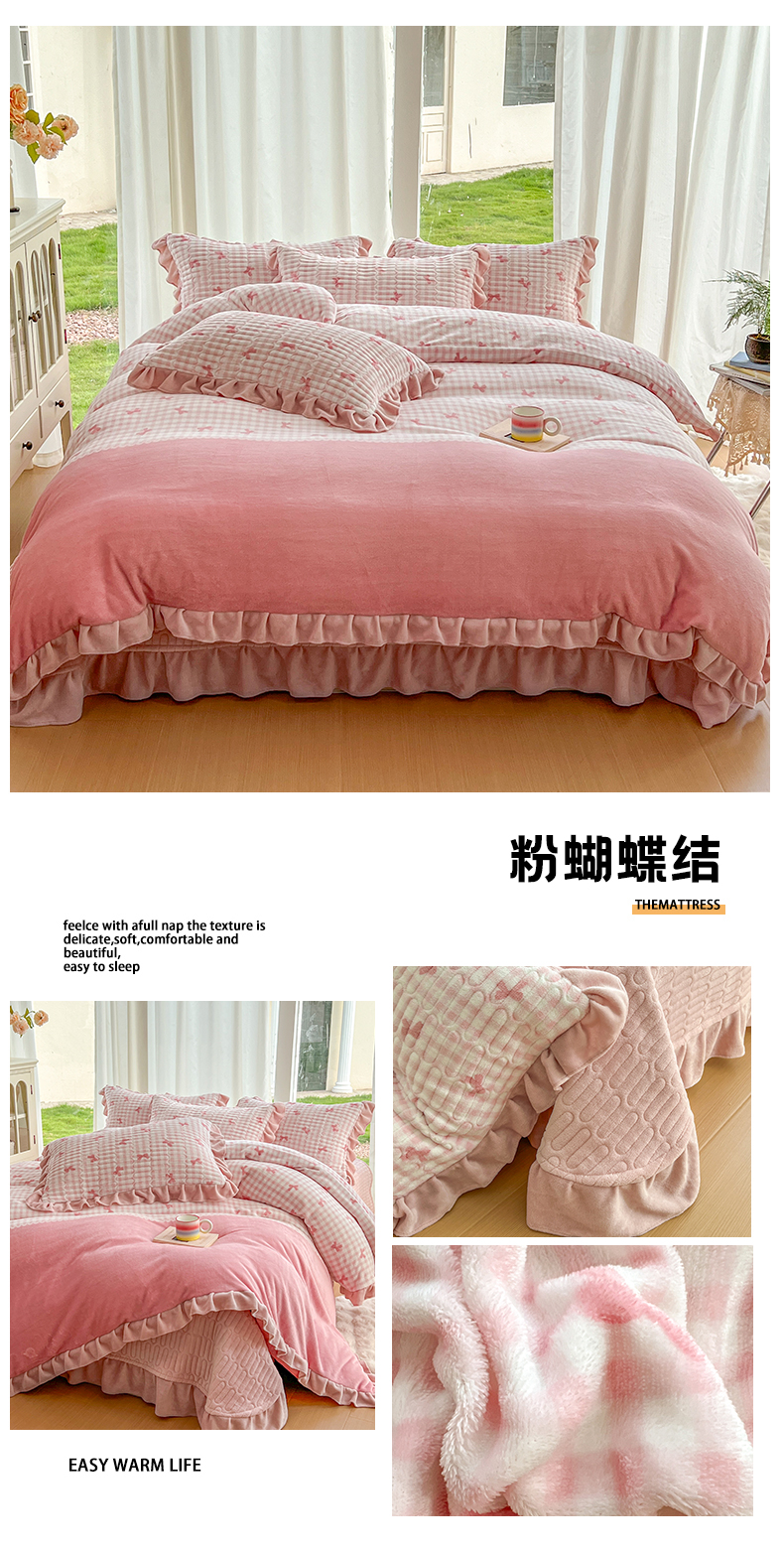 美梦家纺 2025新款花边牛奶绒床盖四件套 梦回花田粉