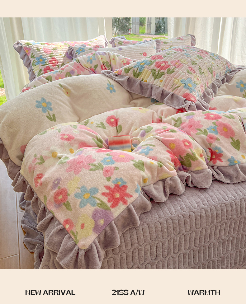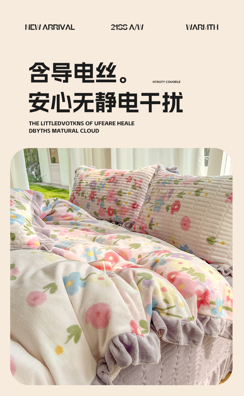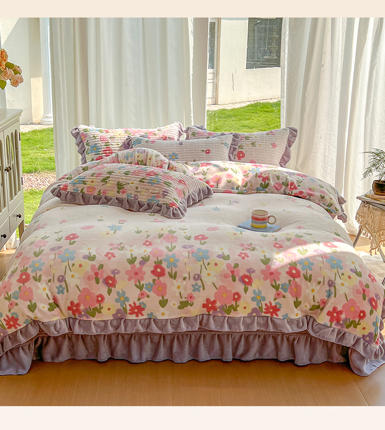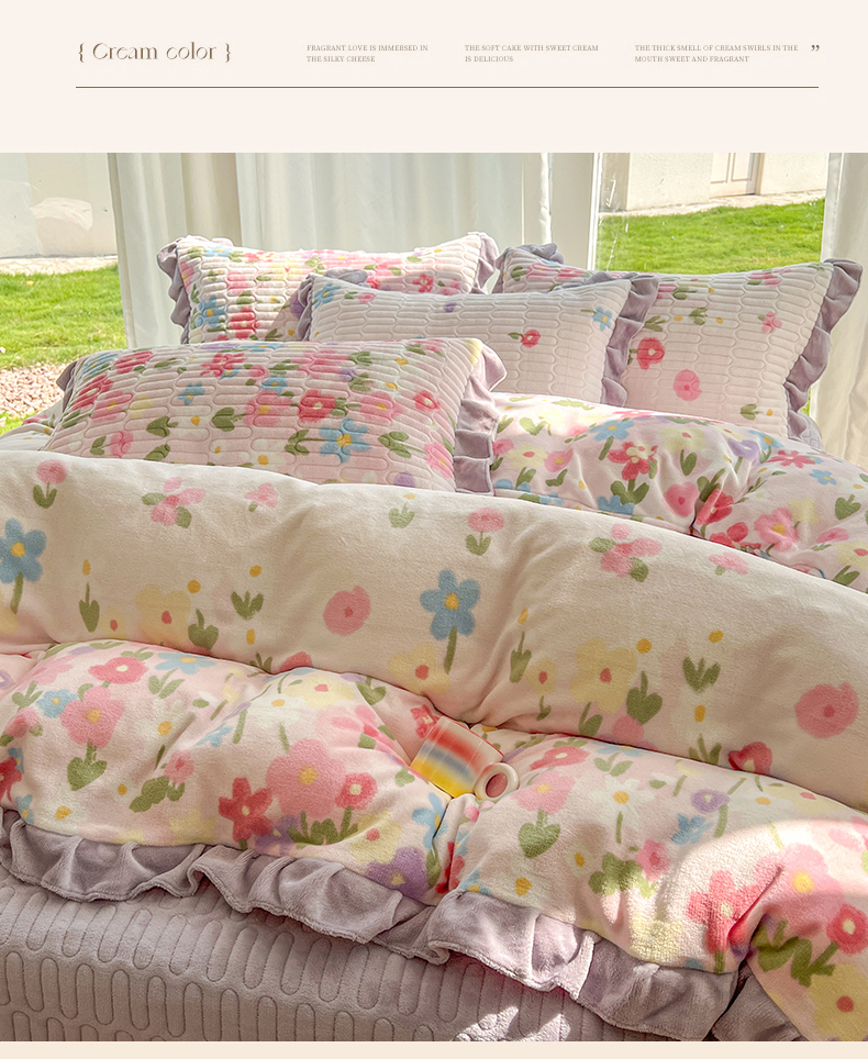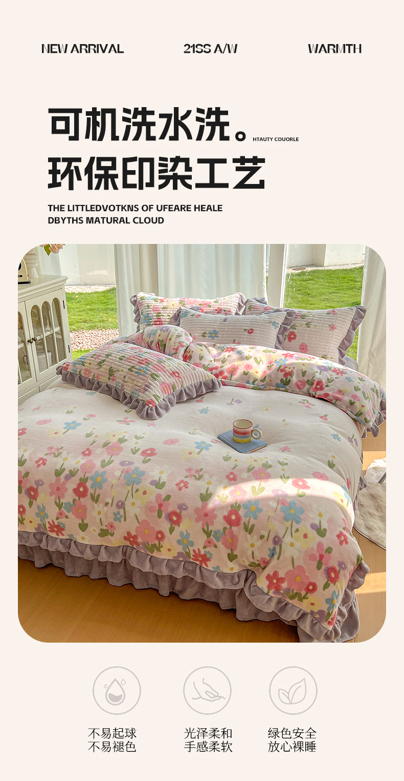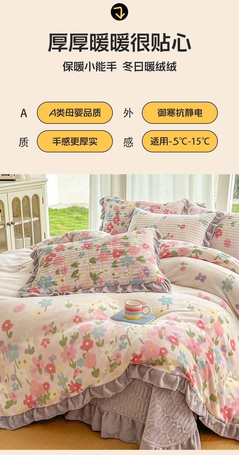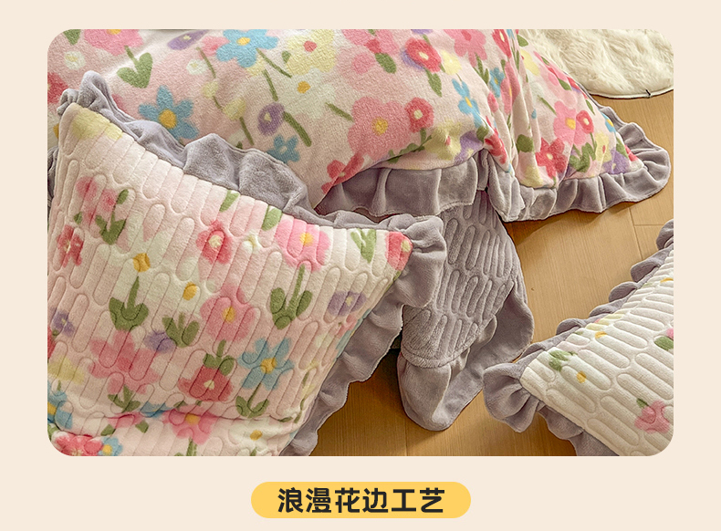 商品名称:美梦家纺 2025新款花边牛奶绒床盖四件套 梦回花田粉