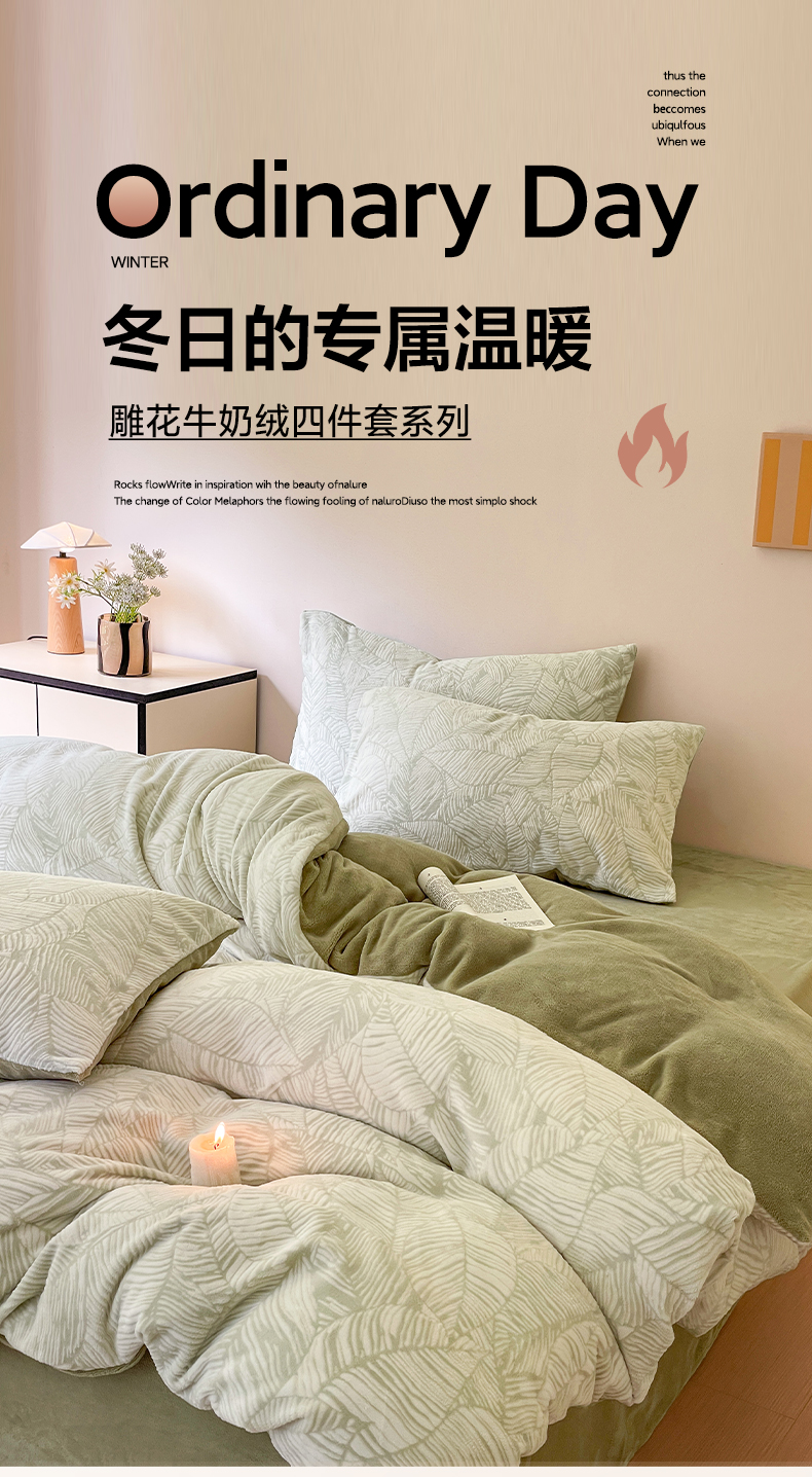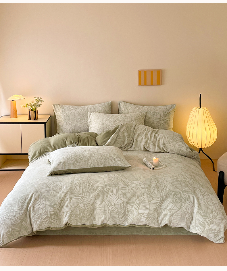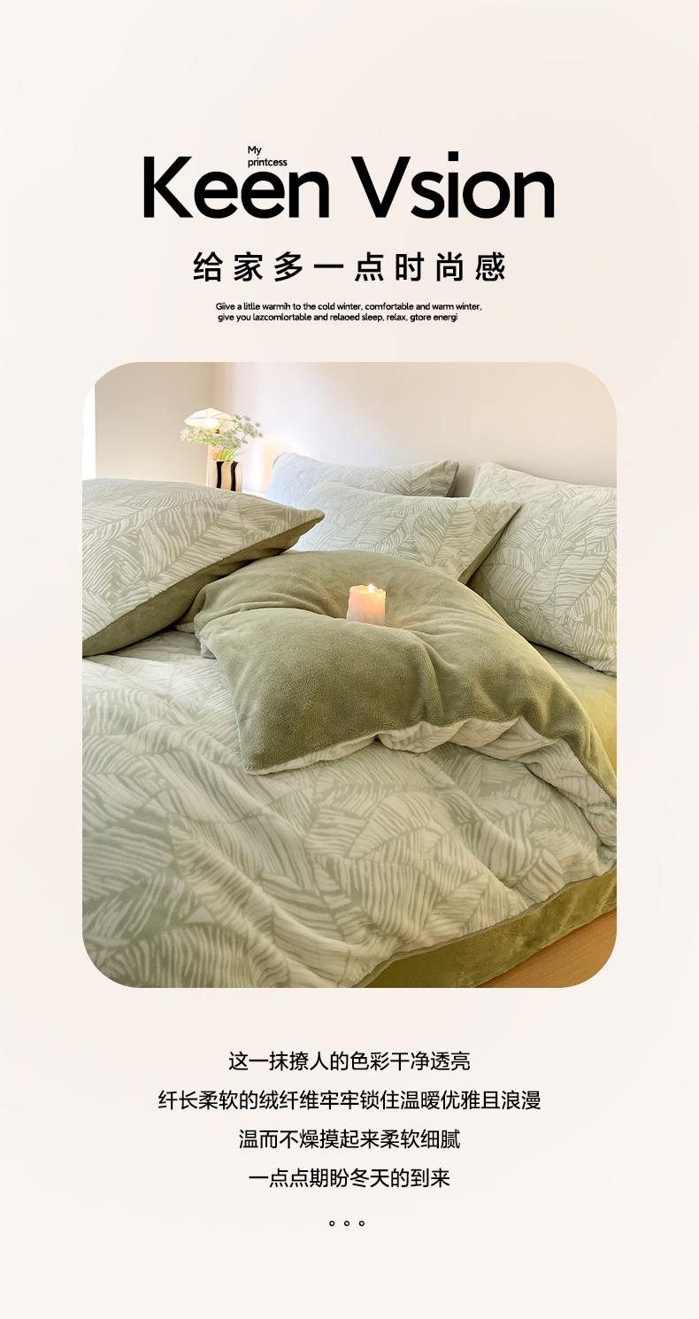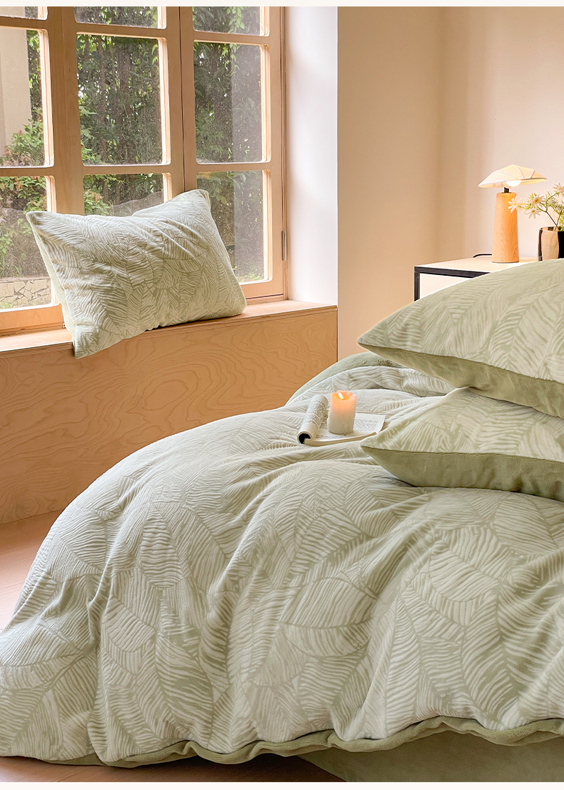 雅居纺家纺 2025新款花卉雕花绒加厚保暖四件套 绿色树叶