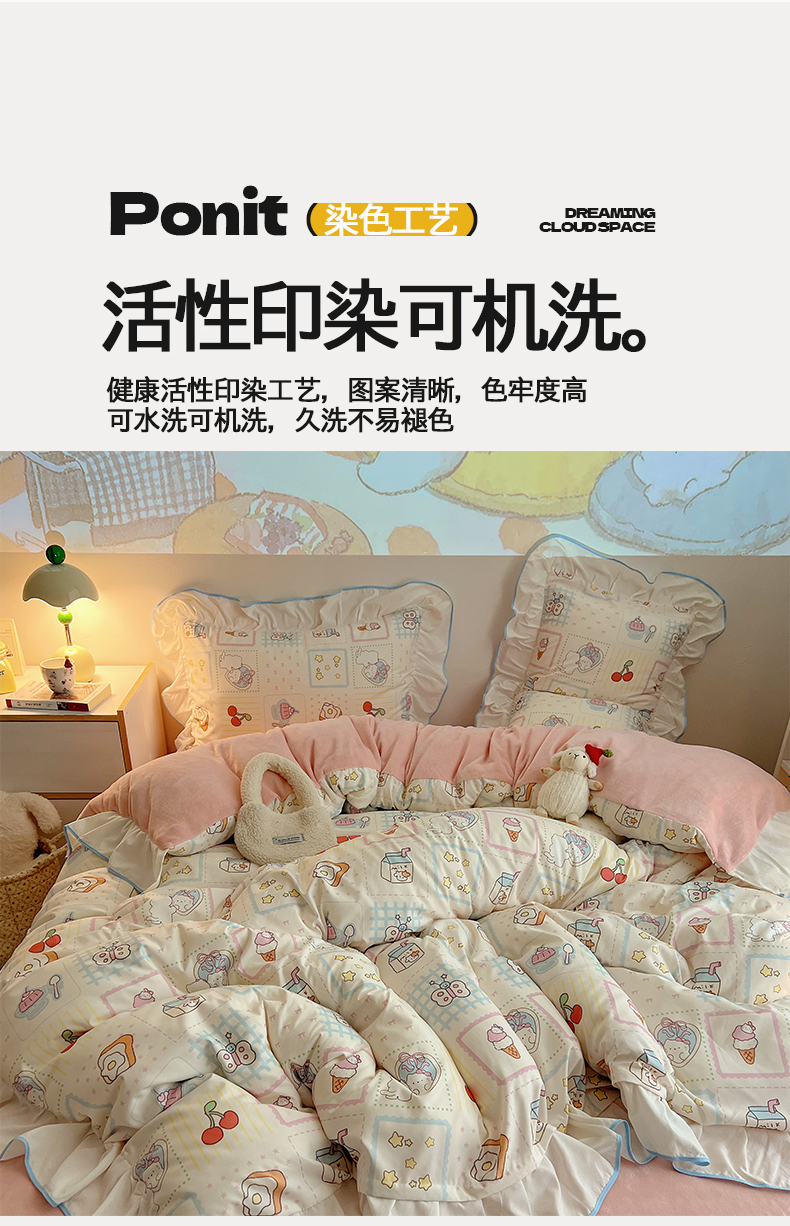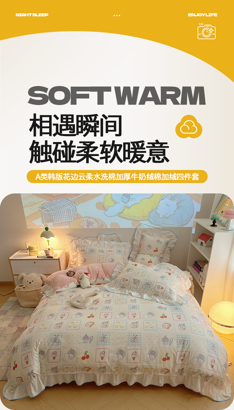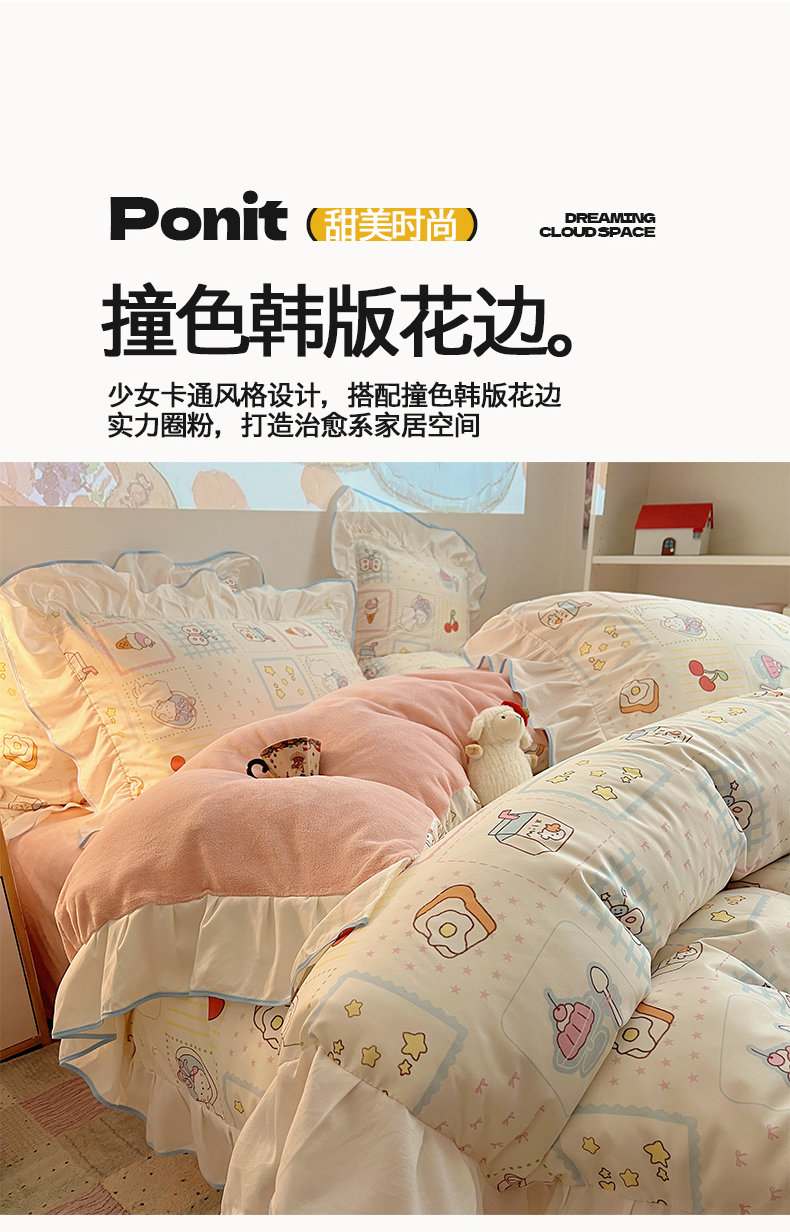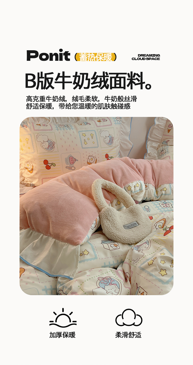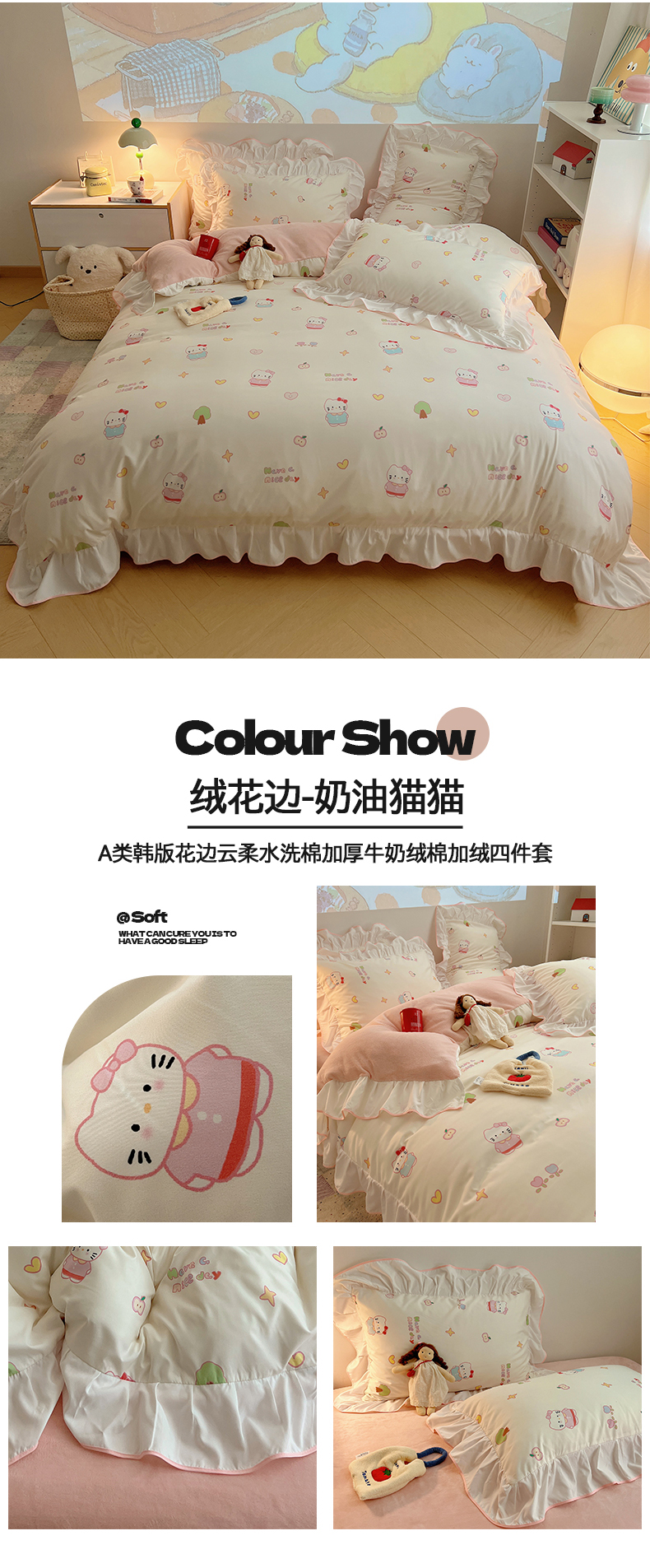 当前位置: 91家纺网 > 商品网购 > 床品套件 > 四件套 > 牛奶绒四件套 > 桃心家居 2025新款A类韩版花边撞色云柔水洗棉加厚牛奶绒少女猫咪棉绒四件套系列 绒花边-甜梦猫咪