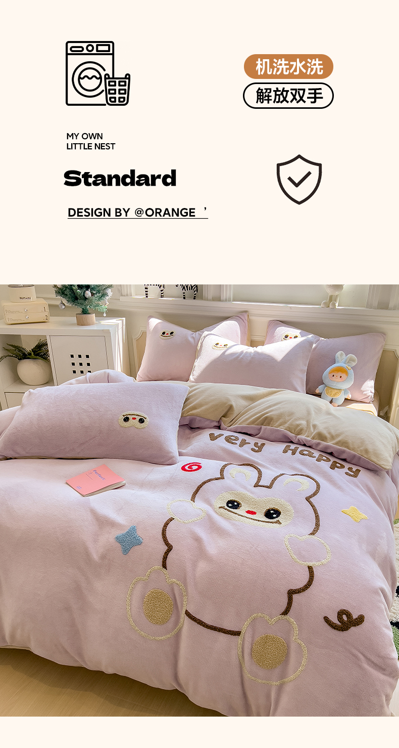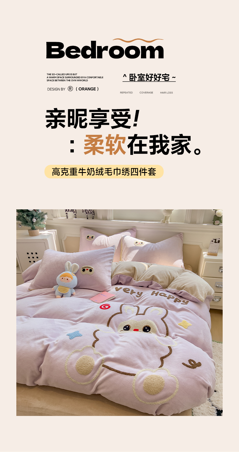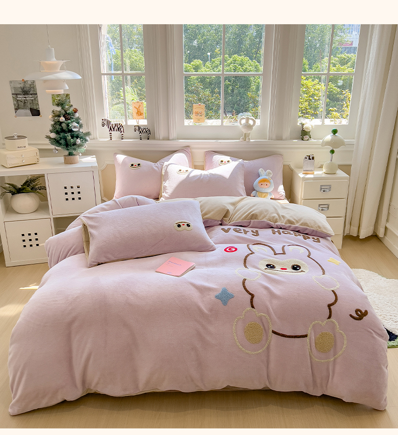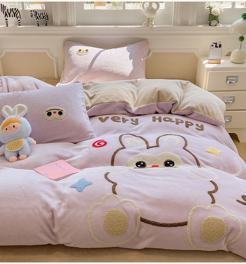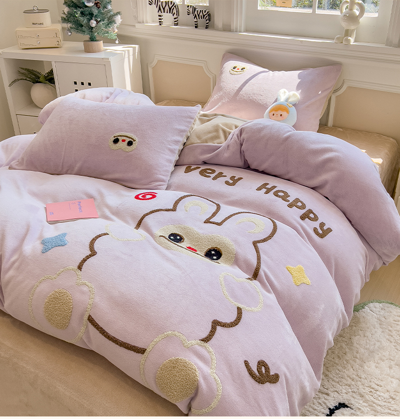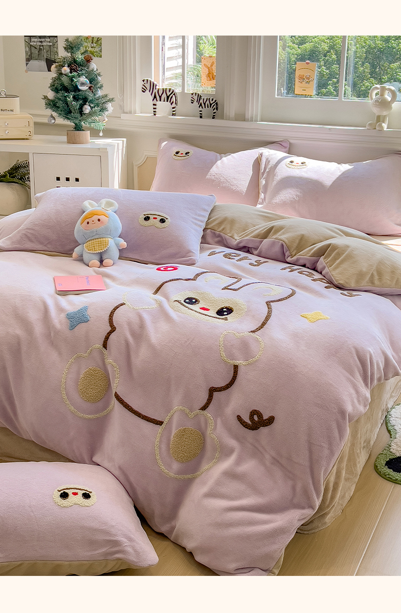 当前位置: 91家纺网 > 商品网购 > 床品套件 > 四件套 > 牛奶绒四件套 > 悦织语 2025新款加厚200克高克重毛巾绣牛奶绒四件套 可爱布布-紫