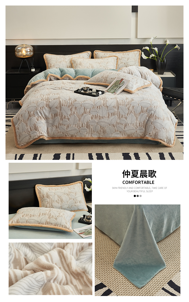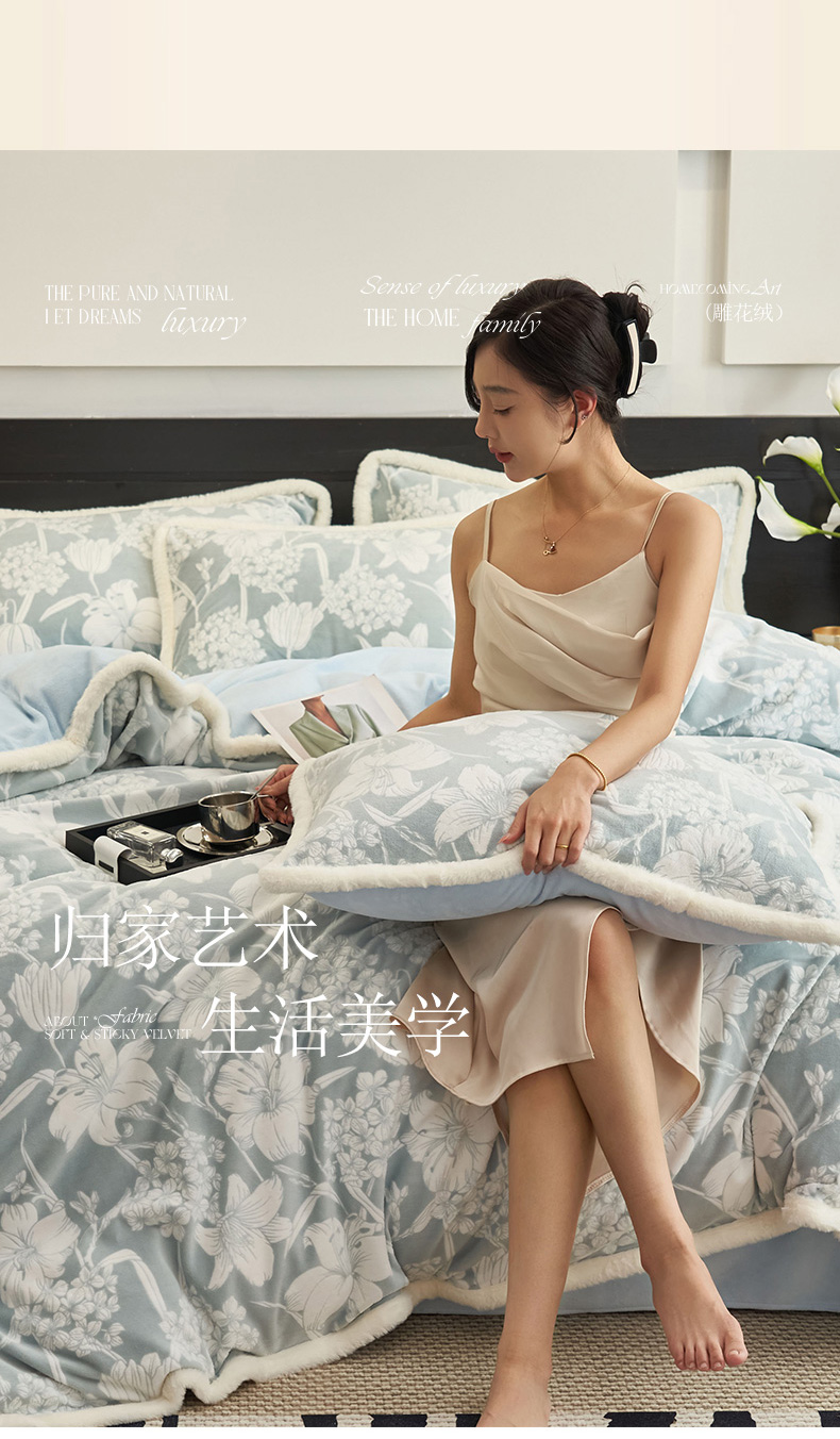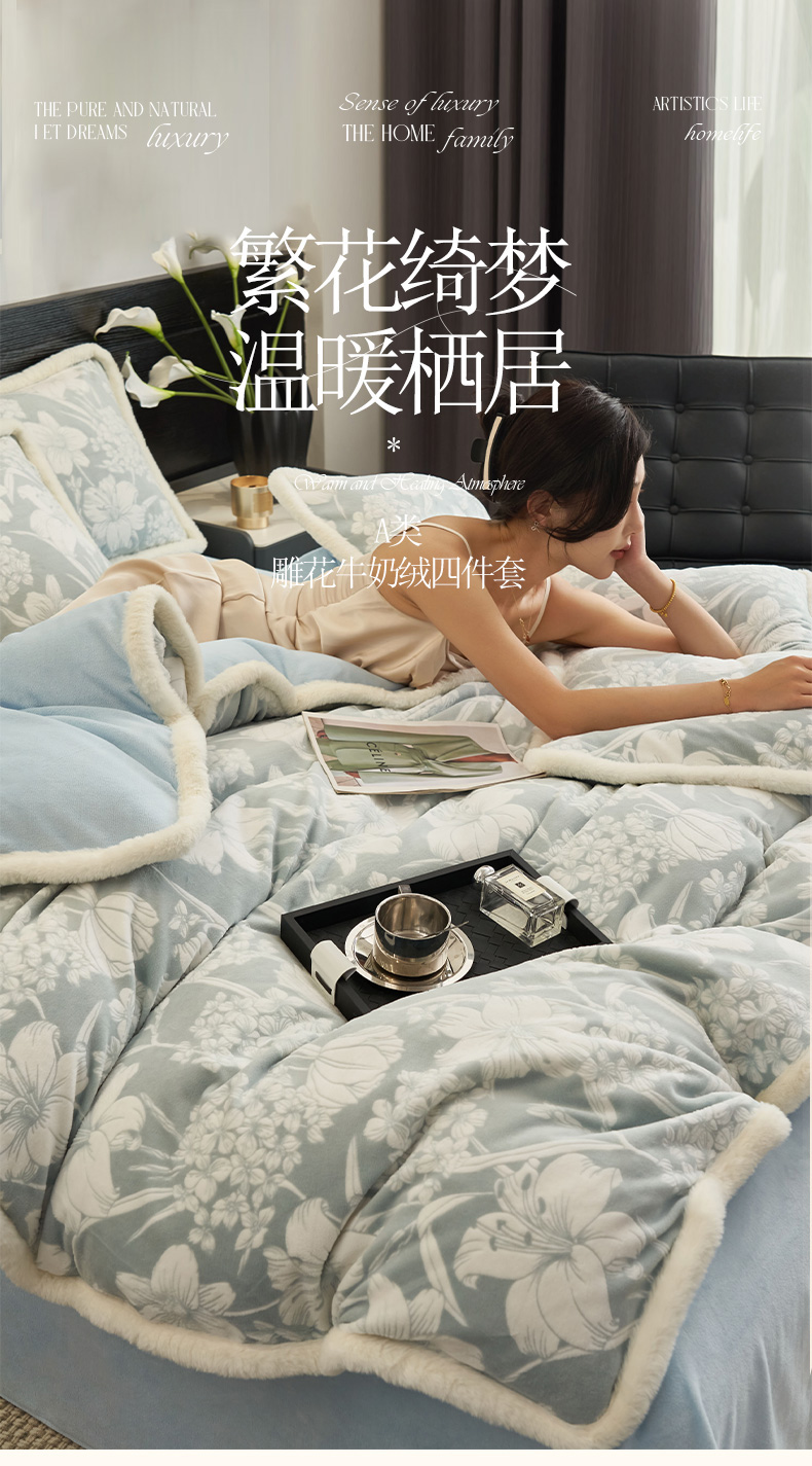 (总)金鹰 2025新款A类雕花牛奶绒烂花兔毛包边四件套,羽毛,波澜壮阔,繁花,蝴蝶梦,简爱,兰花,玫瑰物语,梦幻森林,清晨玫瑰,羽叶,仲夏晨歌