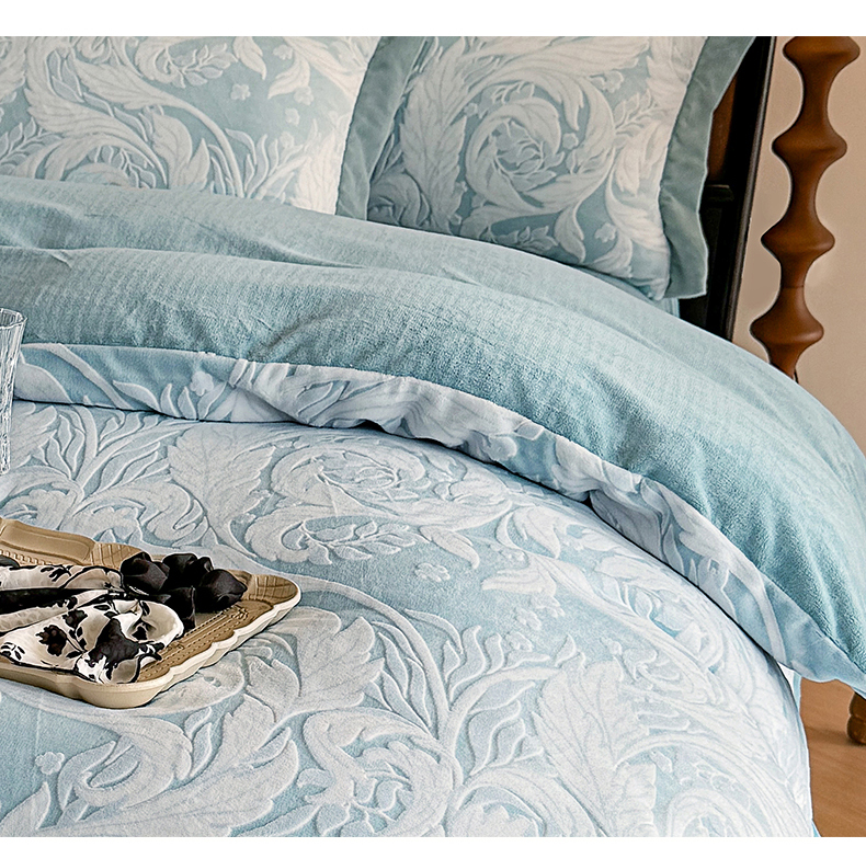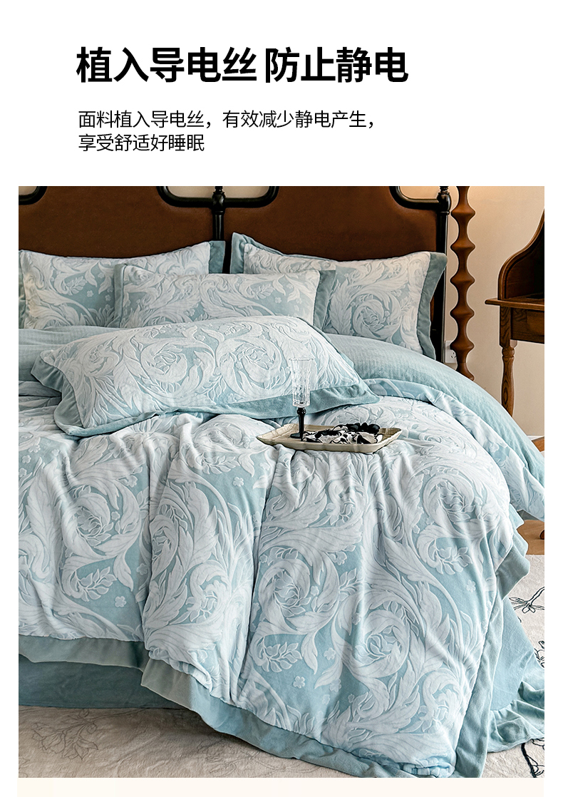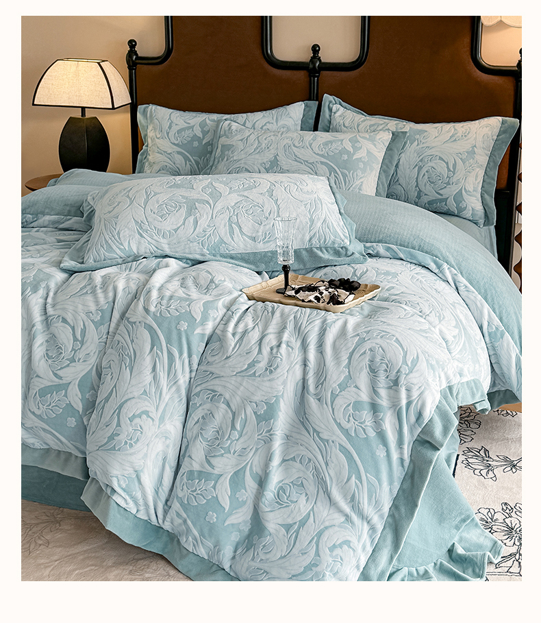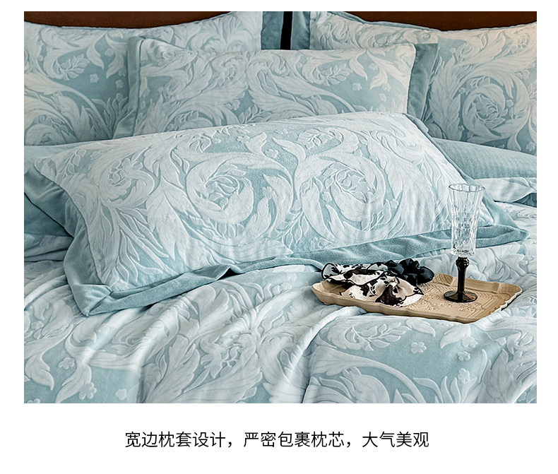 商品名称:慕晨 2025新款高克重雕花牛奶绒法式风大宽边拼角吊边床单四件套 图岚朵-柔雾蓝