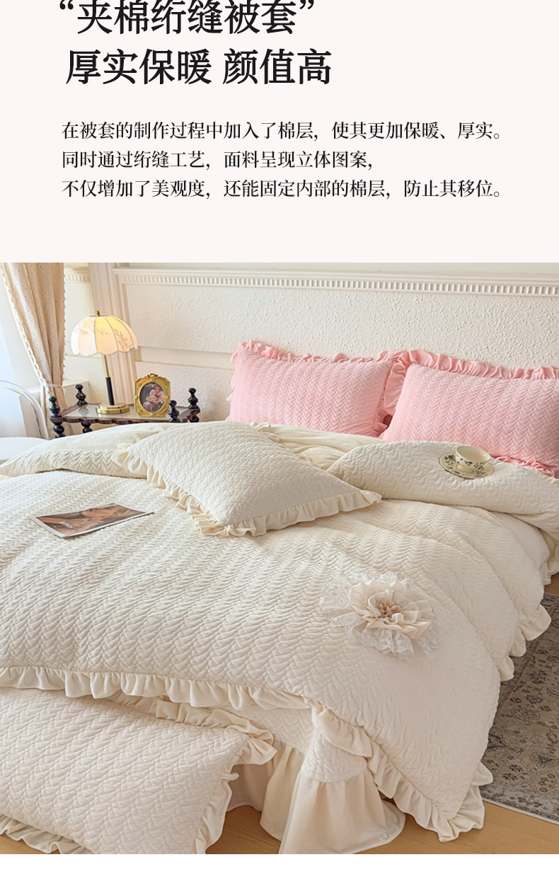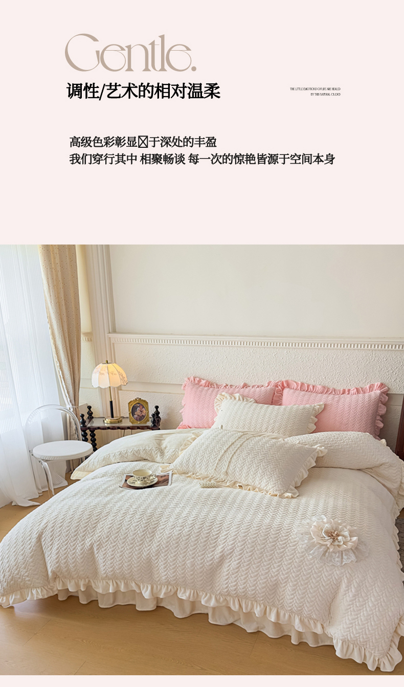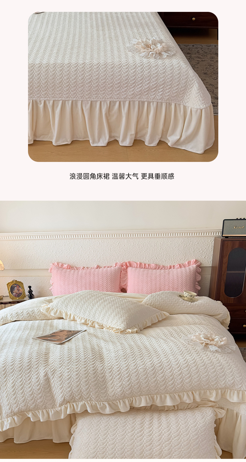 商品名称:乐嘉盈2025年新款纯色刺绣床裙款牛奶绒四件套-云栖 云栖-米白