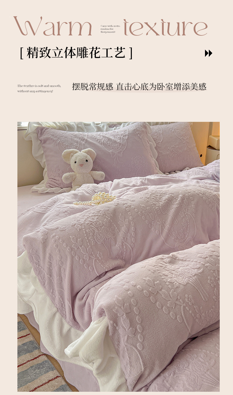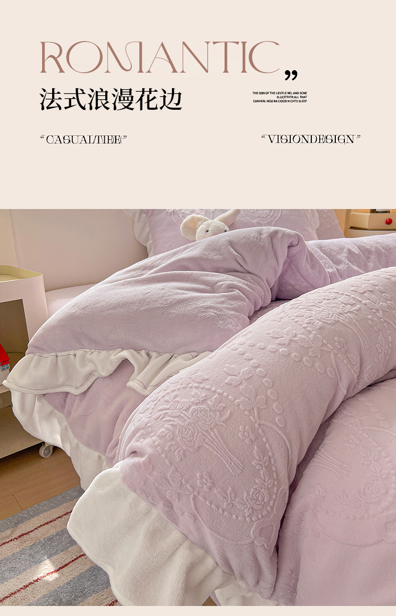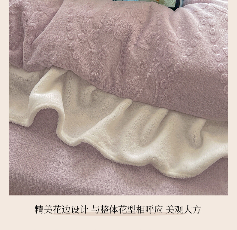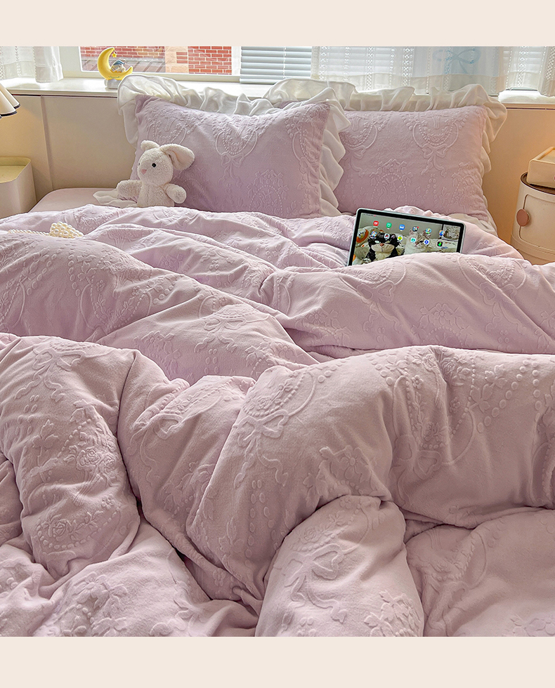 当前位置: 91家纺网 > 商品网购 > 床品套件 > 四件套 > 牛奶绒四件套 > 亿梵家居 2025新款法式花边款A类5D牛奶绒立体雕花四件套(提供买家秀) 花边款 手捧花-新媚紫