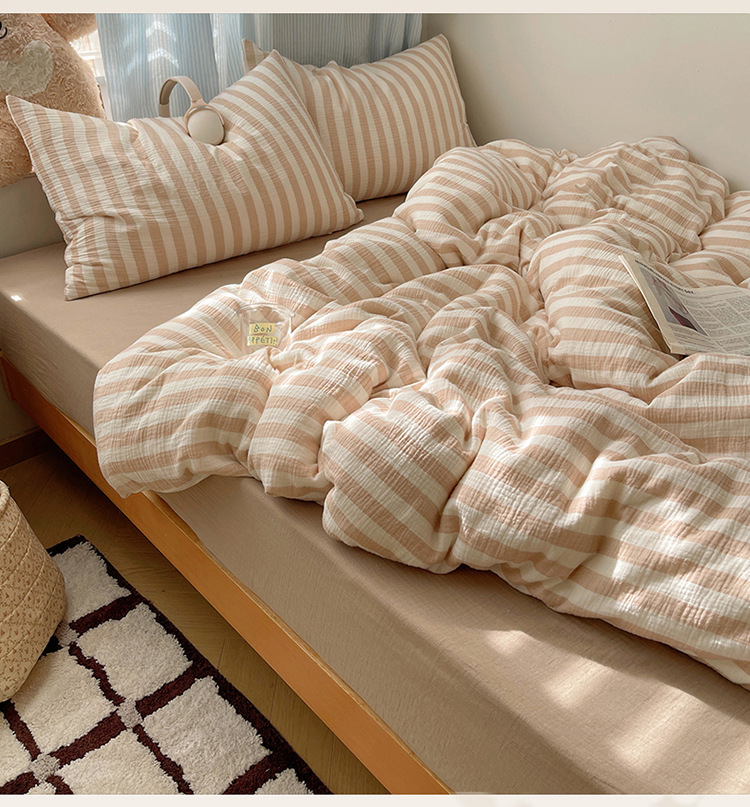 良品汇馆 2025【全棉色织皱皱纱四件套】条纹A类双层纱套件民宿柔软床品 杼影-咖纸蓝