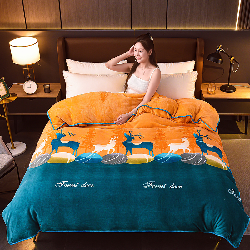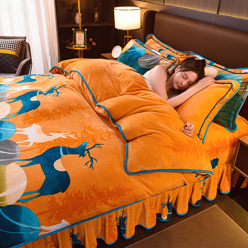 商品名称:绘萱2025新品爆款8斤包边印花牛奶绒四件套床裙款法莱绒金貂貂狐 森林鹿