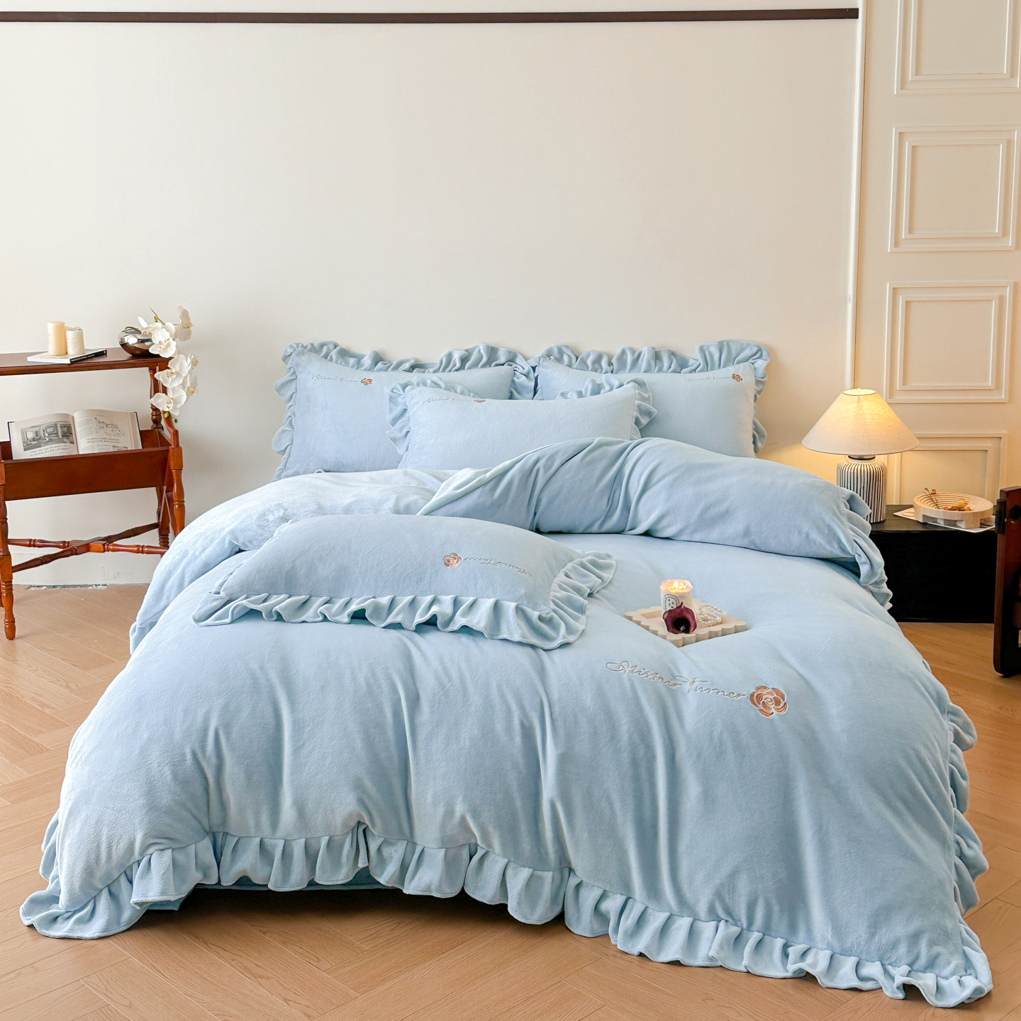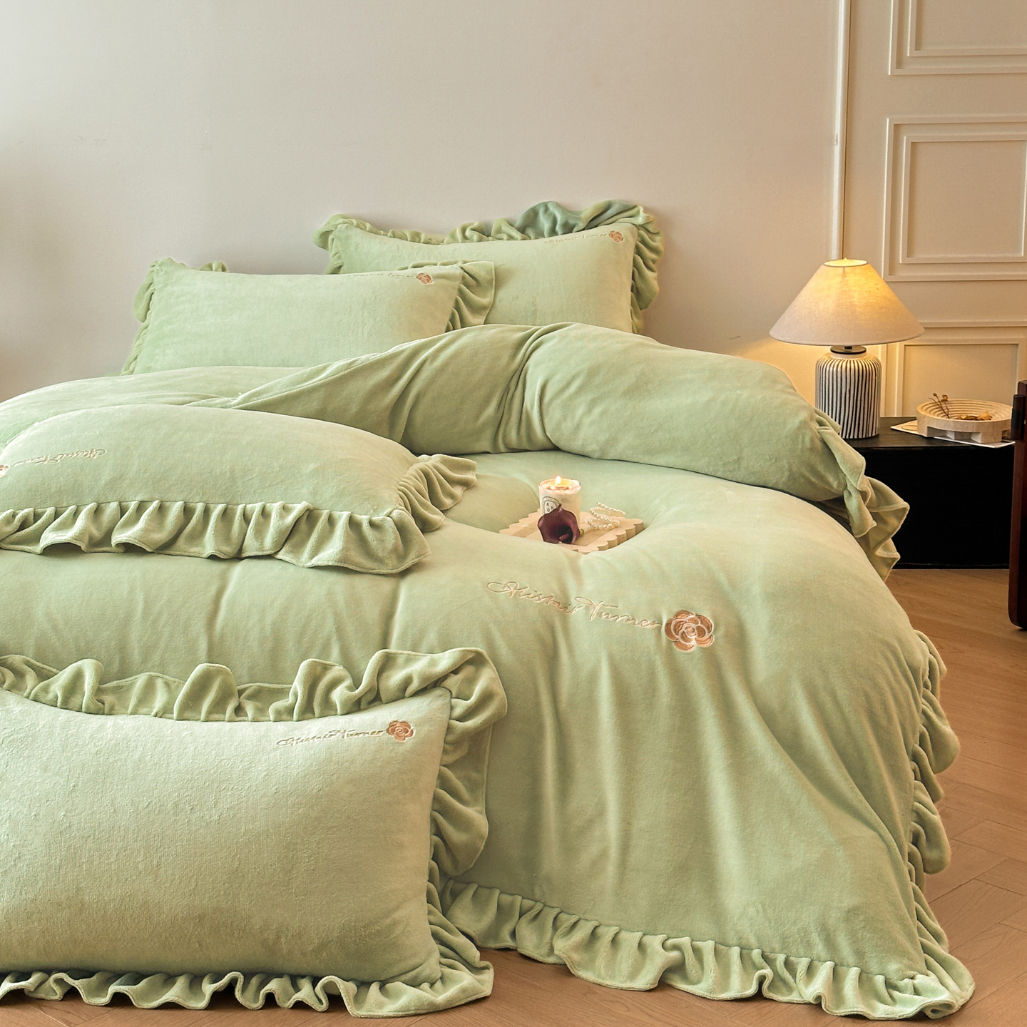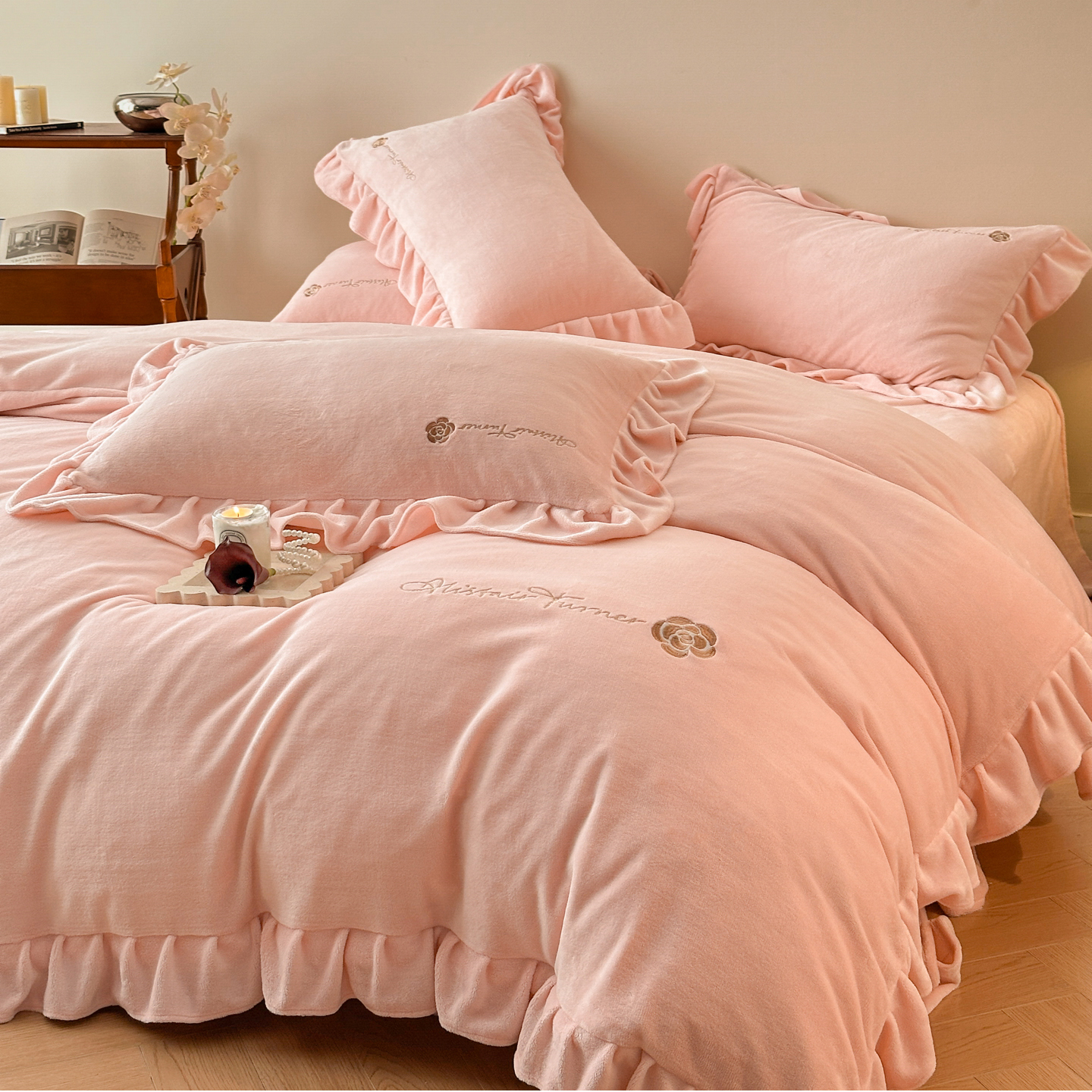 商品名称:花满路 2025新款亲肤舒适绒四件套-山茶花系列 山茶花-灰