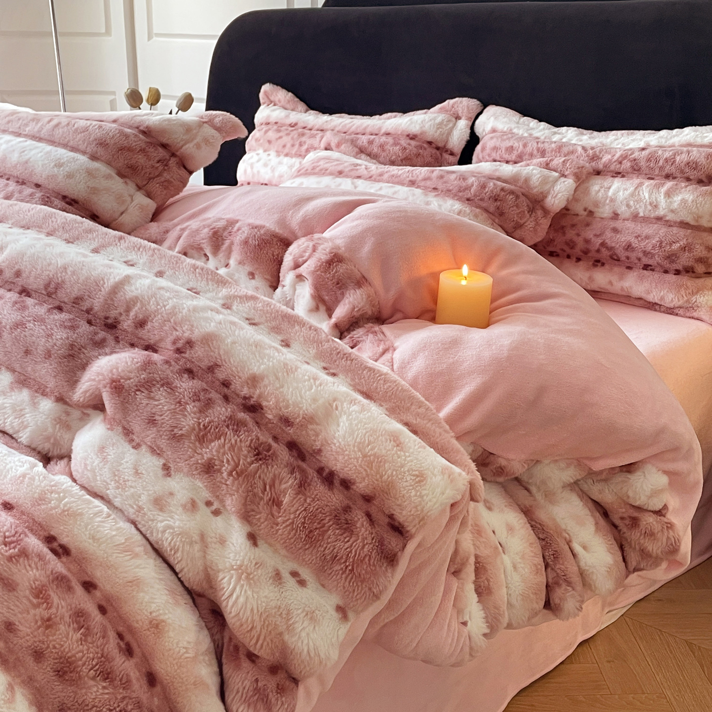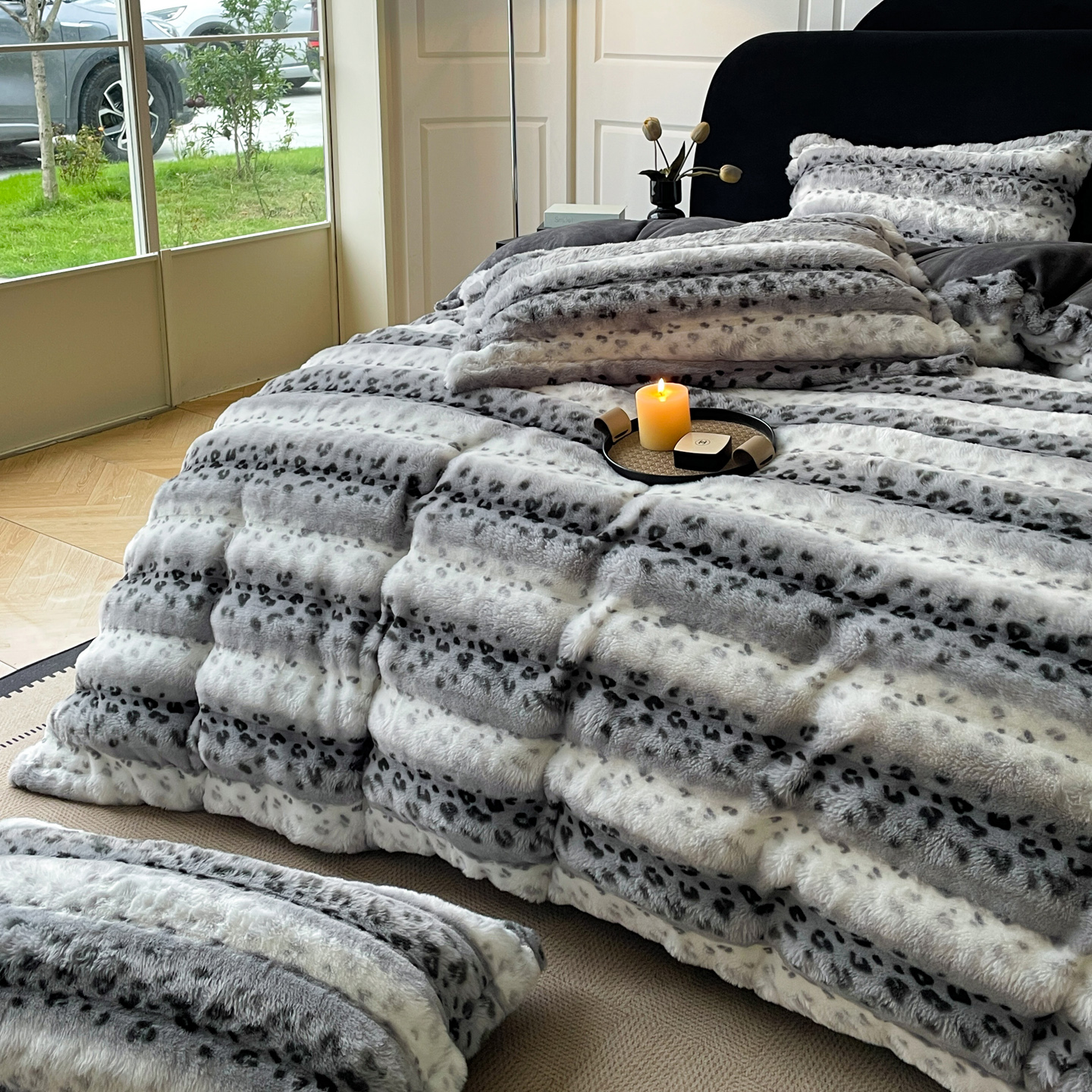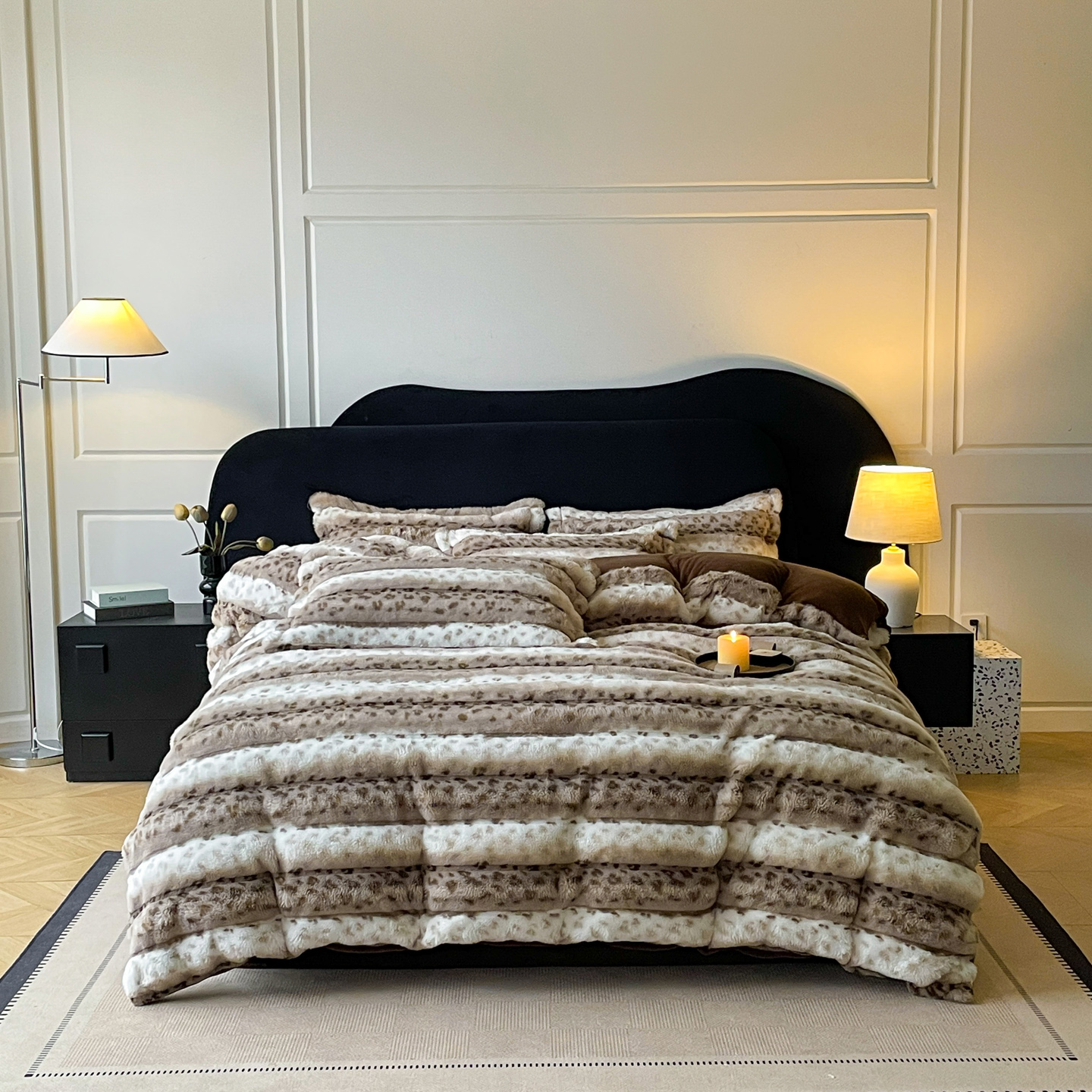 商品名称:典曼家纺 2025新款加厚保暖兔绒四件套-豹纹系列 豹纹-灰条