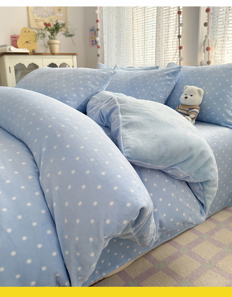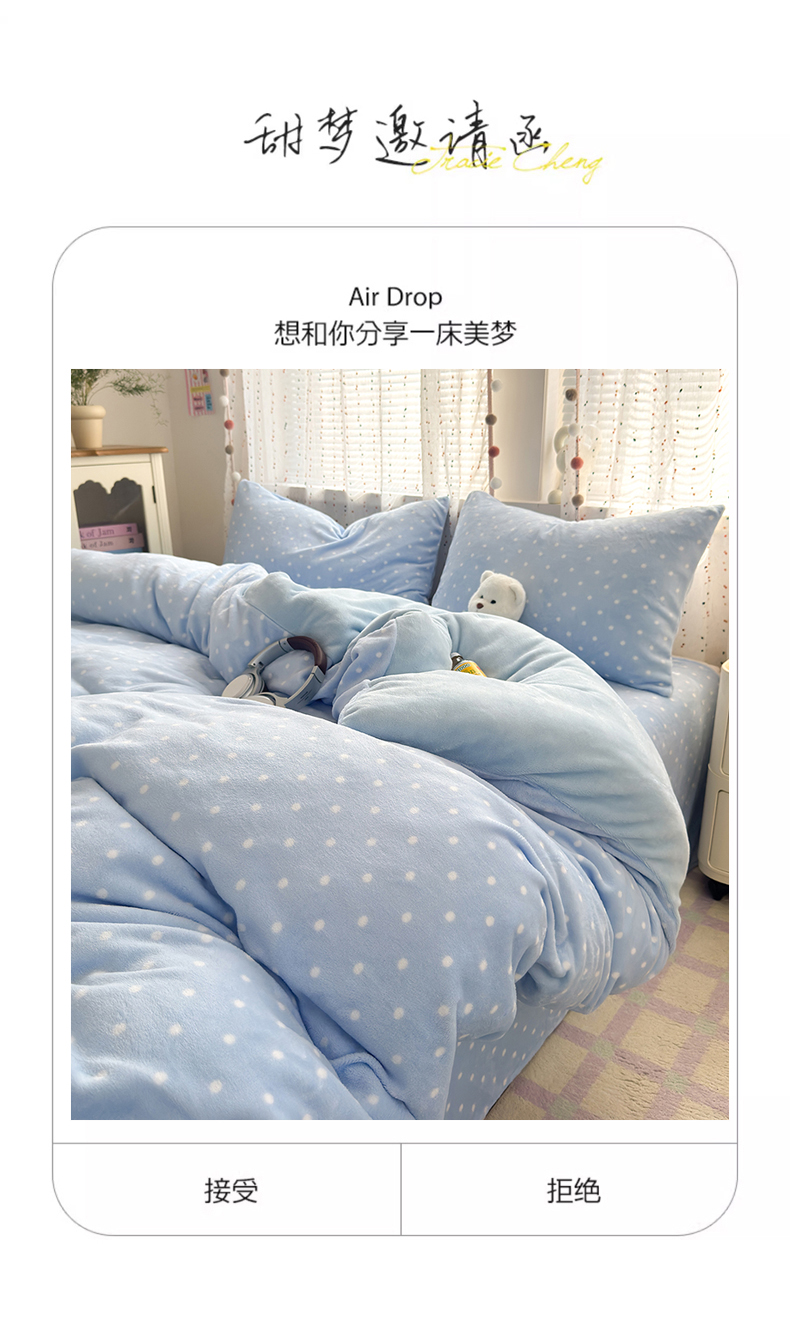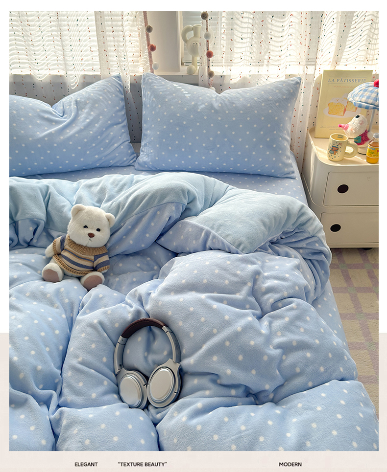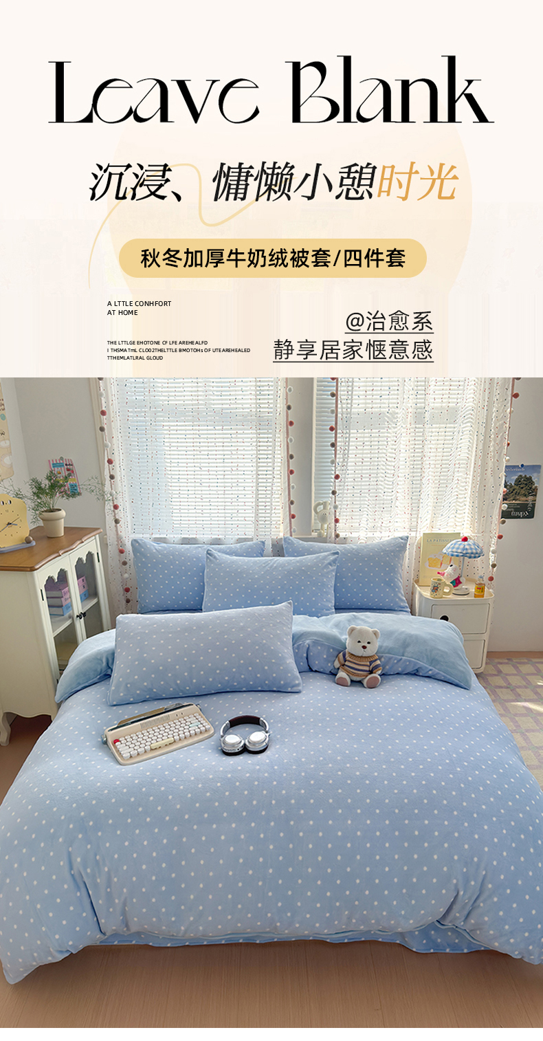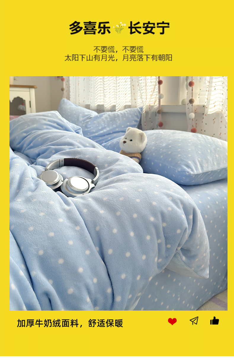 当前位置: 91家纺网 > 商品网购 > 床品套件 > 四件套 > 牛奶绒四件套 > 沐芷 2025 高克重加厚A类牛奶绒四件套珊瑚绒卡通简约三件套 【绒】爱情蓝波点
