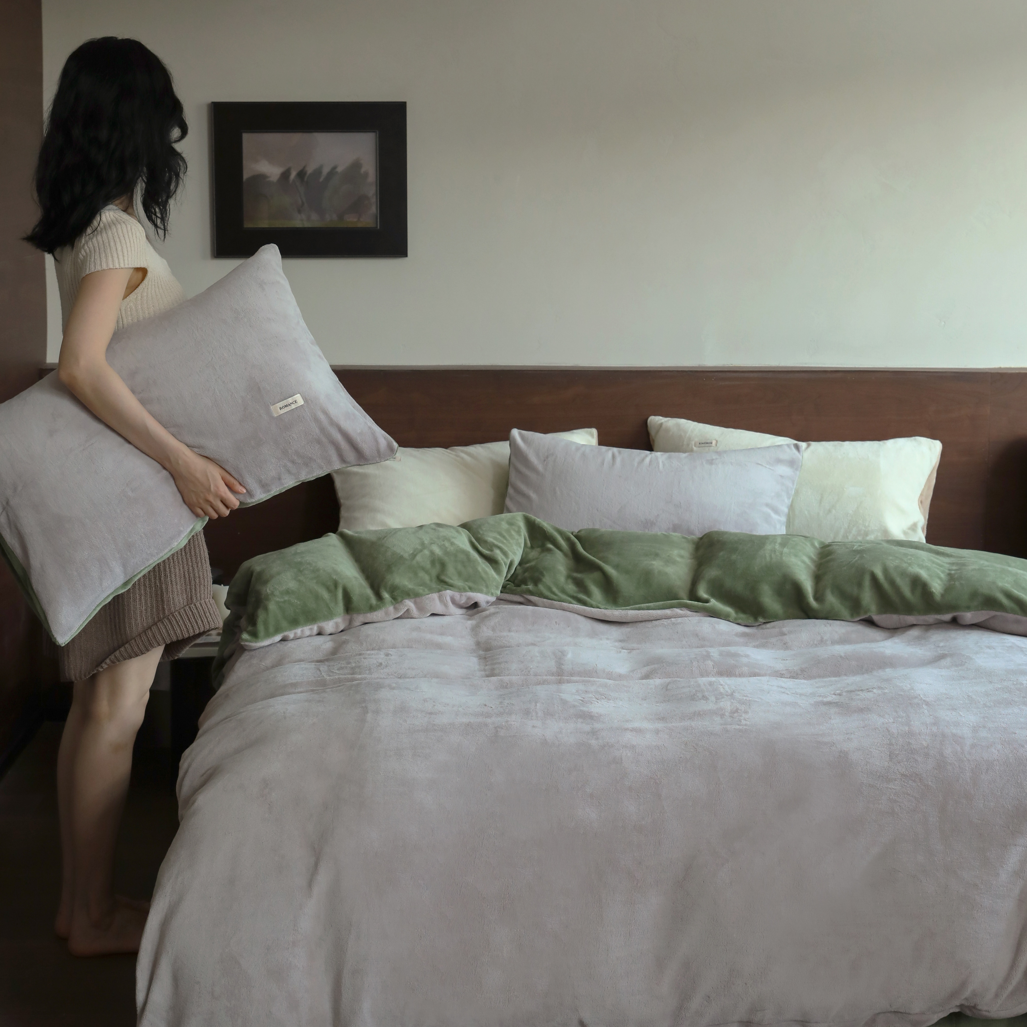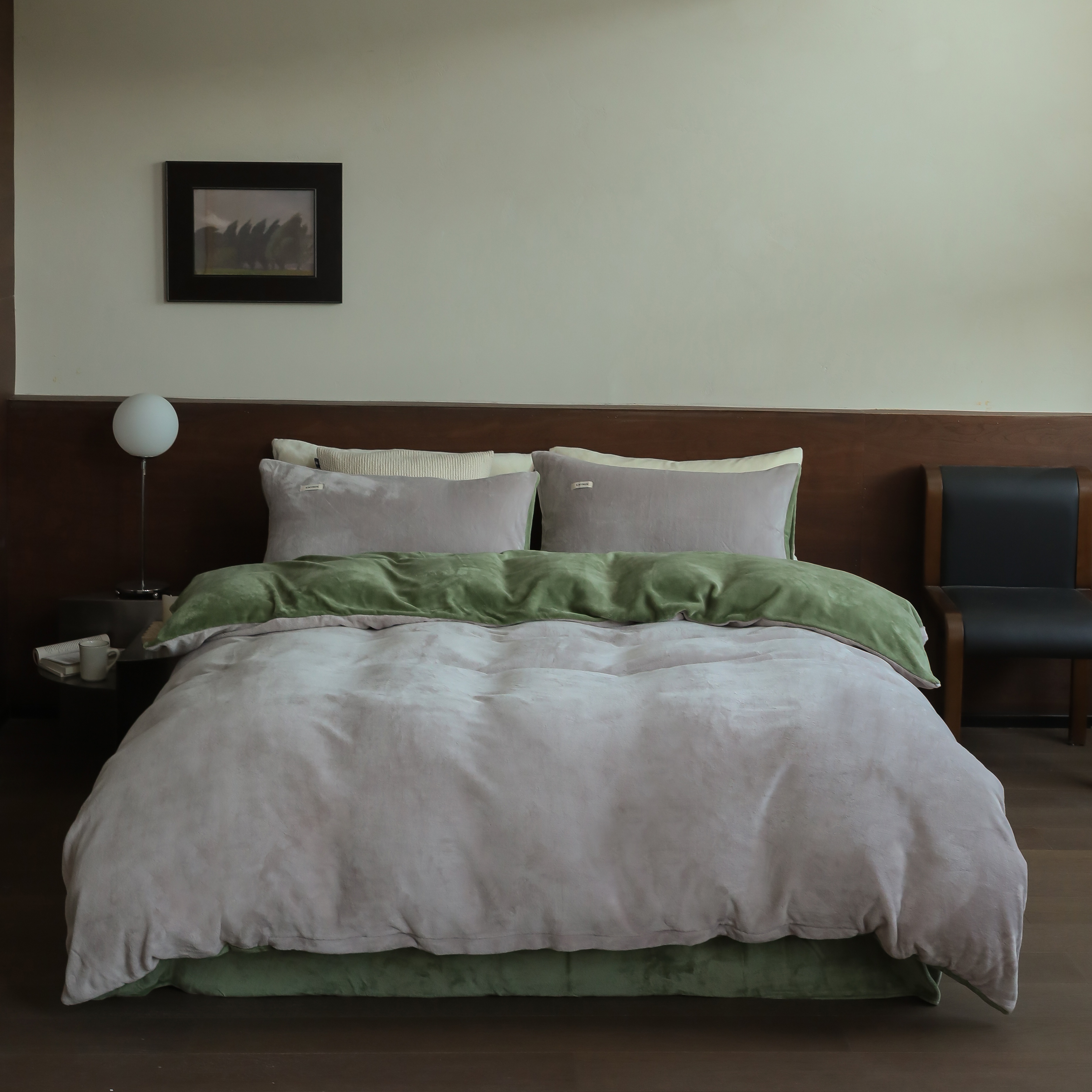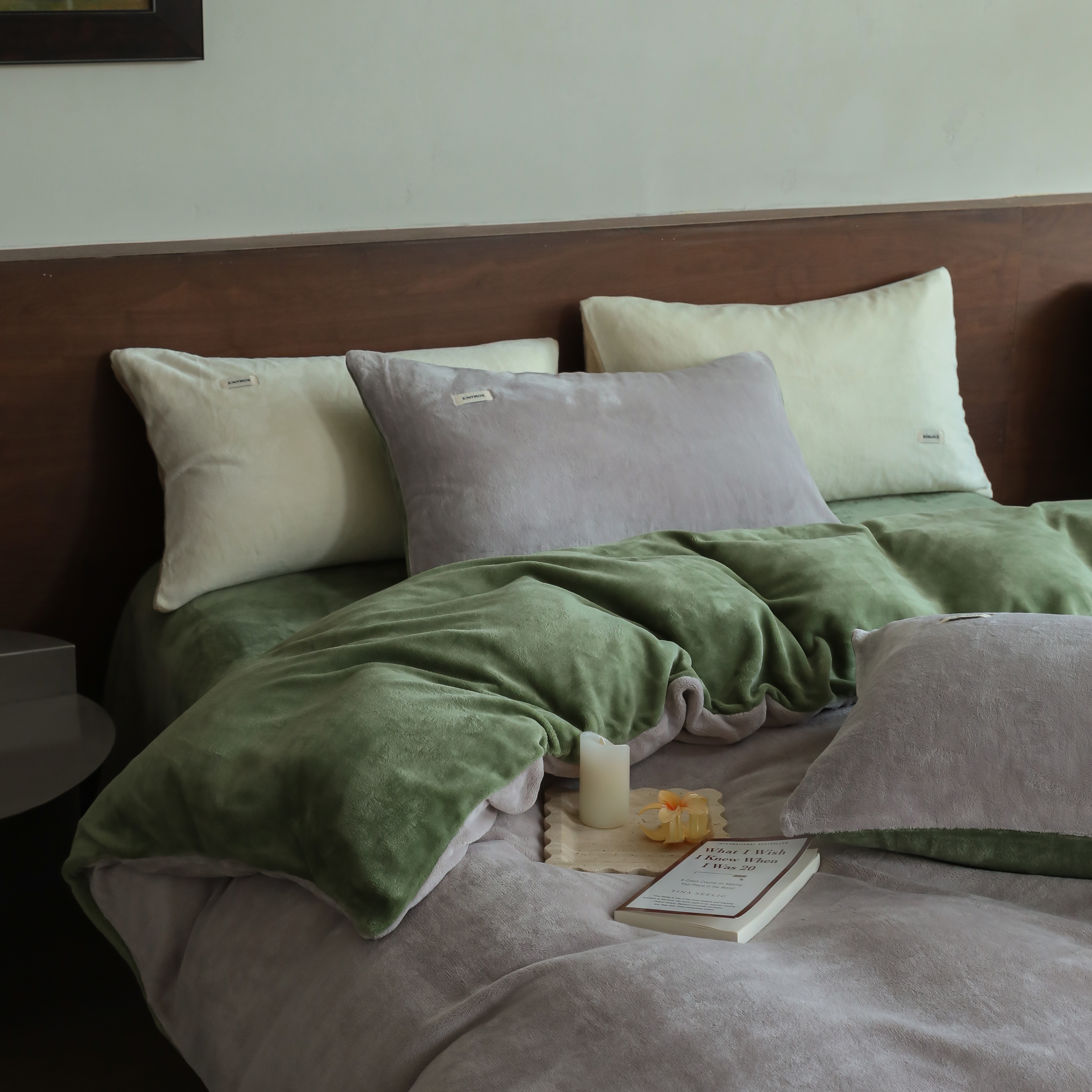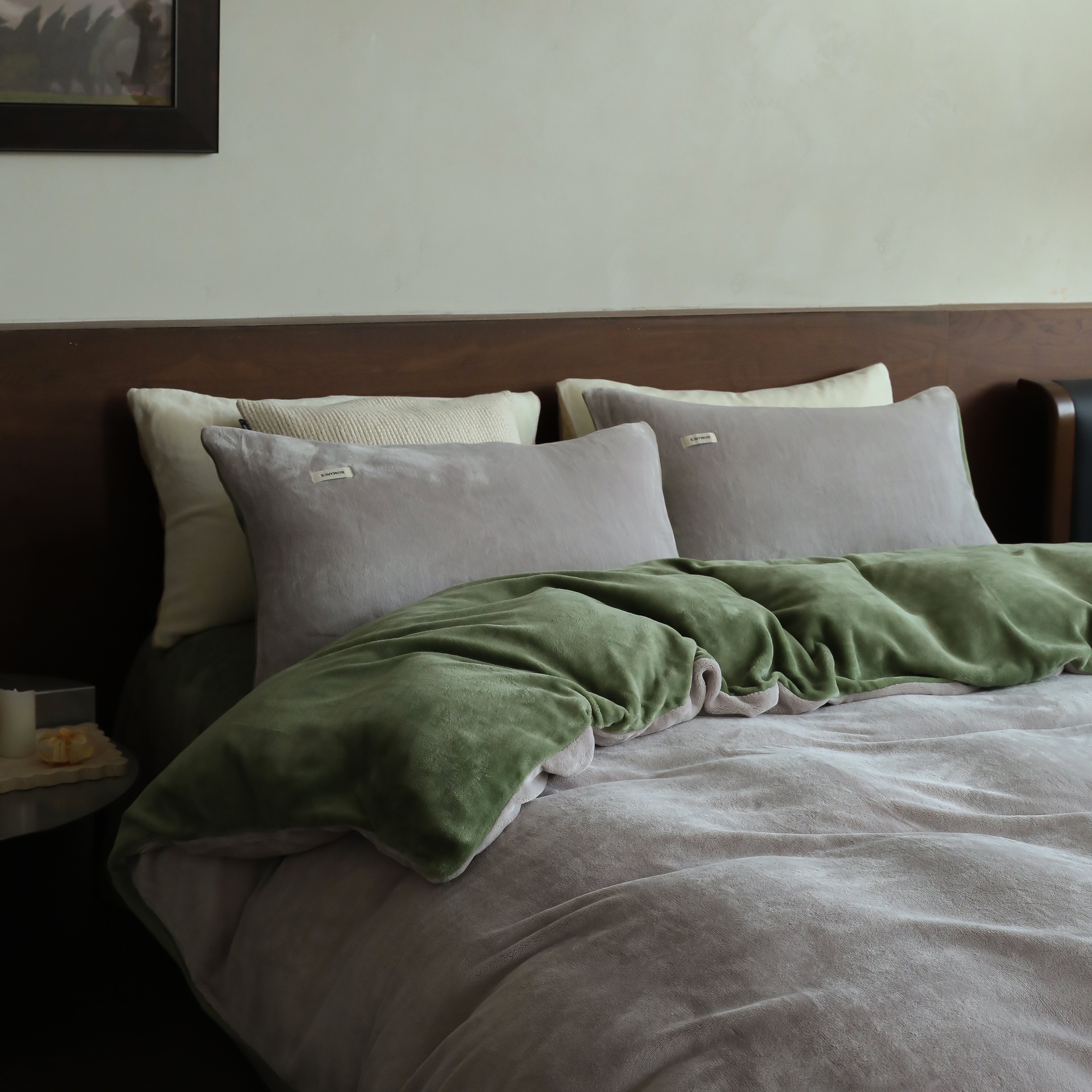 时光里 2025新款230克纯色简约双拼牛奶绒四件套套件 星际灰拼橄榄绿