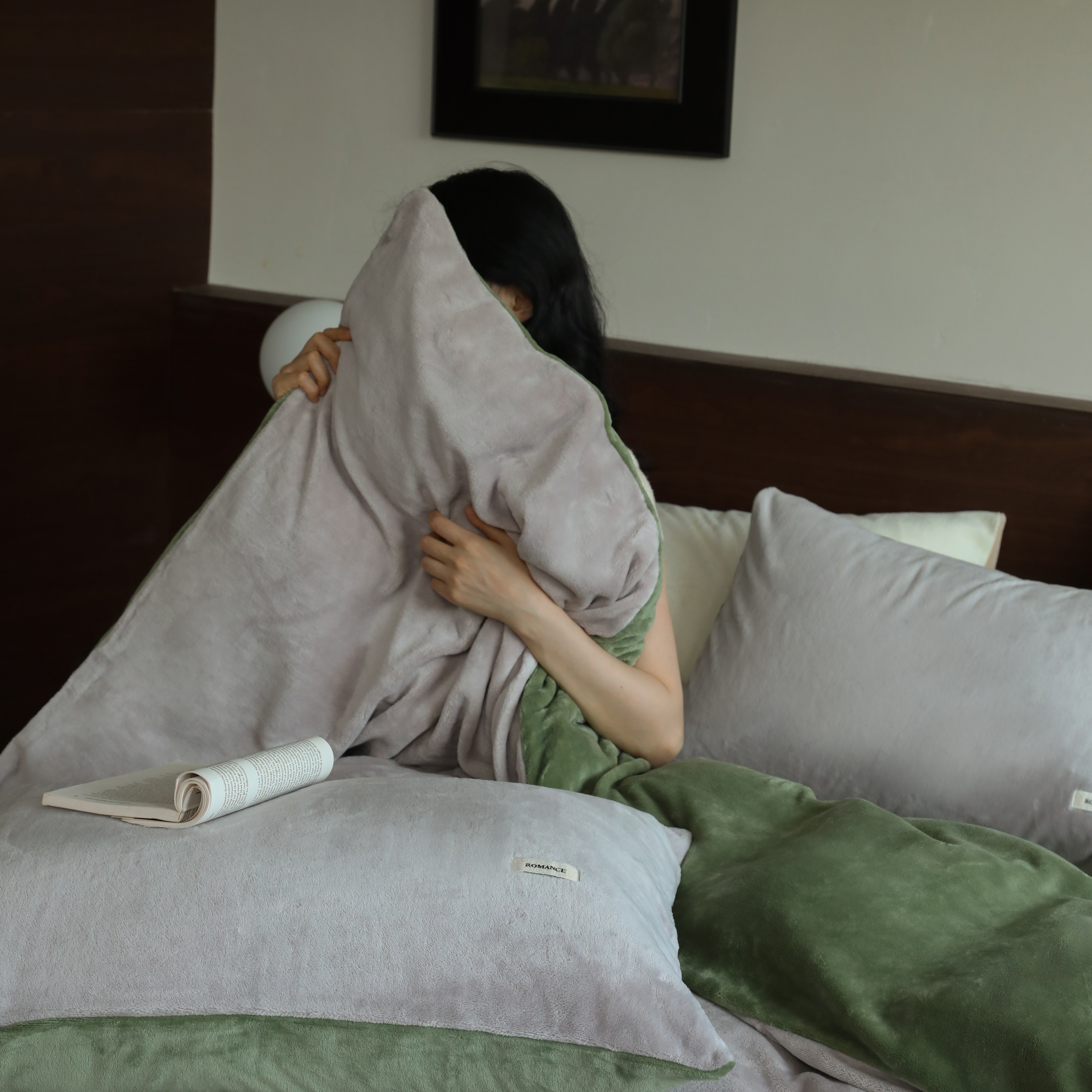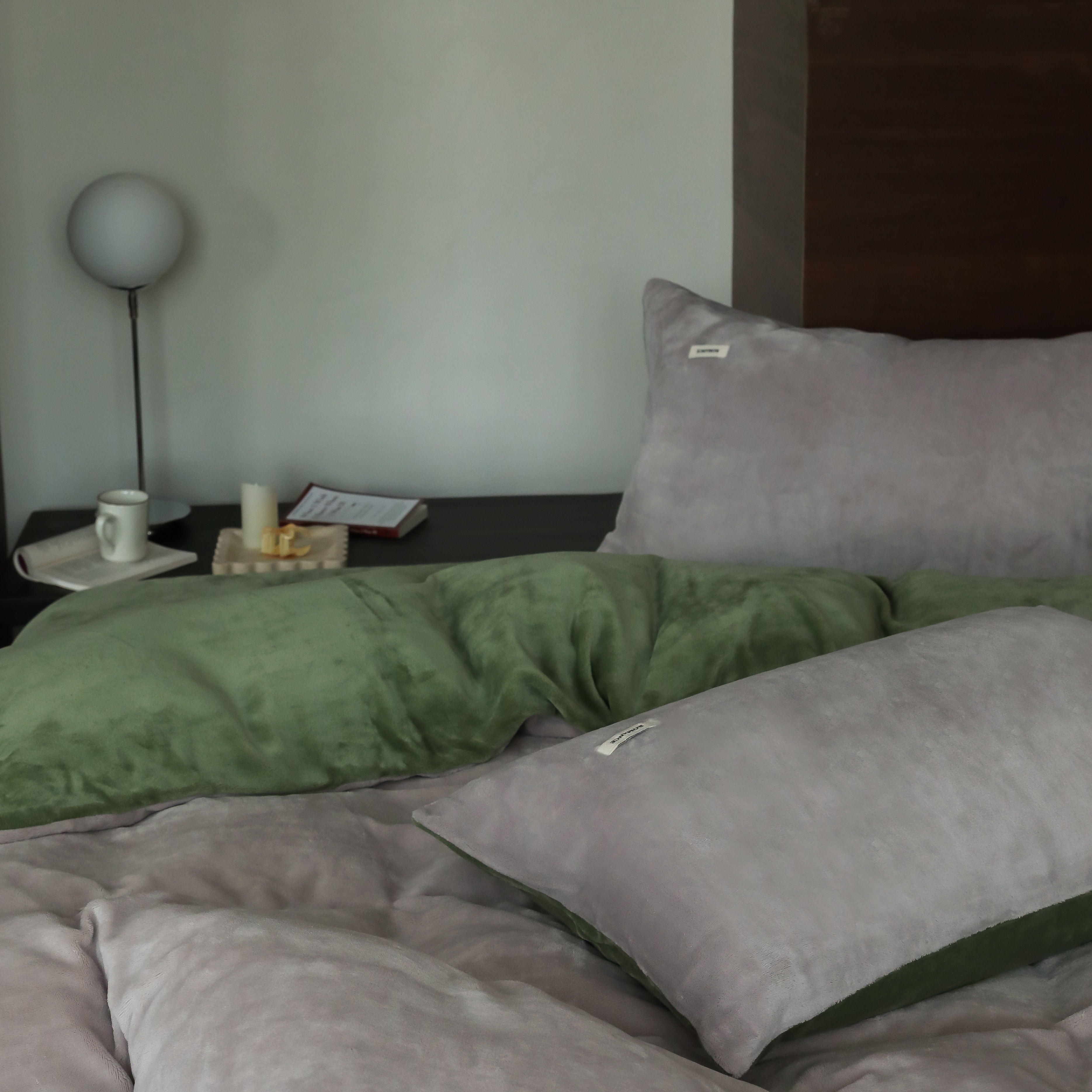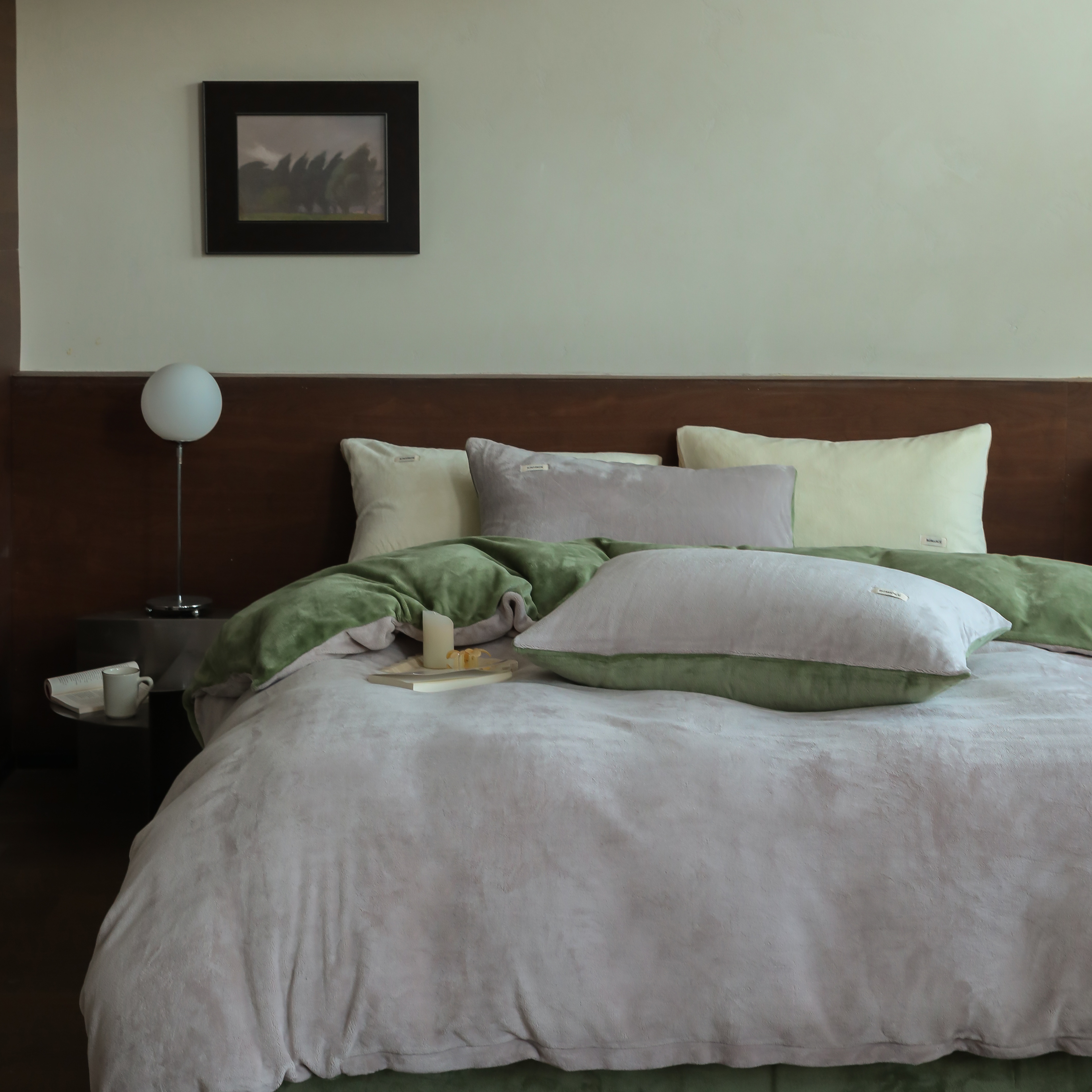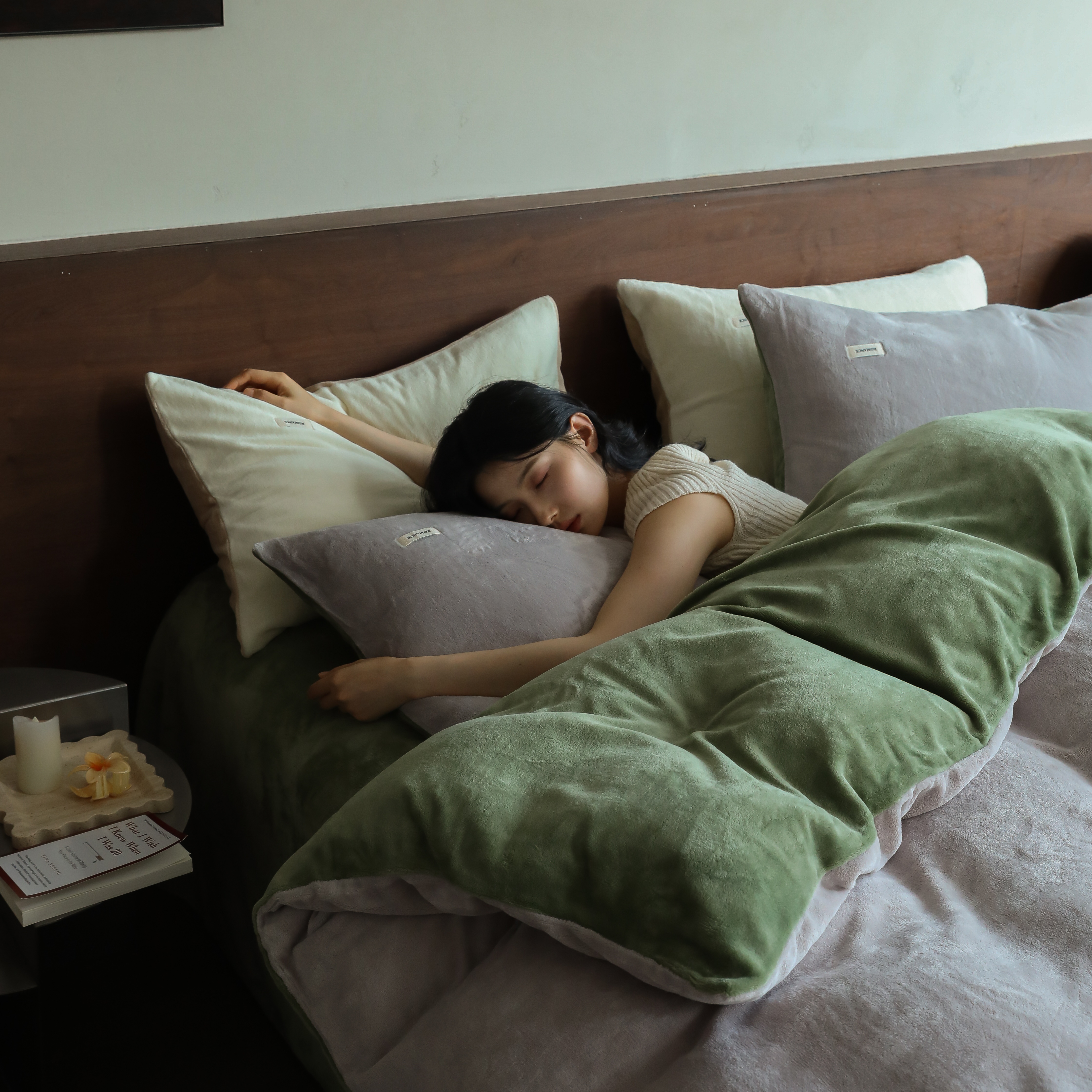 时光里 2025新款230克纯色简约双拼牛奶绒四件套套件 星际灰拼橄榄绿