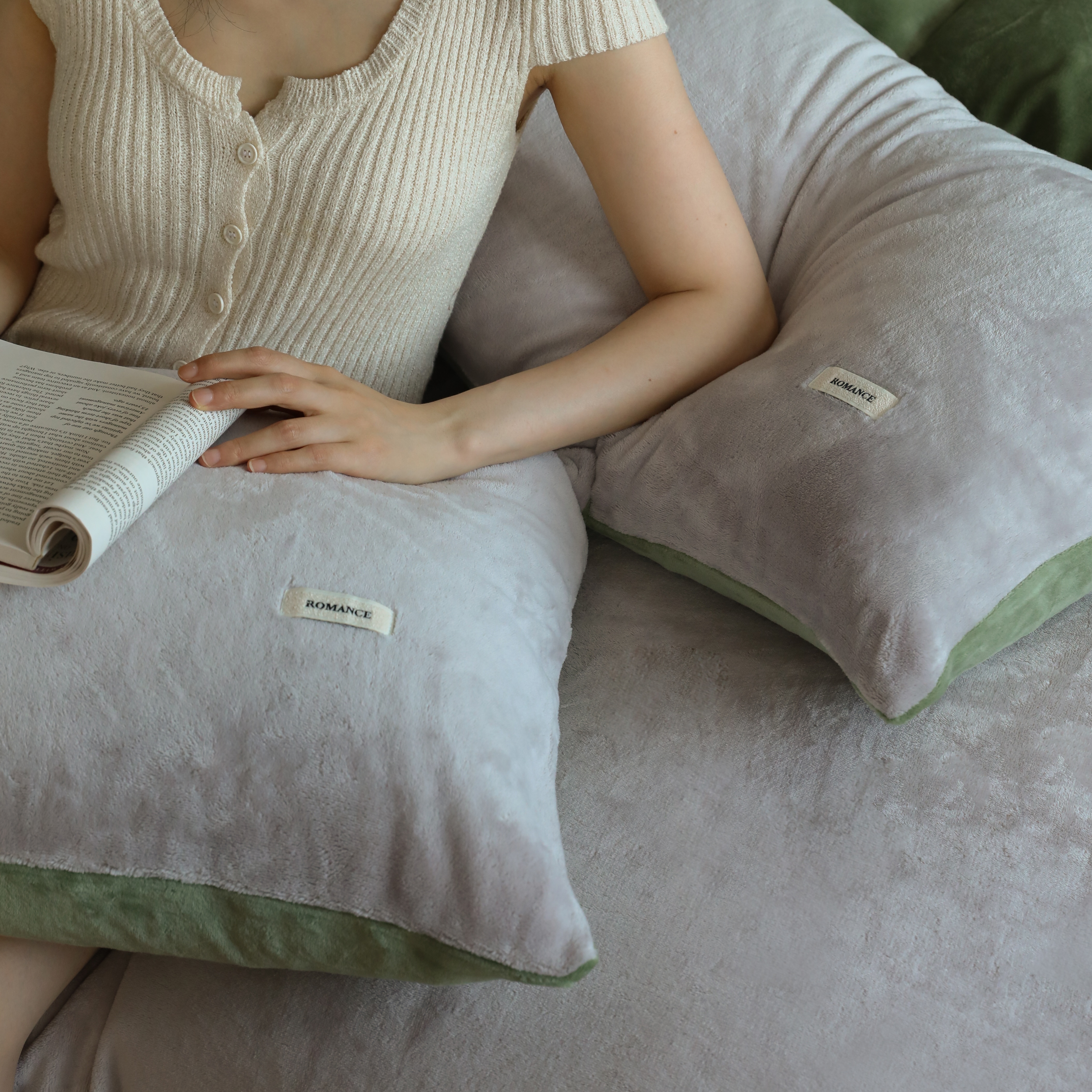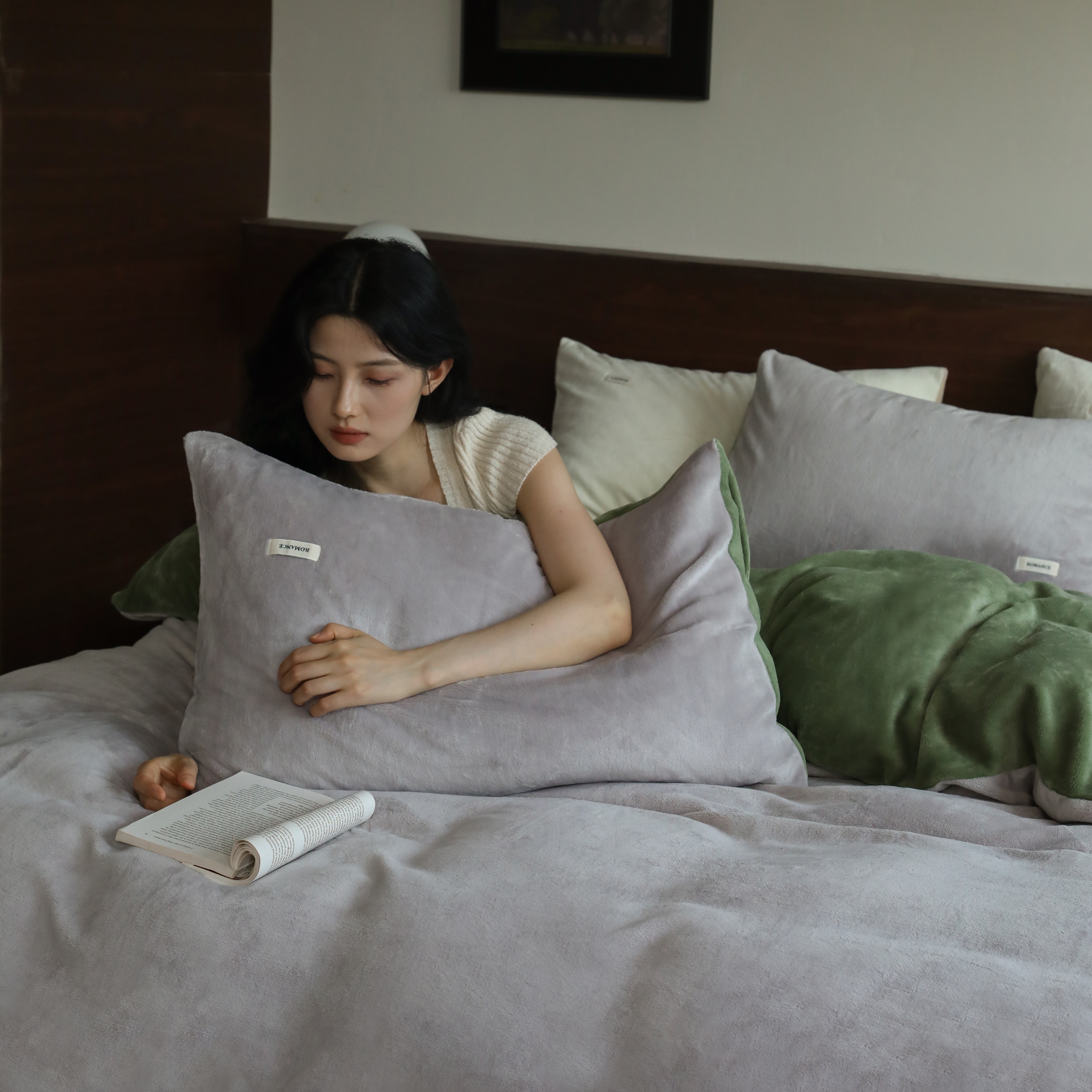 商品名称:时光里 2025新款230克纯色简约双拼牛奶绒四件套套件 星际灰拼橄榄绿
