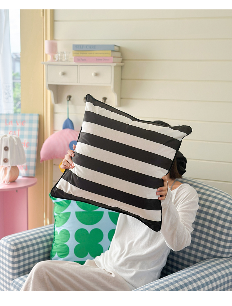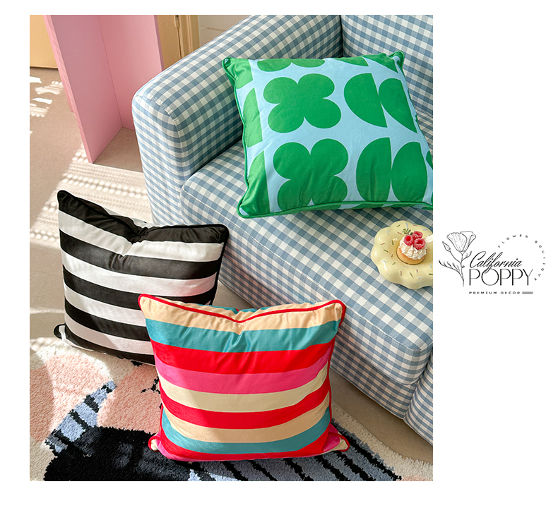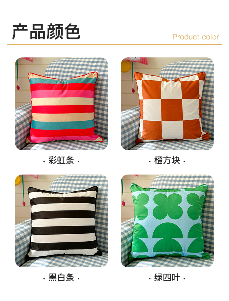(总)美茉家居 2025新款荷兰绒丝绒炫彩糖果抱枕,彩虹条,橙方块,黑白条,绿四叶