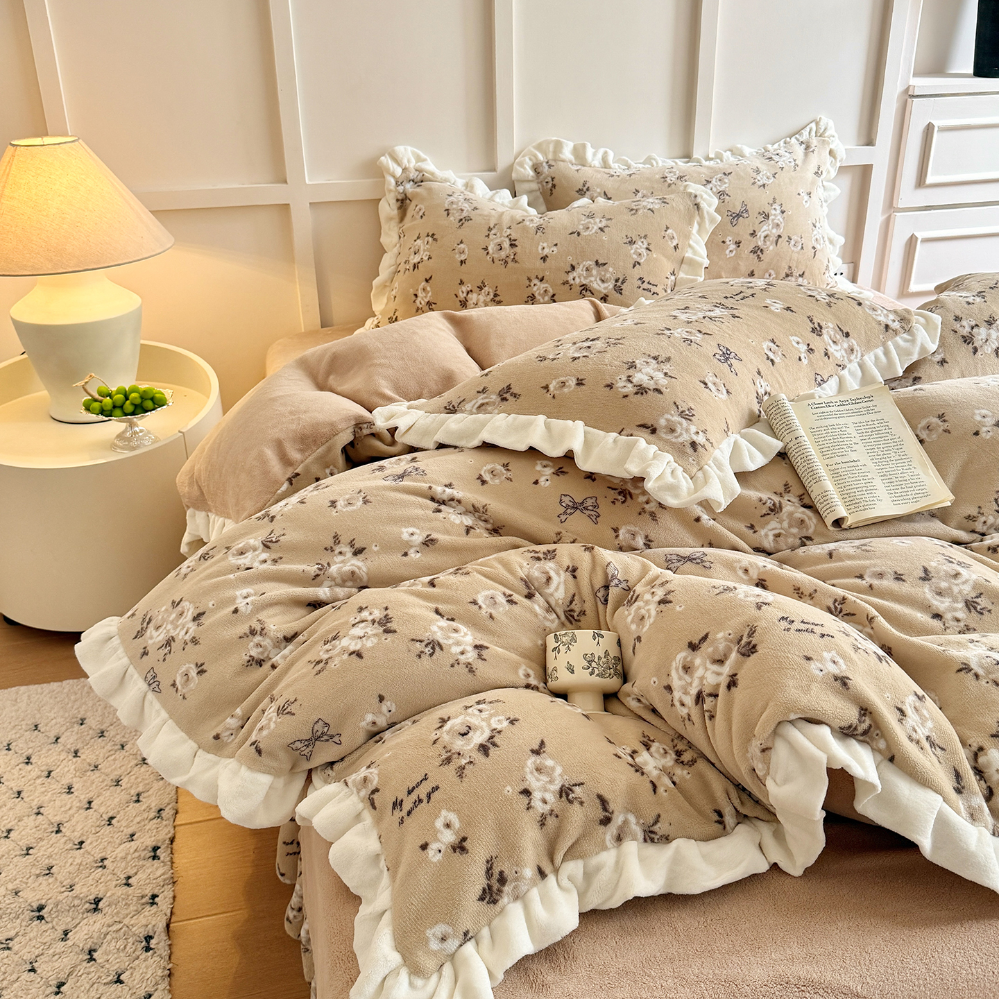 当前位置: 91家纺网 > 商品网购 > 床品套件 > 四件套 > 牛奶绒四件套 > 潘朵拉家纺 2025新款法式牛奶绒双层花边四件套 南梦