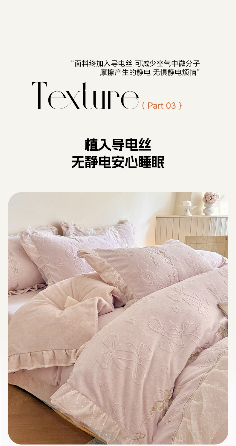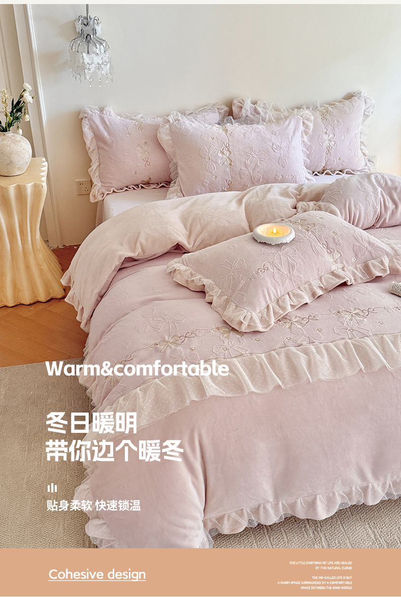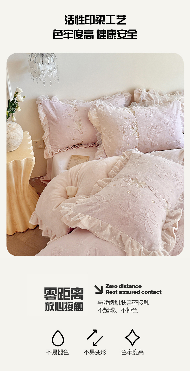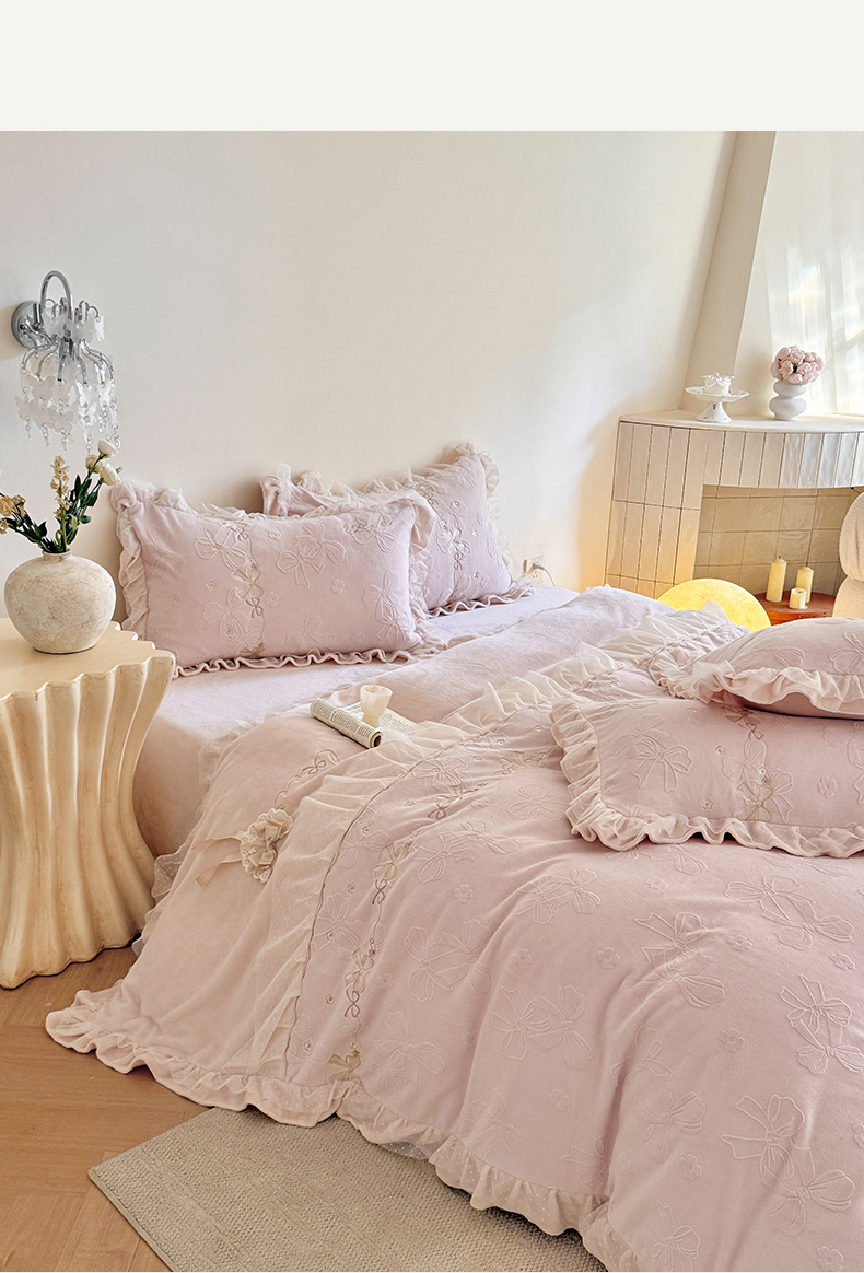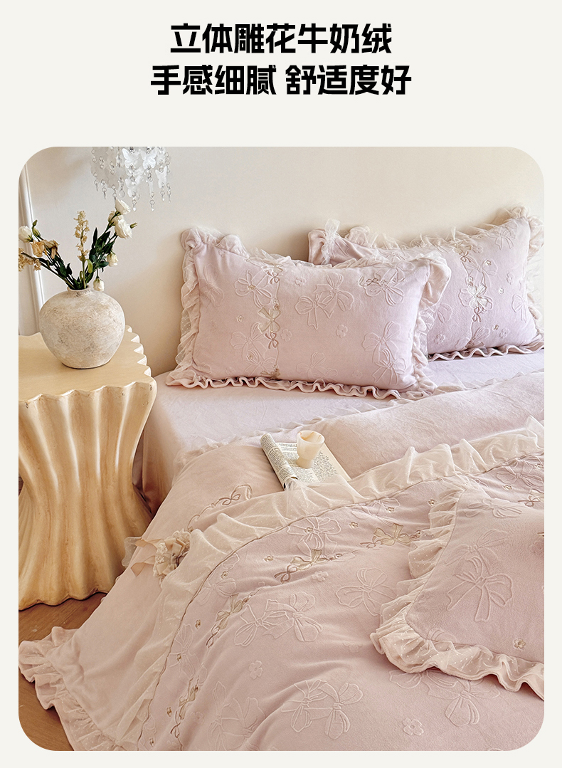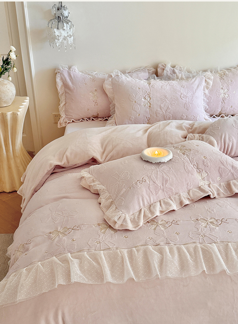 商品名称:雅高家居 2025新款精致刺绣双层蕾丝花边公主风高克重全消光牛奶绒四件套 邂逅-浅粉