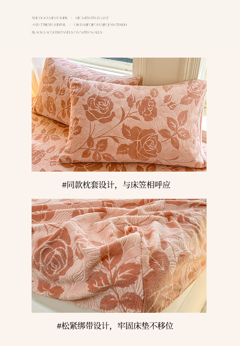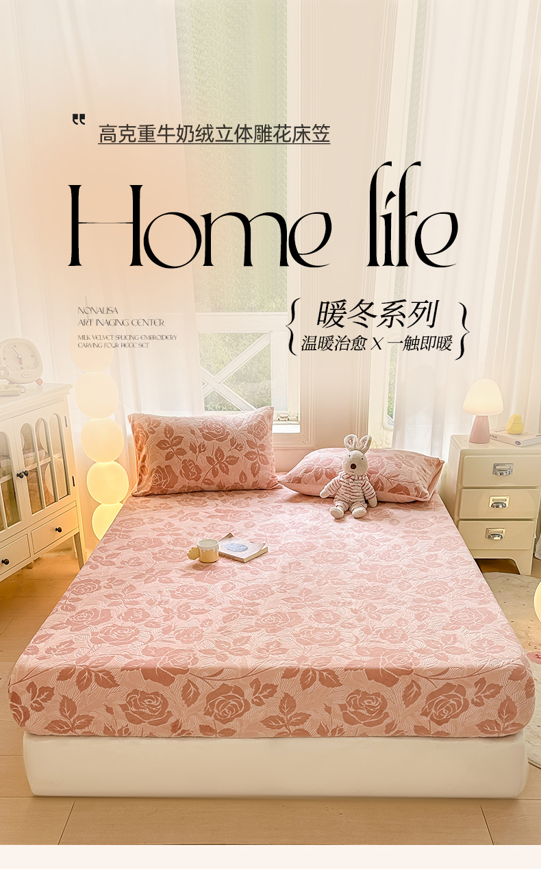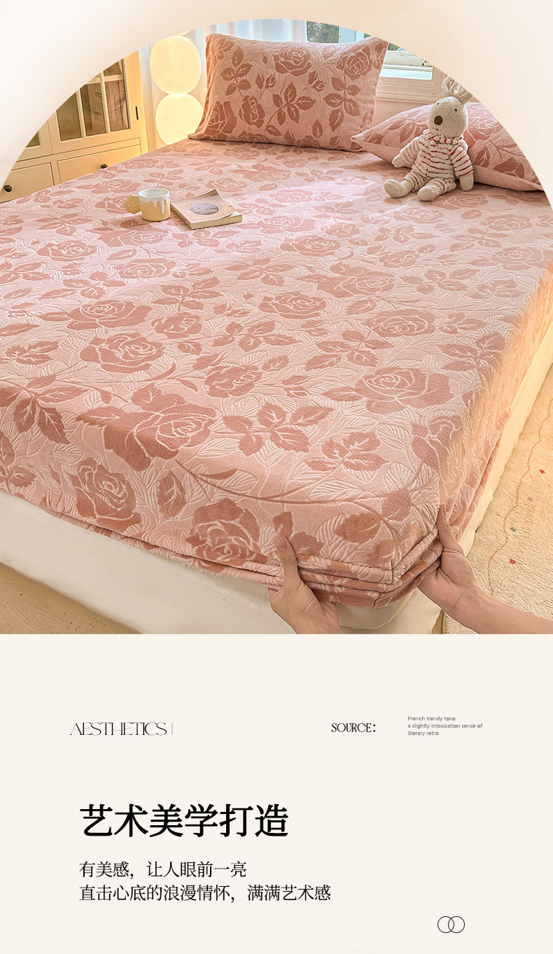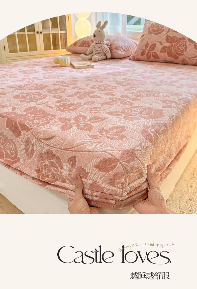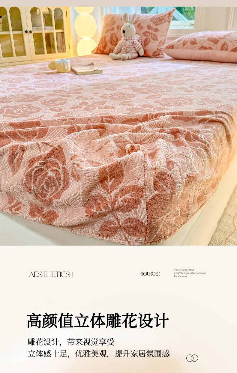 • 91家纺网 家纺一手货源 找家纺 灰鲸 2025新款立体雕花牛奶绒床笠 爱意-粉